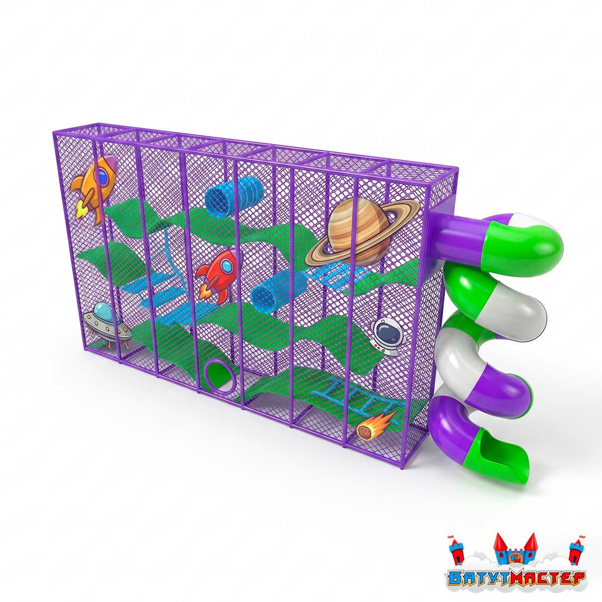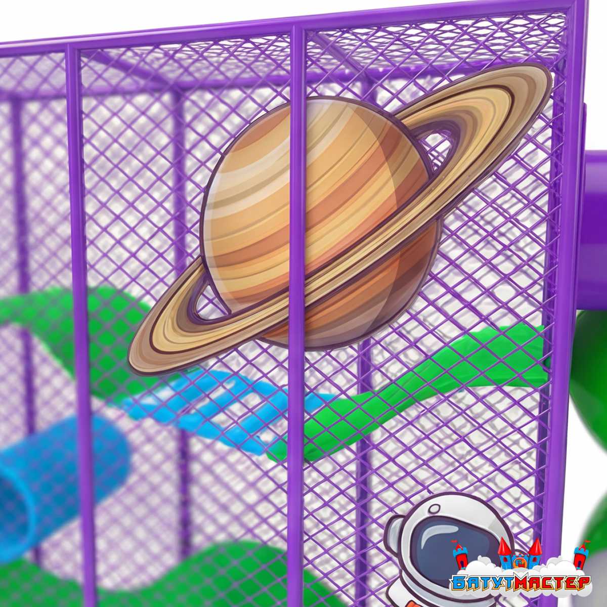Добро пожаловать на борт! Представьте: ребёнок входит в зал — и перед ним открывается целая вселенная. Планета Сатурн с кольцами, летящие ракеты, астронавты и метеориты смотрят со всех сторон, а впереди — 3 уровня платформ, тоннелей и горок, зовущих в самое настоящее межгалактическое путешествие. Лабиринт «В гостях у Галактики» — это не просто игровое оборудование. Это готовый аттракцион, который делает ваш бизнес магнитом для семей с детьми.