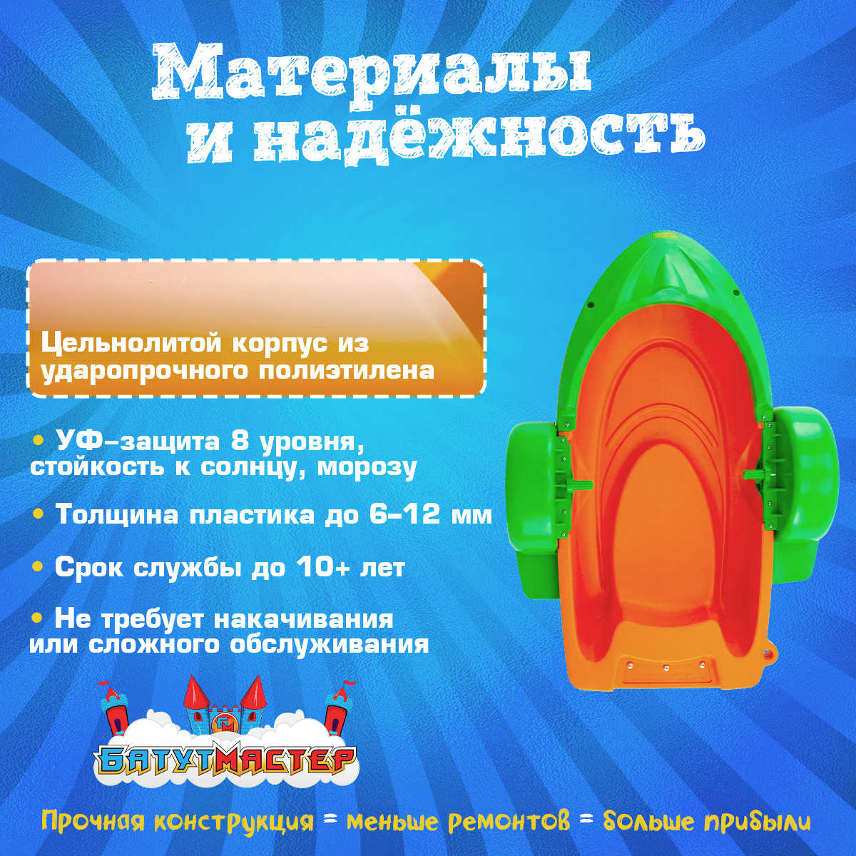 Цельнолитой корпус из ударопрочного полиэтилена — не деформируется при столкновениях, не трескается при интенсивной эксплуатации