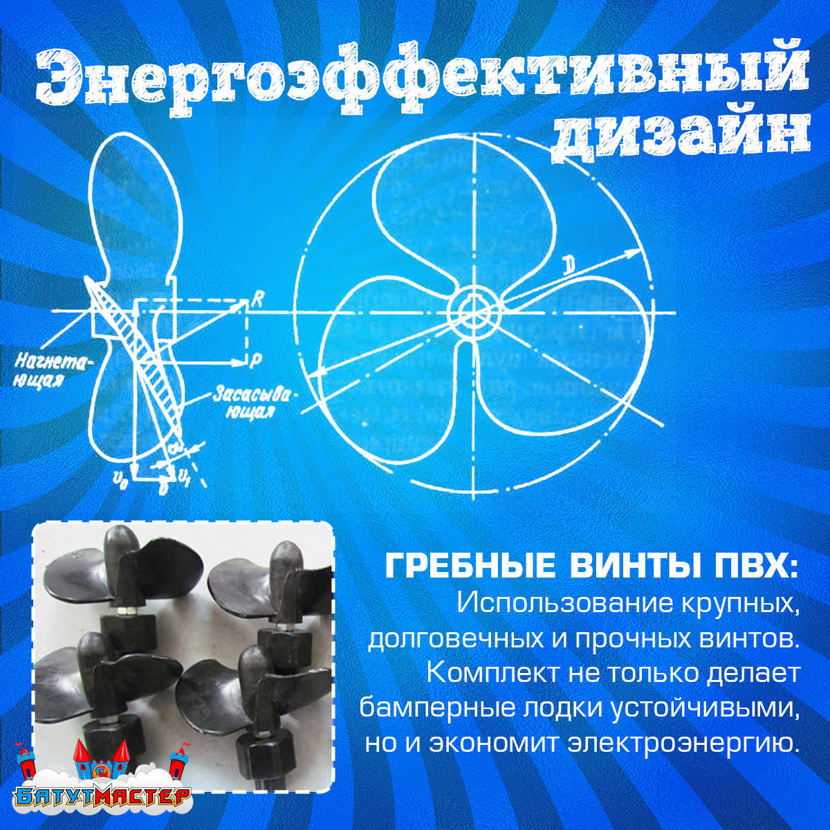 Лодка оснащена крупными, долговечными гребными винтами из ПВХ с энергоэффективным дизайном лопастей.