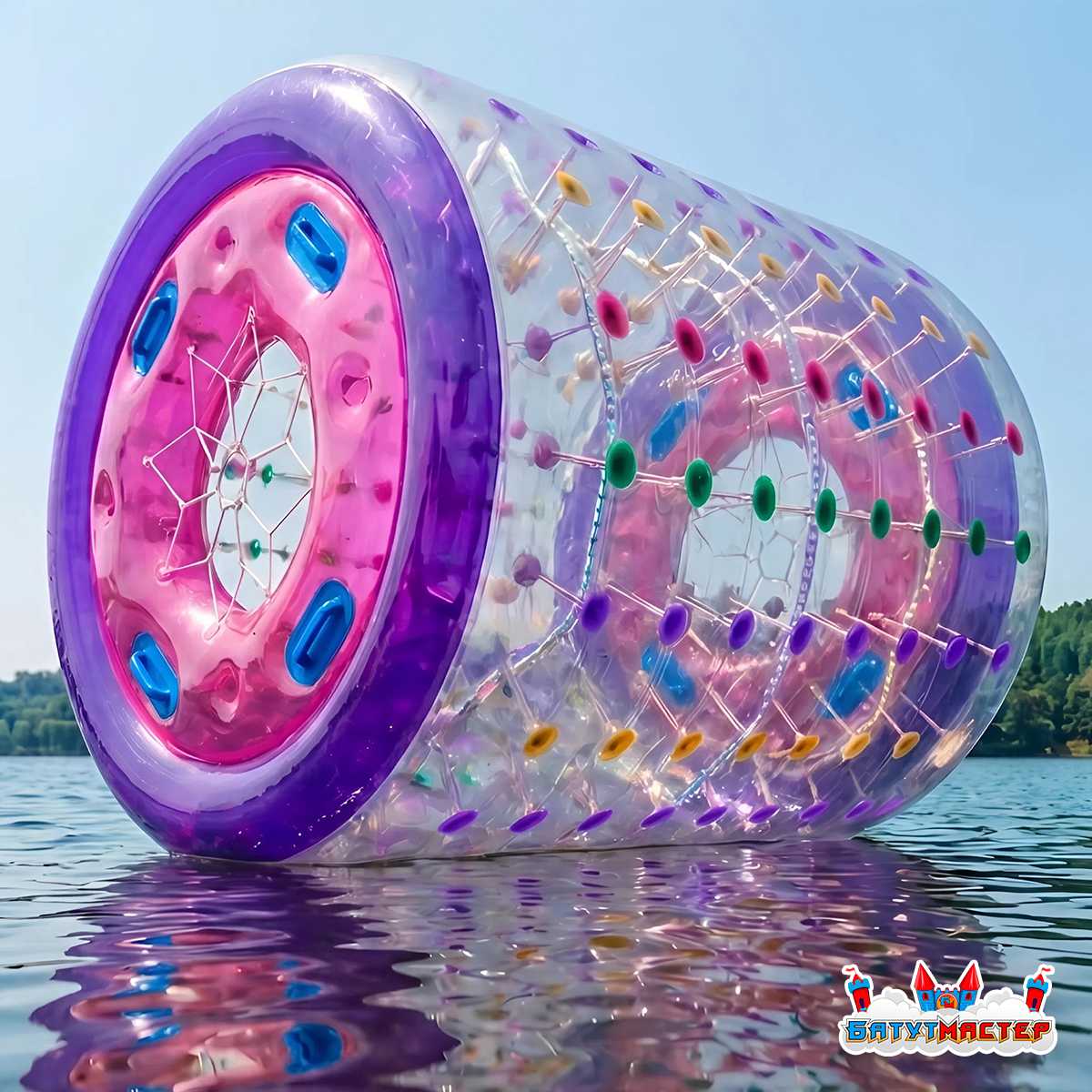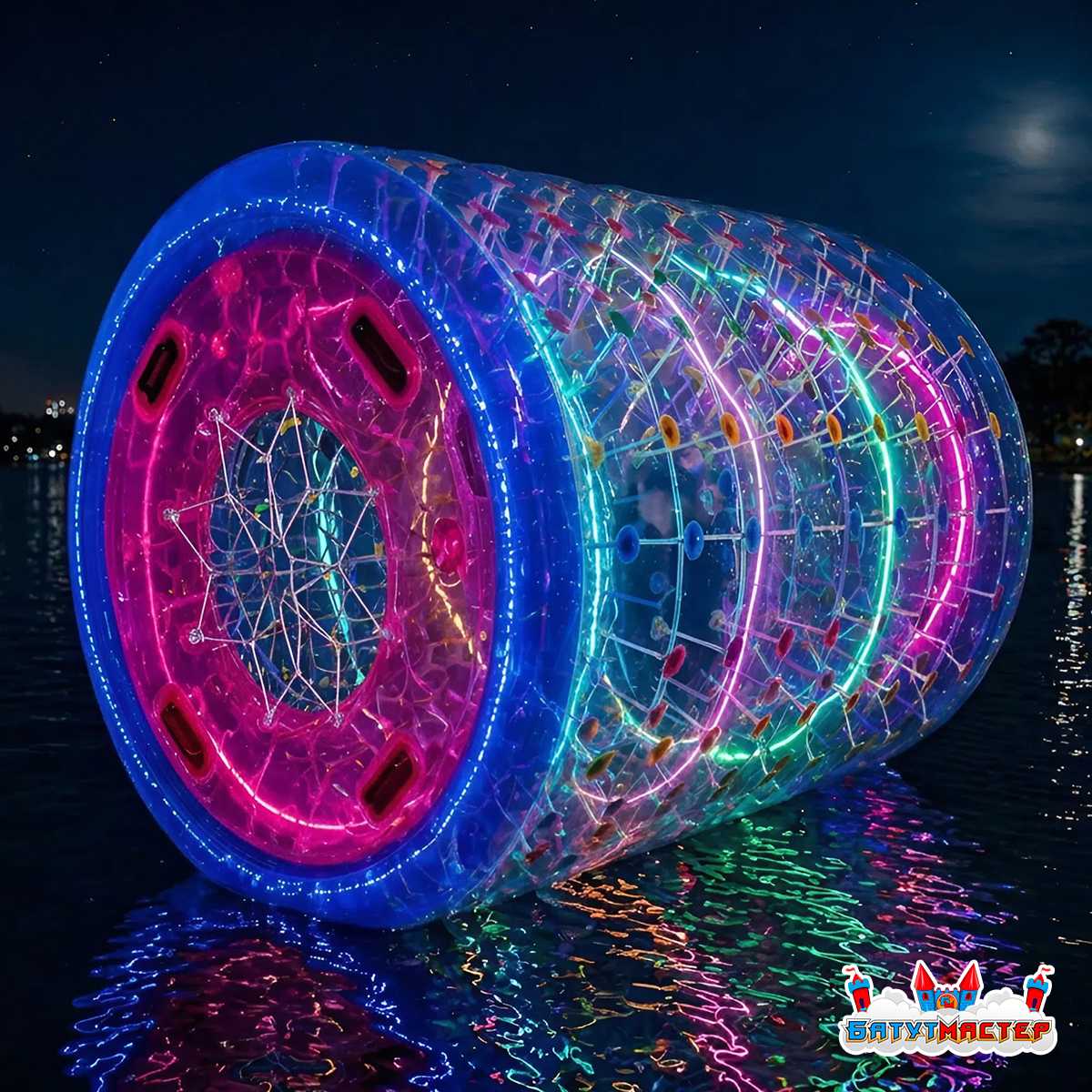 Водный роллер "Огни ночи" — это не просто водный аттракцион, а настоящий магнит для клиентов. Этот цилиндр из усиленного прозрачного ПВХ длиной 2,2 м и диаметром 2 м легко размещает двух человек, превращая процесс плавания в увлекательное приключение. Внутри — комфортное пространство, с обеих сторон — удобные отверстия для входа и выхода.