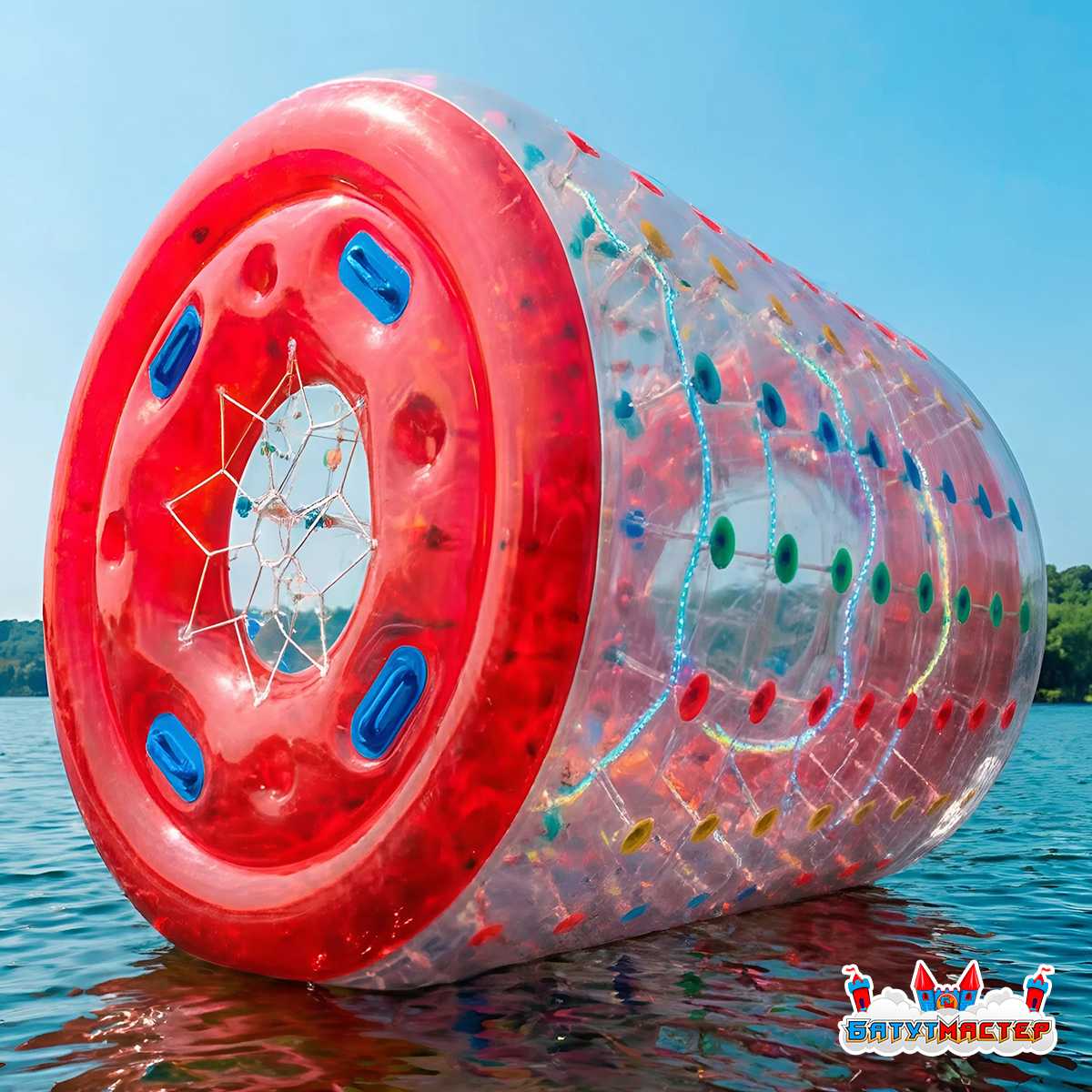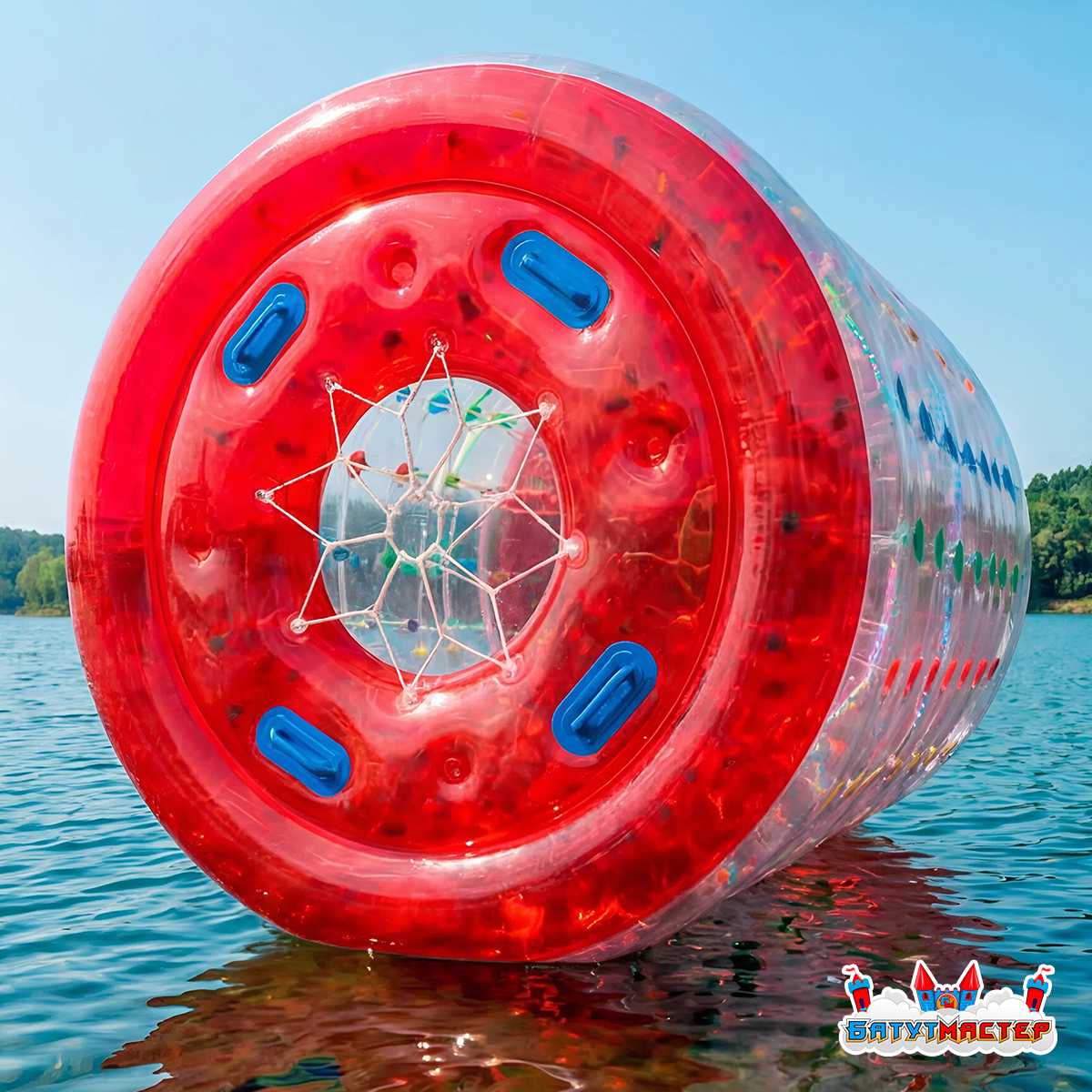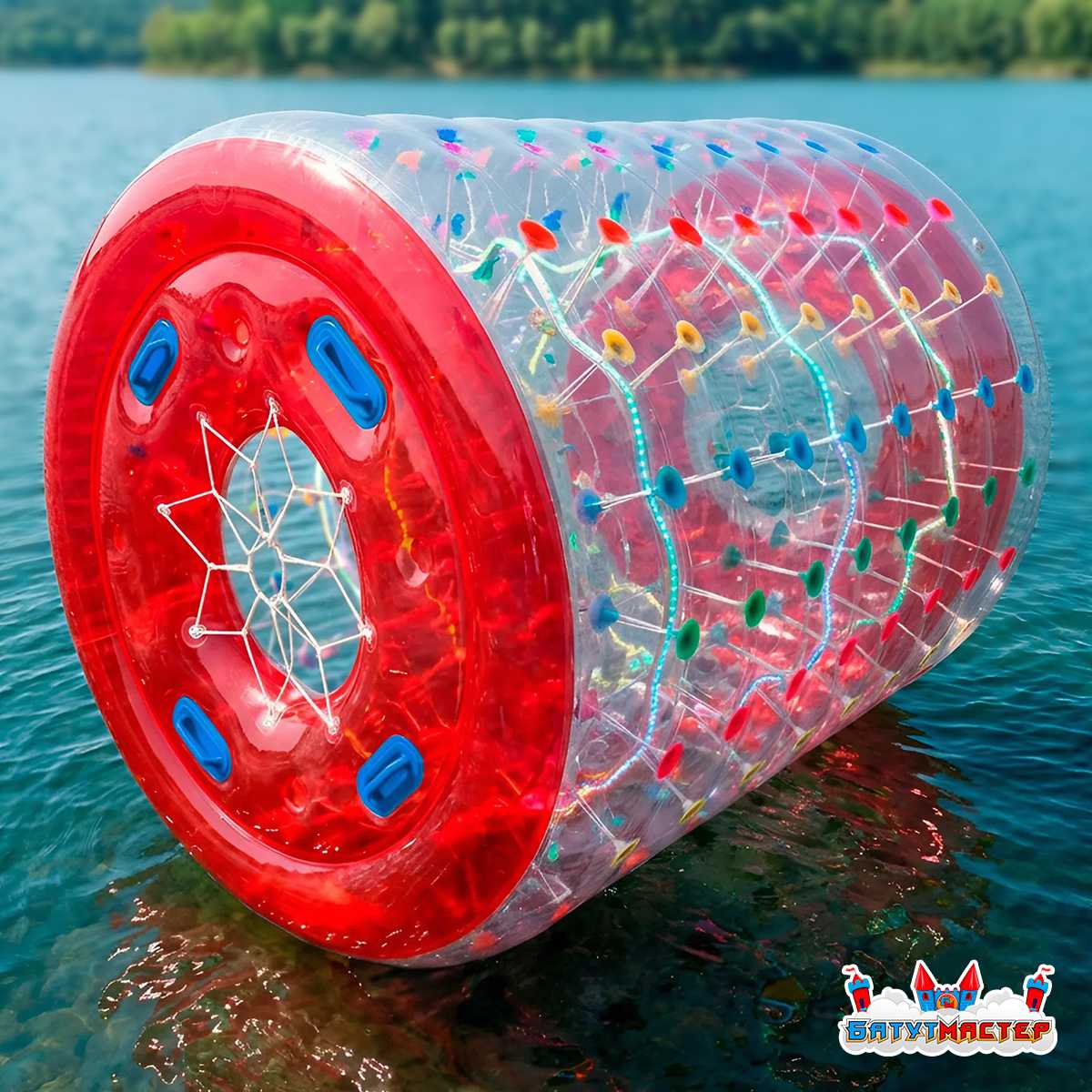 Водный роллер, или как его часто называют — гидророллер, аквароллер, водяное колесо — это надувной цилиндр длиной 2,4 метра и диаметром 2,2 метра, предназначенный для катания по поверхности воды. Он выполнен из прочного термополиуретана (ТПУ), прозрачен по бокам и имеет яркие красные торцы с разноцветными держателями строп. Пользователи входят внутрь конструкции и начинают двигаться, как хомяк в колесе — это вызывает вращение роллера по воде и создаёт массу незабываемых, весёлых моментов.