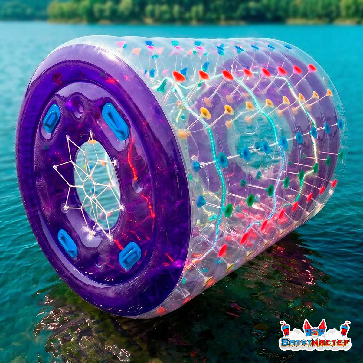 Водный роллер, или как его часто называют — гидророллер, аквароллер, водяное колесо — это надувной цилиндр длиной 2,2 метра и диаметром 2 метра, предназначенный для катания по поверхности воды. Он выполнен из прочного термополиуретана (ТПУ), прозрачен по бокам и имеет эффектные фиолетовые торцы с удобными ручками для посадки и высадки. Пользователи входят внутрь конструкции и начинают двигаться, как хомяк в колесе, опираясь на стропы паутинообразной конструкции внутри — это вызывает вращение роллера по воде и создаёт массу незабываемых весёлых моментов.