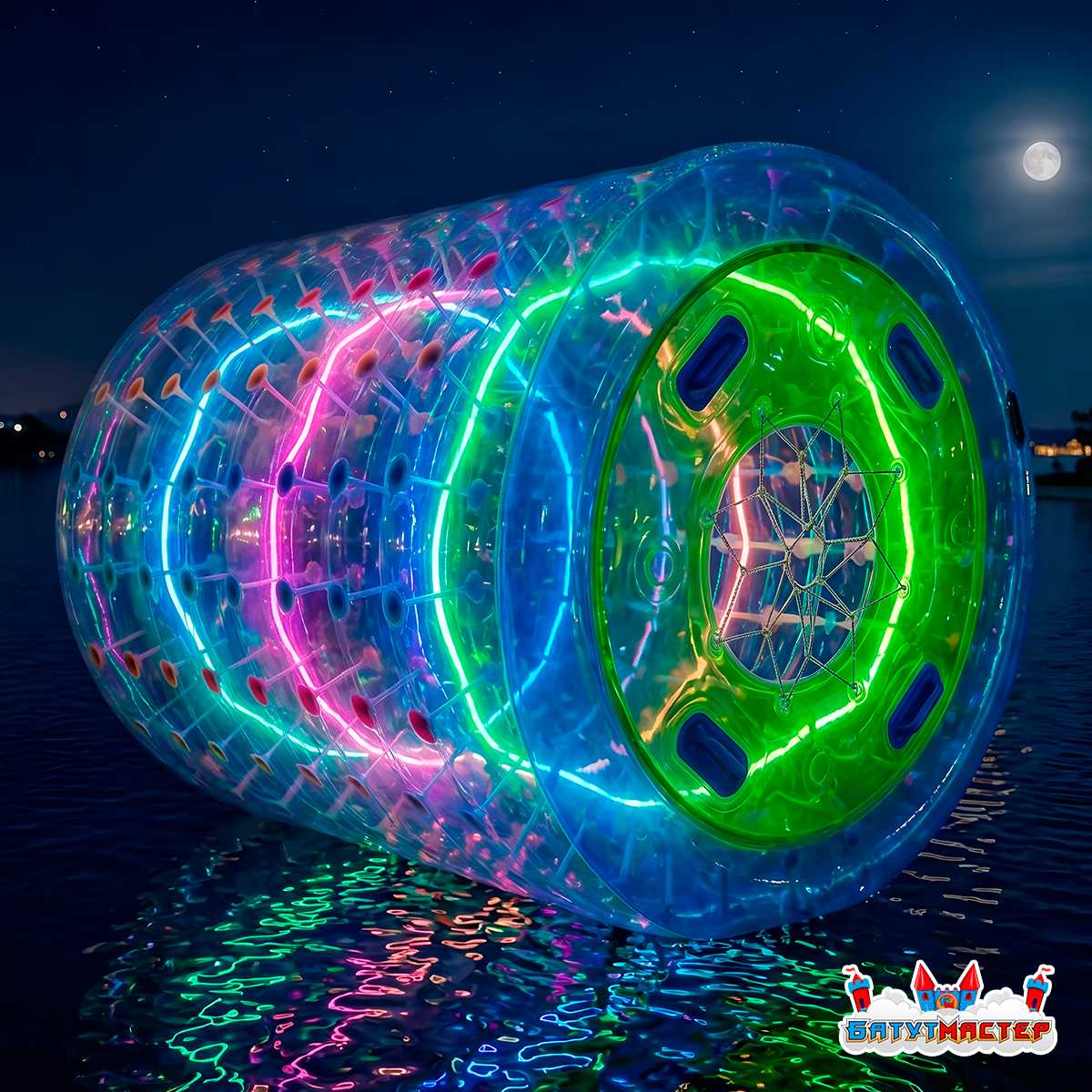 Представьте себе жаркий летний день, бирюзовую гладь озера и большой прозрачный цилиндр с яркими сине-зелёными торцами, плывущий по воде с весёлым экипажем из трёх человек. А теперь представьте ту же картину ночью — роллер светится изнутри зелёными, синими и розовыми неоновыми огнями, отражения которых дрожат на тёмной воде. Вы — владелец базы отдыха или организатор водных развлечений. Что способно привлекать максимальный поток клиентов, работать весь световой день и ещё несколько часов после заката? Ответ прост — водный роллер «Бирюзовый импульс». Это не просто надувной цилиндр, это самый вместительный аттракцион в линейке, способный одновременно прокатить троих участников и утроить вашу выручку с каждого сеанса.