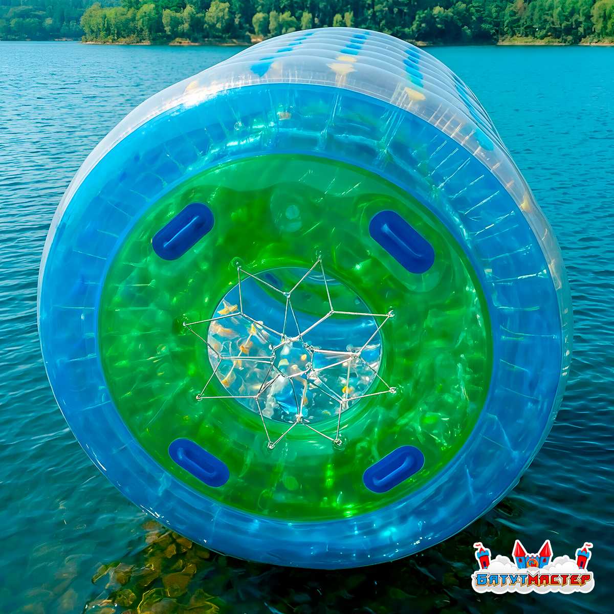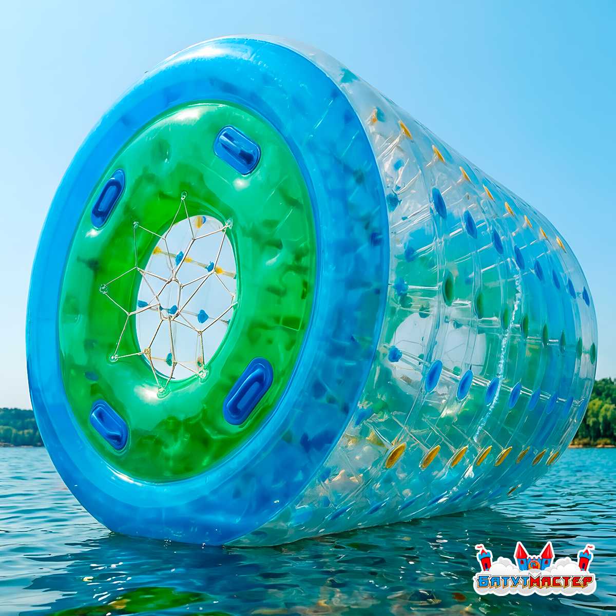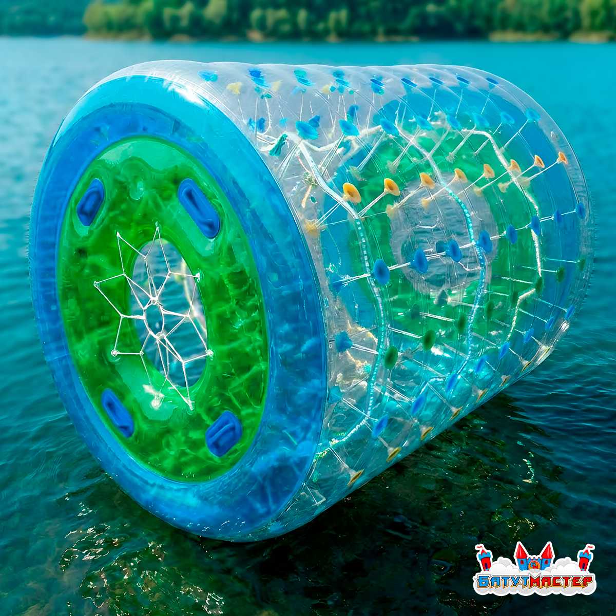 Водный роллер, или как его часто называют — гидророллер, аквароллер, водяное колесо — это надувной цилиндр длиной 2,4 метра и диаметром 2,2 метра, предназначенный для катания по поверхности воды. Он выполнен из прочного термополиуретана (ТПУ), прозрачен по бокам и имеет эффектные двухцветные торцы: синее внешнее кольцо и яркий зелёный внутренний диск с удобными синими ручками для входа и выхода. Синие и золотисто-жёлтые держатели строп создают на поверхности цилиндра живой орнамент, привлекающий взгляд издалека. Участники входят внутрь конструкции и начинают двигаться, как хомяки в колесе, опираясь на стропы паутинообразной конструкции — это вызывает вращение роллера по воде и создаёт массу незабываемых весёлых моментов сразу для троих.