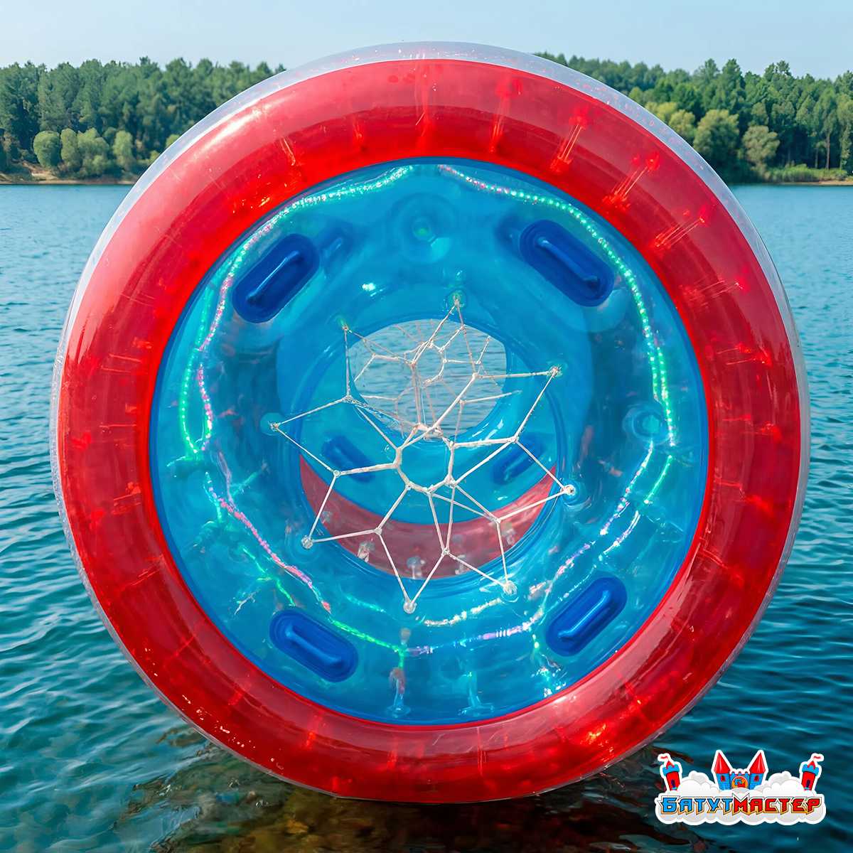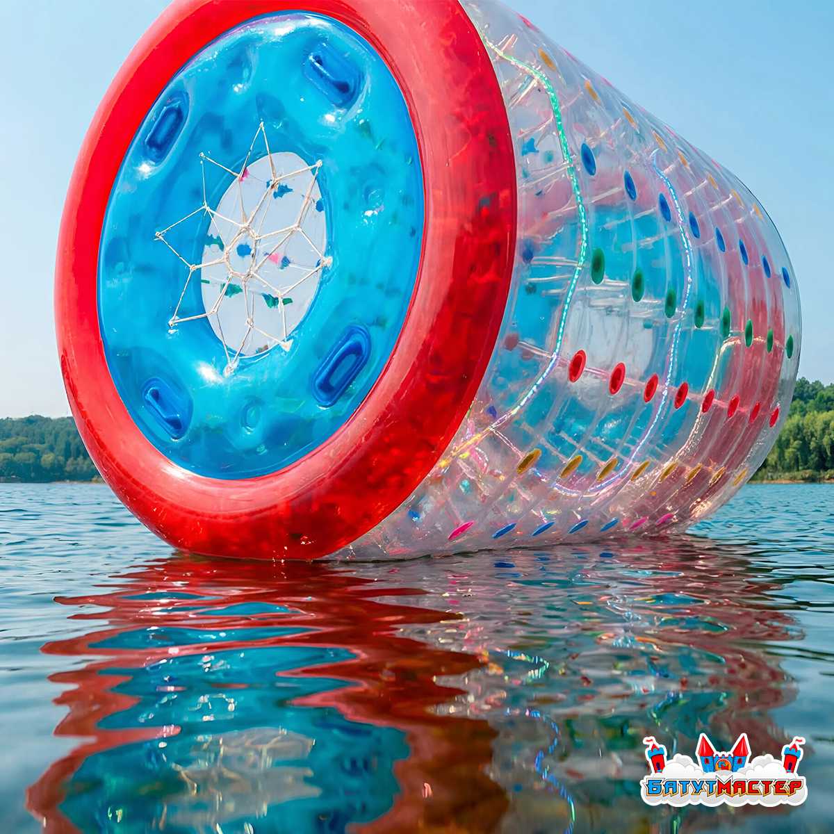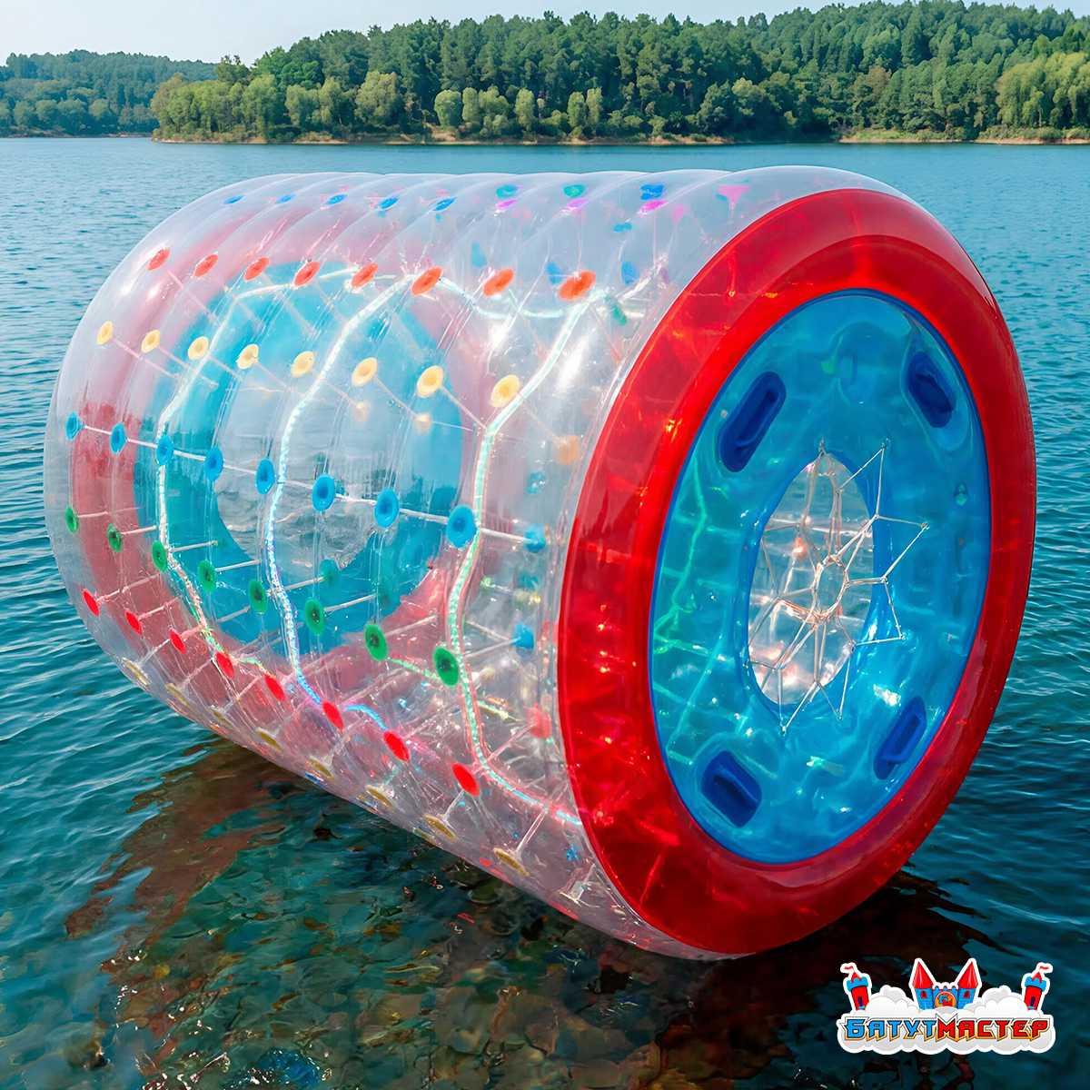 Водный роллер, или как его часто называют — гидророллер, аквароллер, водяное колесо — это надувной цилиндр длиной 2,4 метра и диаметром 2,2 метра, предназначенный для катания по поверхности воды. Он выполнен из прочного термополиуретана (ТПУ), прозрачен по бокам и имеет выразительные двухцветные торцы: красное внешнее кольцо и яркий голубой внутренний диск с удобными синими ручками для входа и выхода. Разноцветные держатели строп — красные, зелёные, голубые и жёлтые — рассыпаны по всей поверхности цилиндра, создавая праздничный конфетти-эффект при дневном свете.