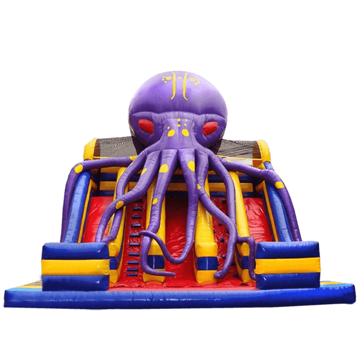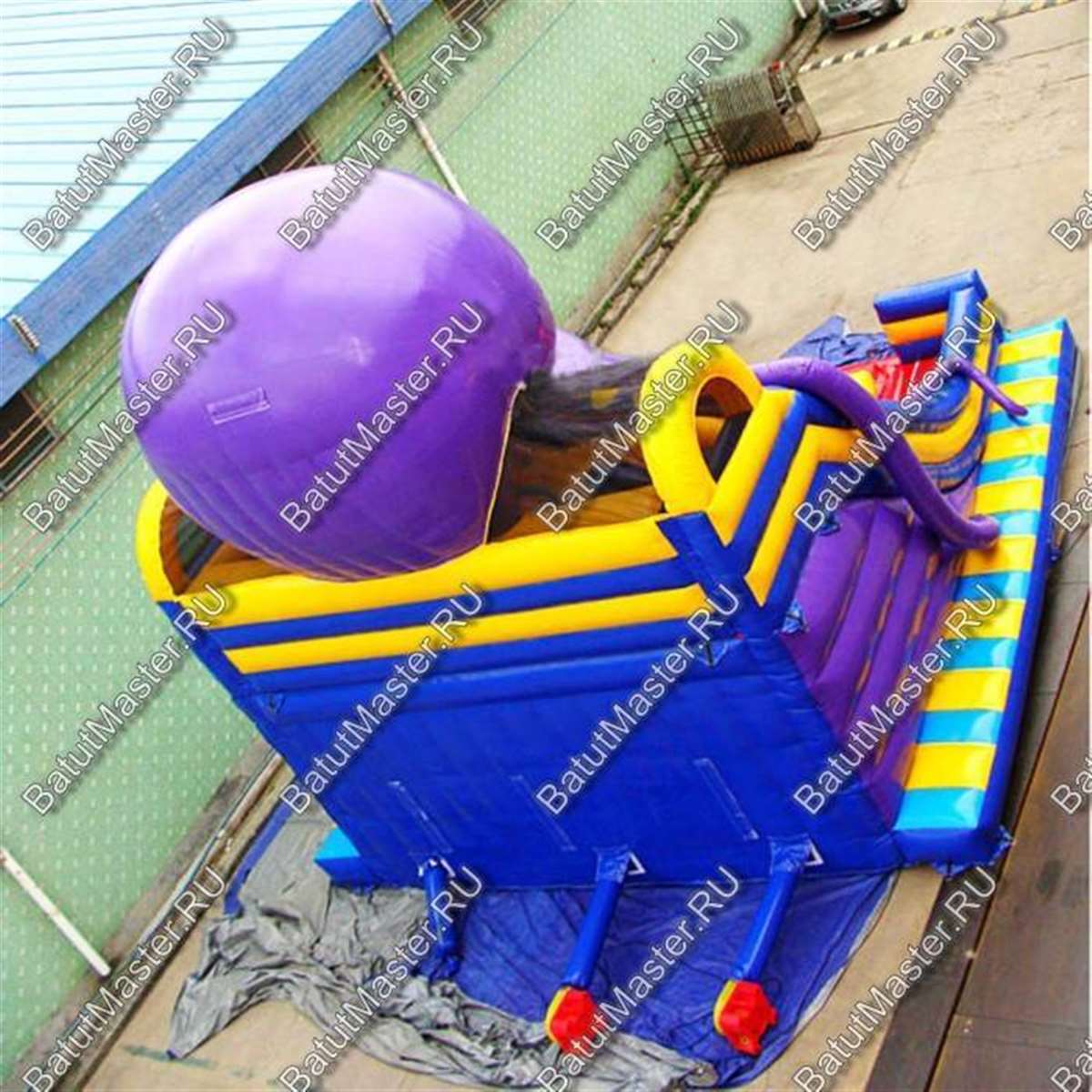 Батут горка, разделена на 5 частей: центральный спуск посредине, два подъема (один в виде лестницы, другой в виде скалодрома) и две горки по краям. Поверхность горки красная, ступеньки и фиксаторы на скалодроме – синего цвета. Каждый спуск или подъем отделен друг от друга высоким мягким бордюром в желтую и синюю полоску. Несмотря на то, что сам по себе батут высокий, его высоту еще добавляет огромный осьминог фиолетового цвета с желтыми пятнышками в качестве окраса.