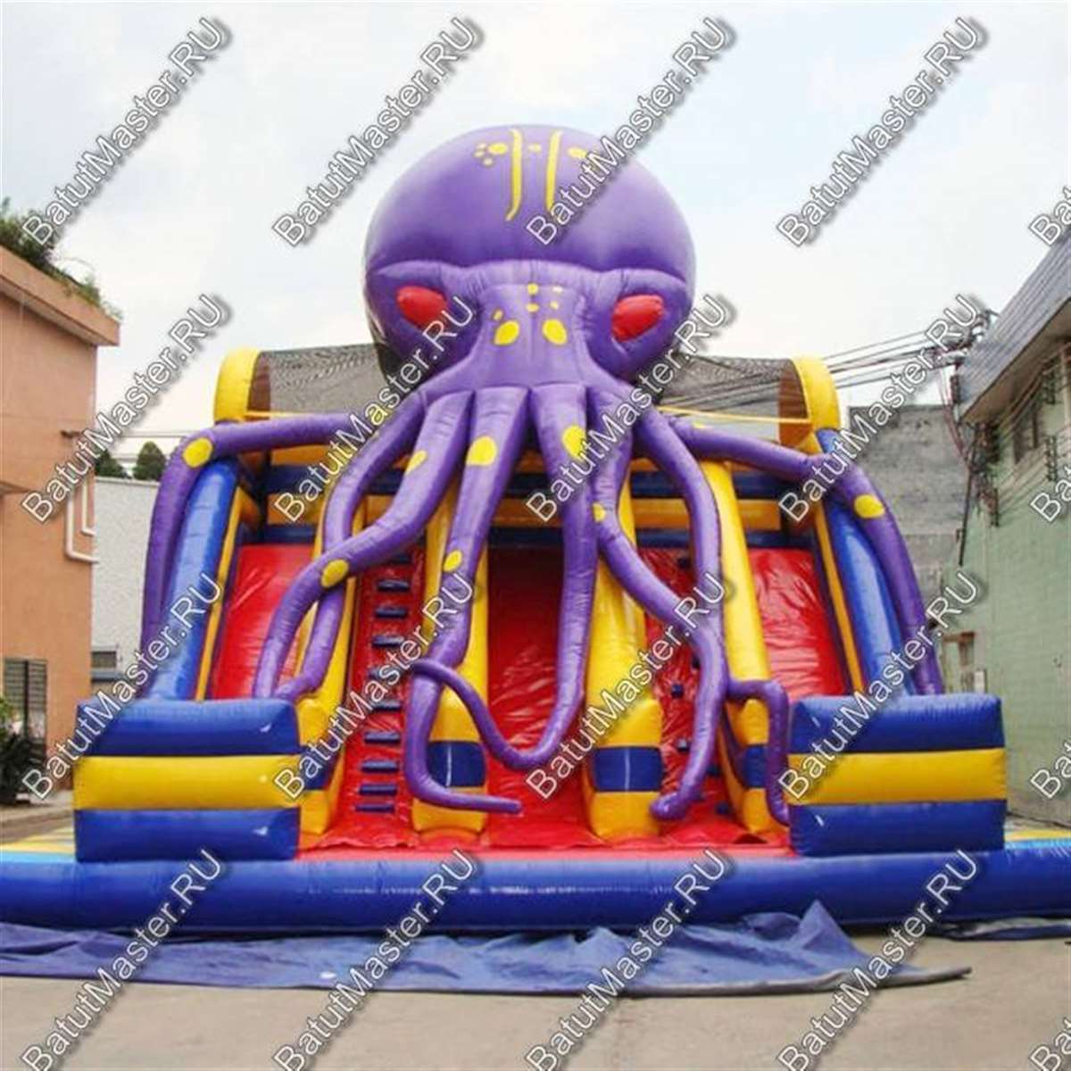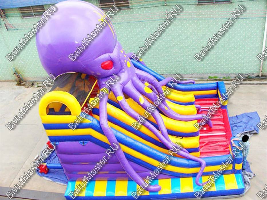 Площадка, состоящая из одной огромной горки – еще более увлекательное приключение, чем просто игровой батут. А еще, если сверху распластался большой осьминог и своими щупальцами тянется к катающимся озорникам, то это действительно сказочное путешествие. Дети любят не только веселых и добрых персонажей из мультфильмов, им особенно интересно испытывать чувство страха. Даже, если кто-то из детей не совсем понимает, что это за млекопитающее, ему обязательно захочется оказаться поблизости с таким страшным монстром.