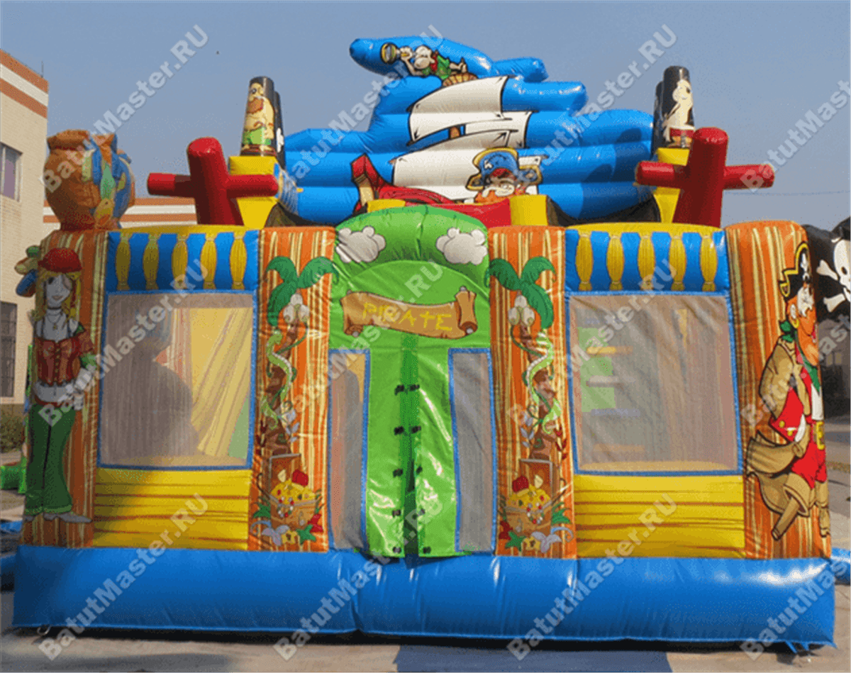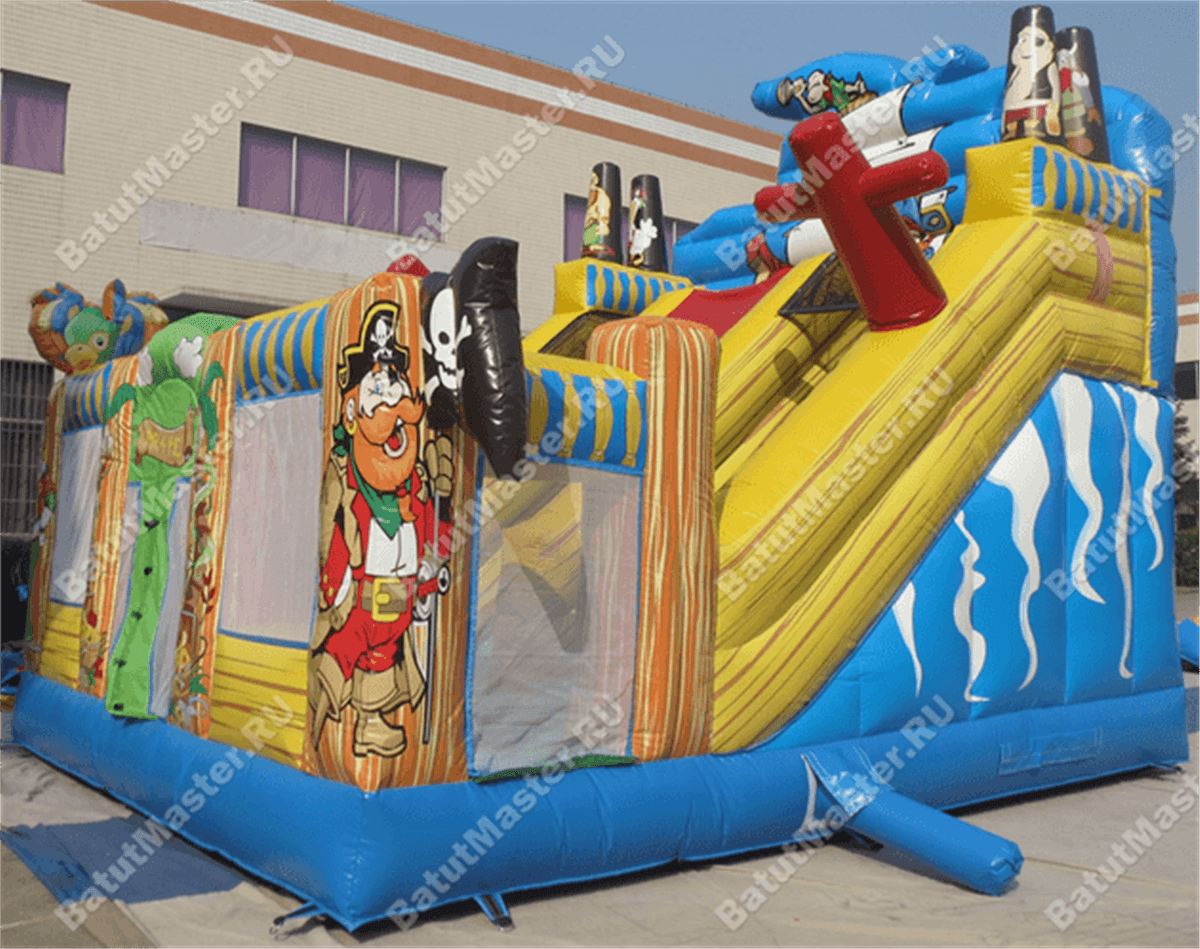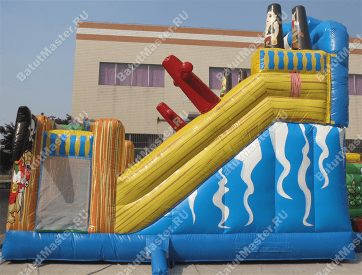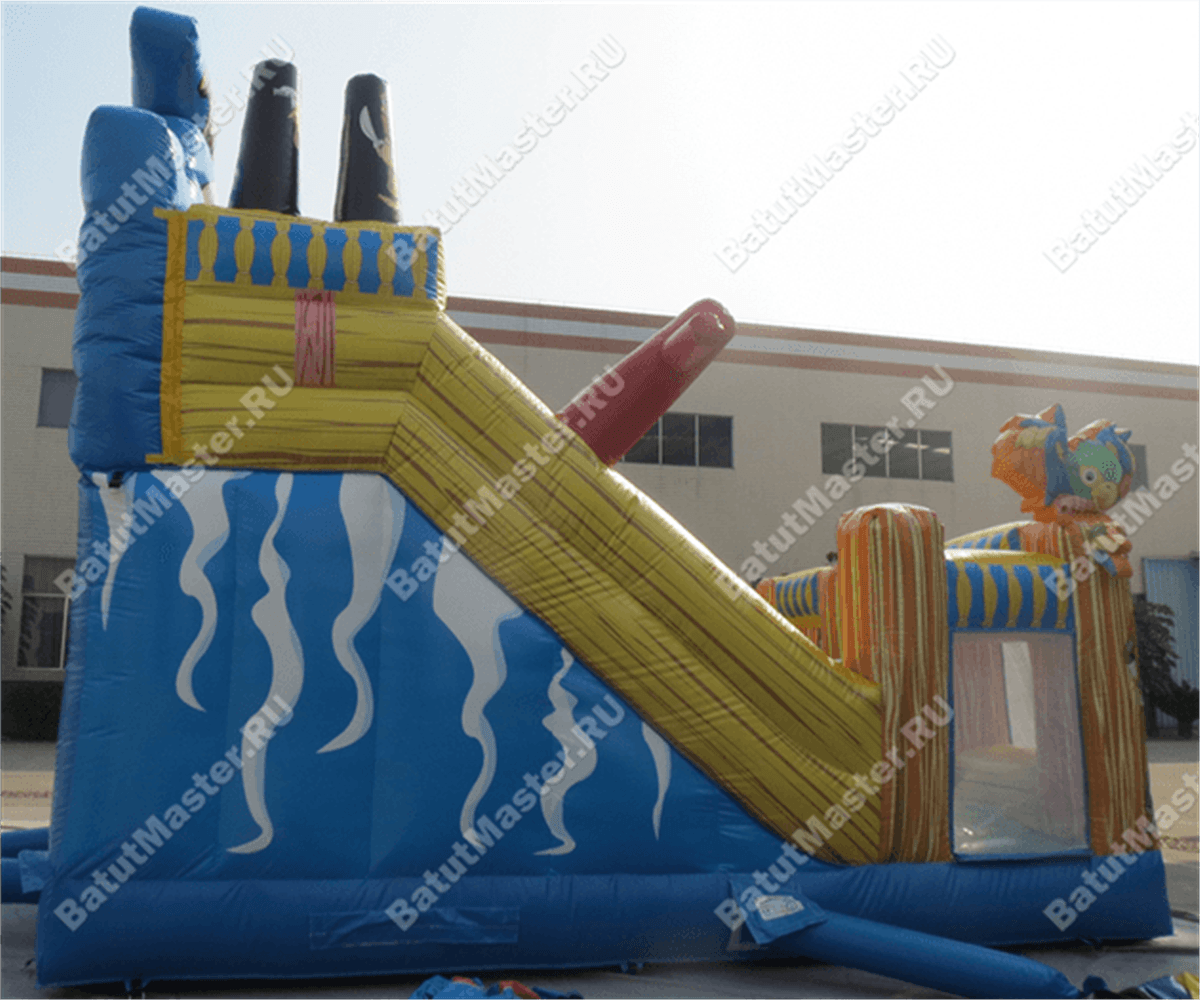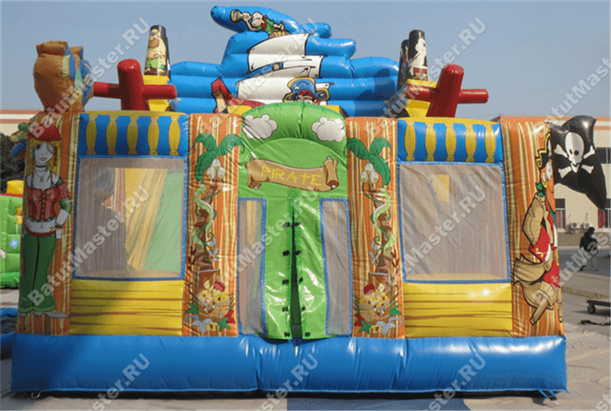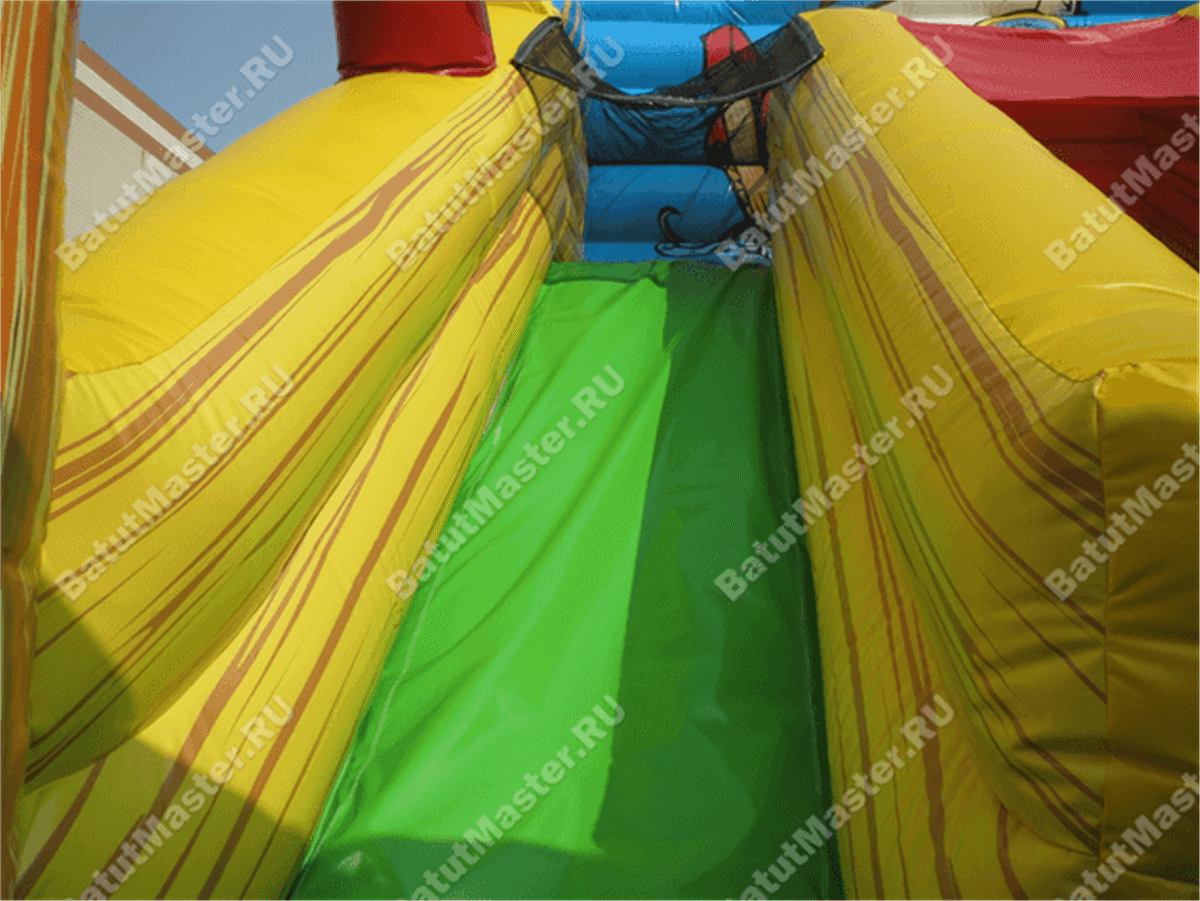 Надувной батут-горка, несмотря на небольшие размеры, смог вместить целый перечень снарядов: горка, игровые фигуры-столбики, место для прыжков, площадка для бега – тут найдется уголок для каждого ребенка. Пираты еще никогда не были такими добродушными и веселыми. Корабль всегда готов отправиться в путь, пассажиров защитят не только высокие борта, но и надежная сетка.