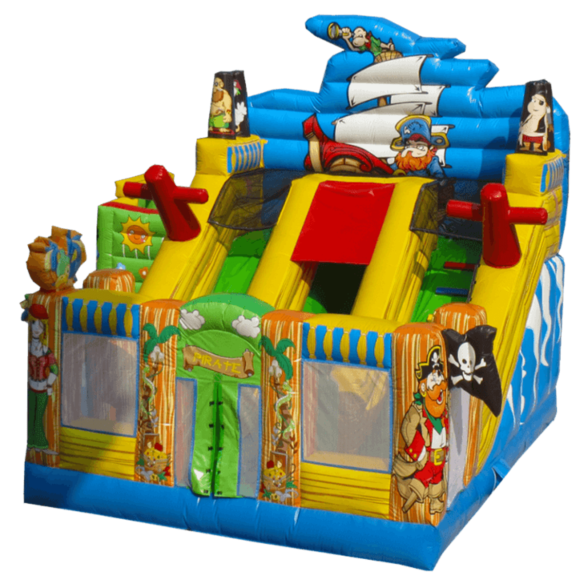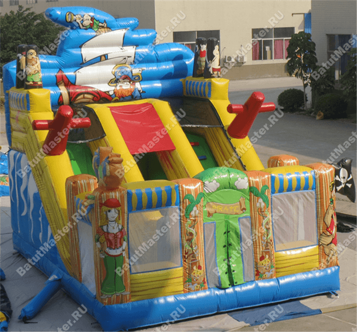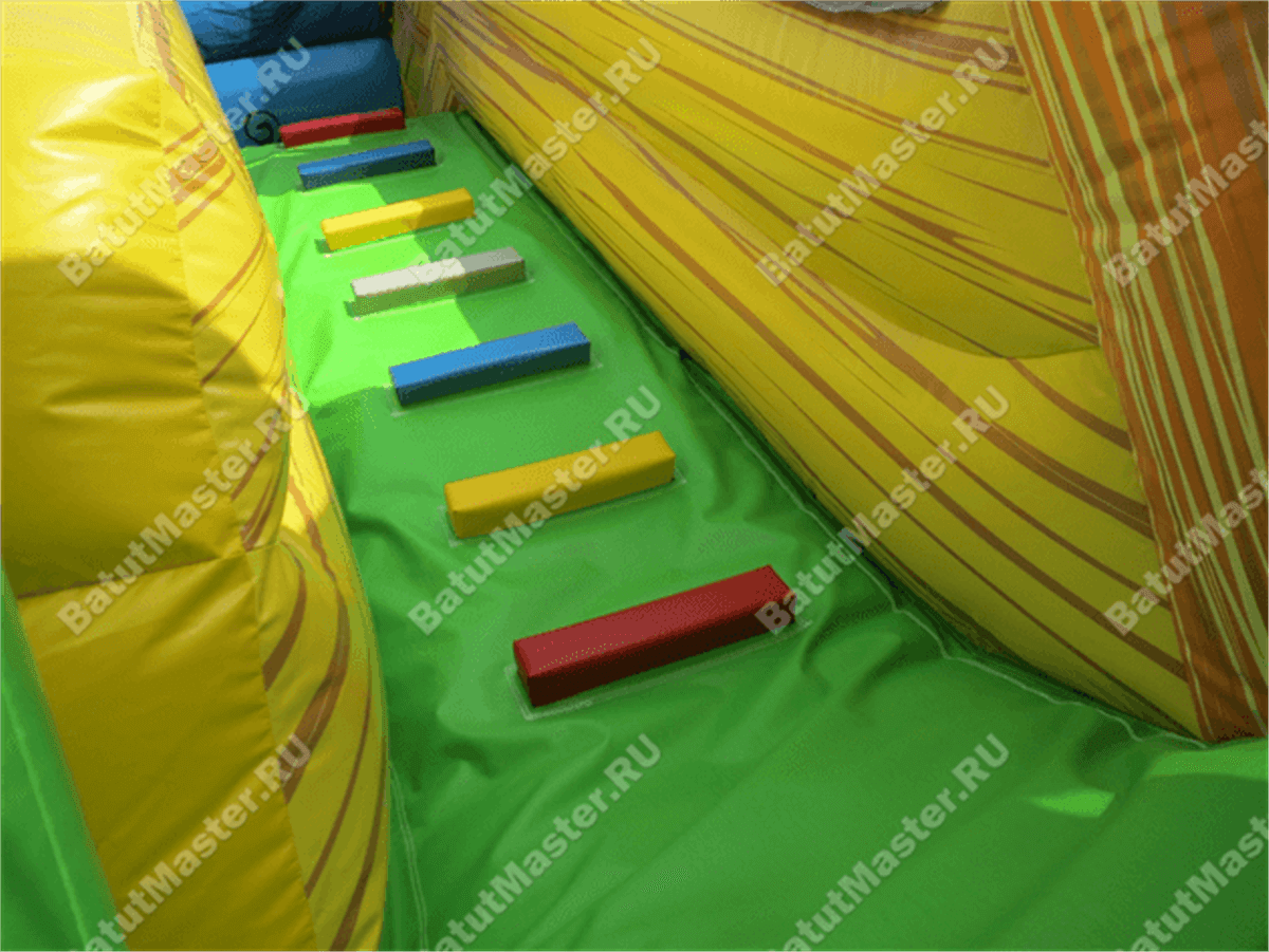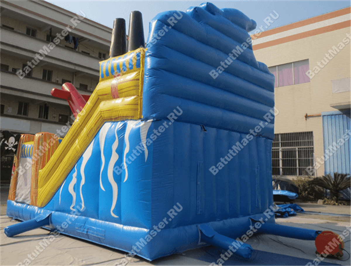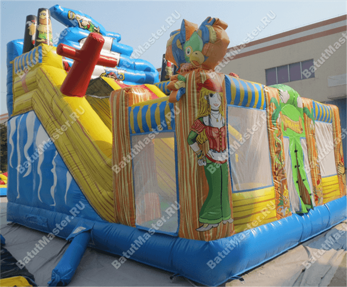 Надувной батут-горка, несмотря на небольшие размеры, смог вместить целый перечень снарядов: горка, игровые фигуры-столбики, место для прыжков, площадка для бега – тут найдется уголок для каждого ребенка. Пираты еще никогда не были такими добродушными и веселыми. Корабль всегда готов отправиться в путь, пассажиров защитят не только высокие борта, но и надежная сетка.