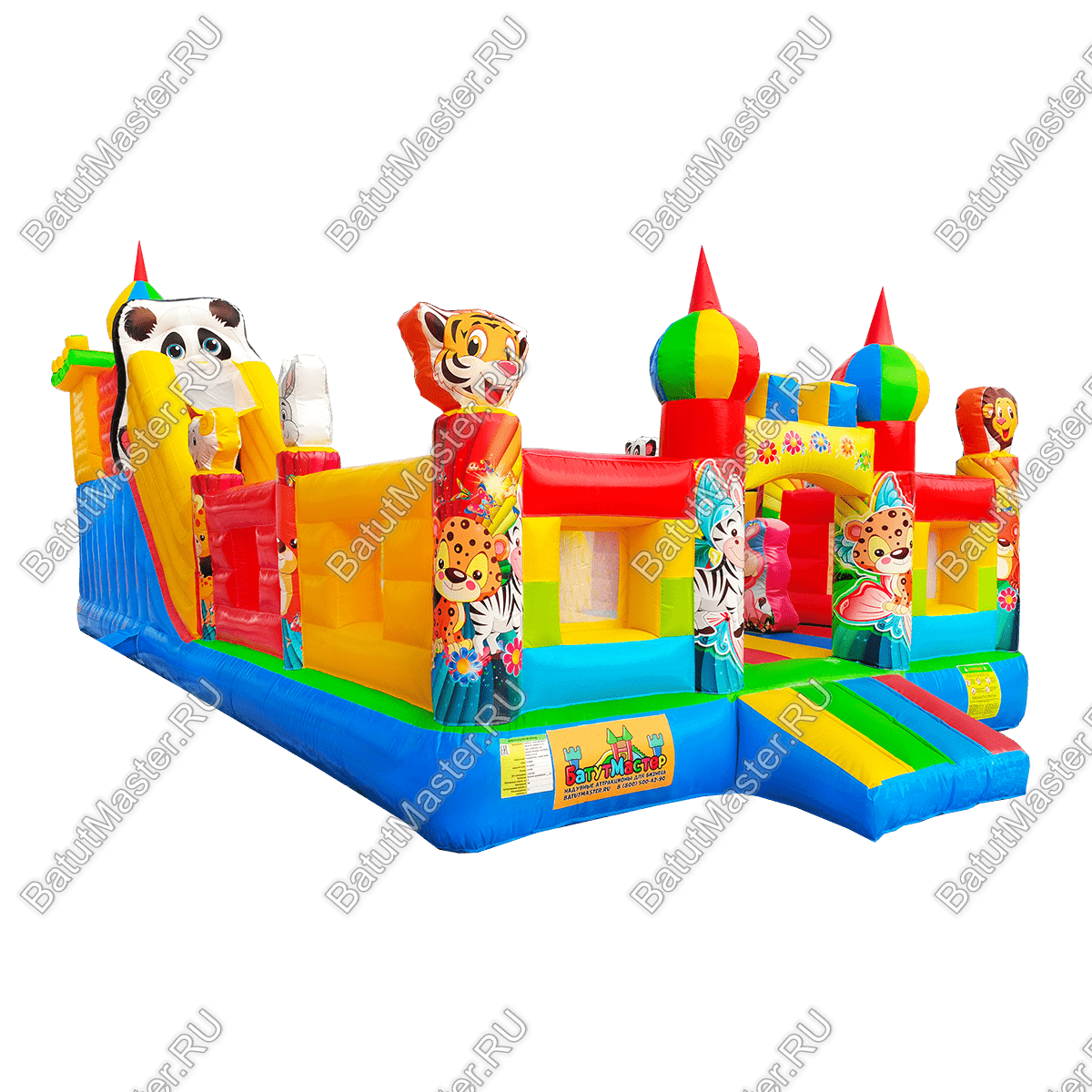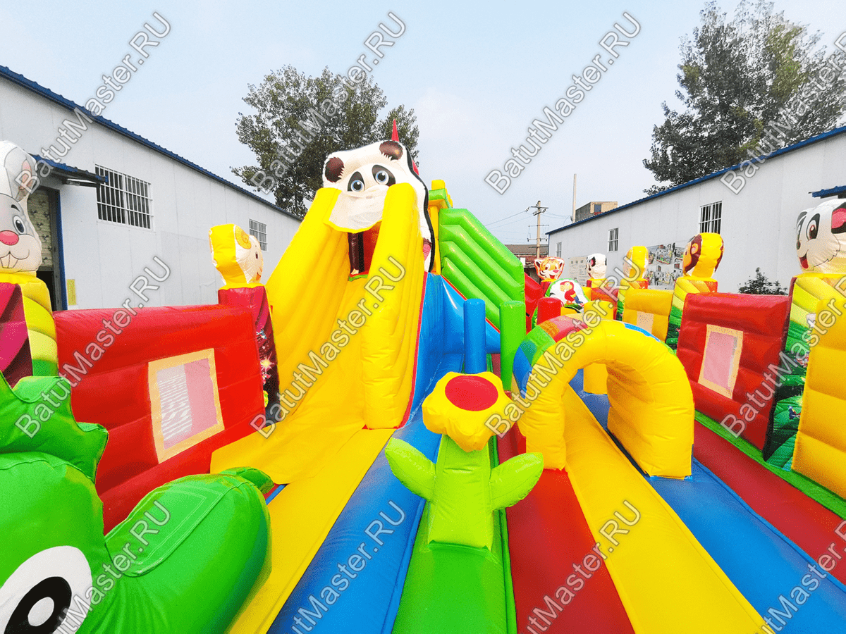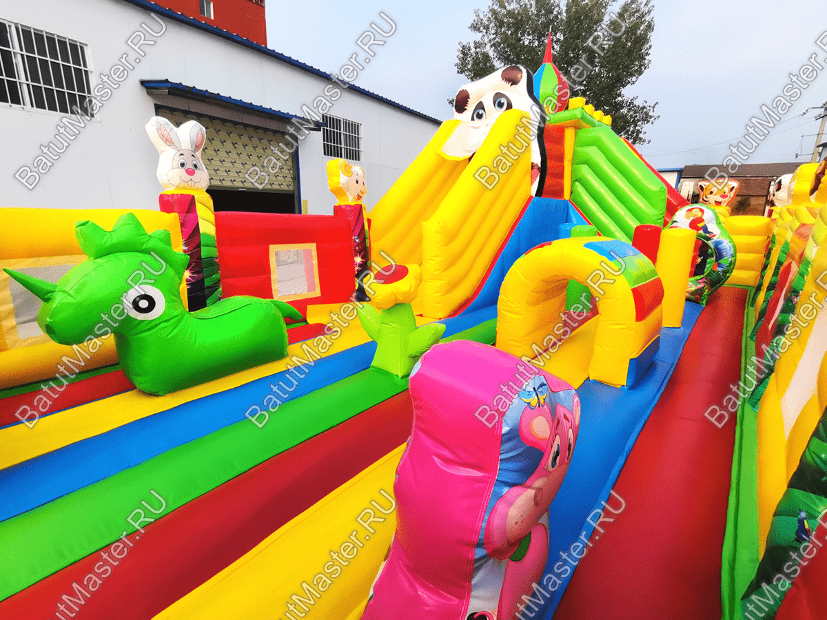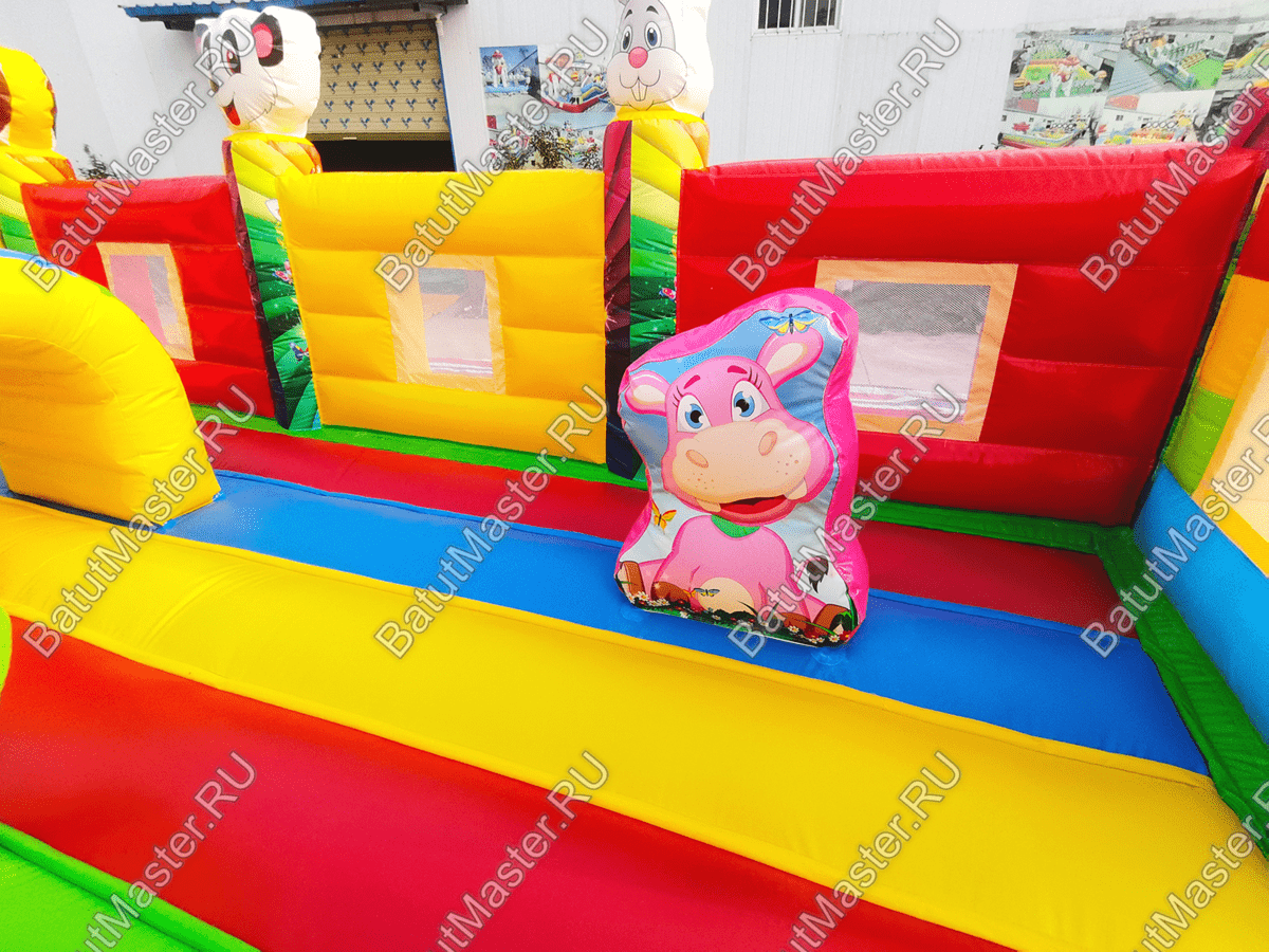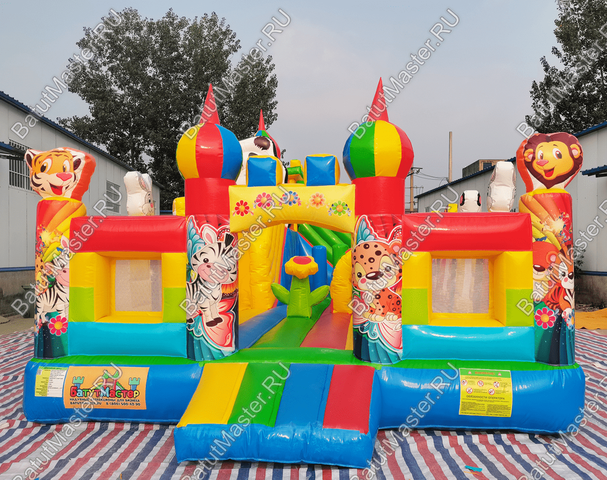 Большой и яркий батут напоминает сказочный дворец, который имеет настоящий замок и башни со шпилями. Вход в детское царство охраняют арочные врата, а по периметру защищает достаточно высокий забор. Внутри аттракциона находятся два независимых элемента с горками, они объединены общим переходом для разнообразия выбора развлечений. По углам и в центре батута находятся веселые зверята.