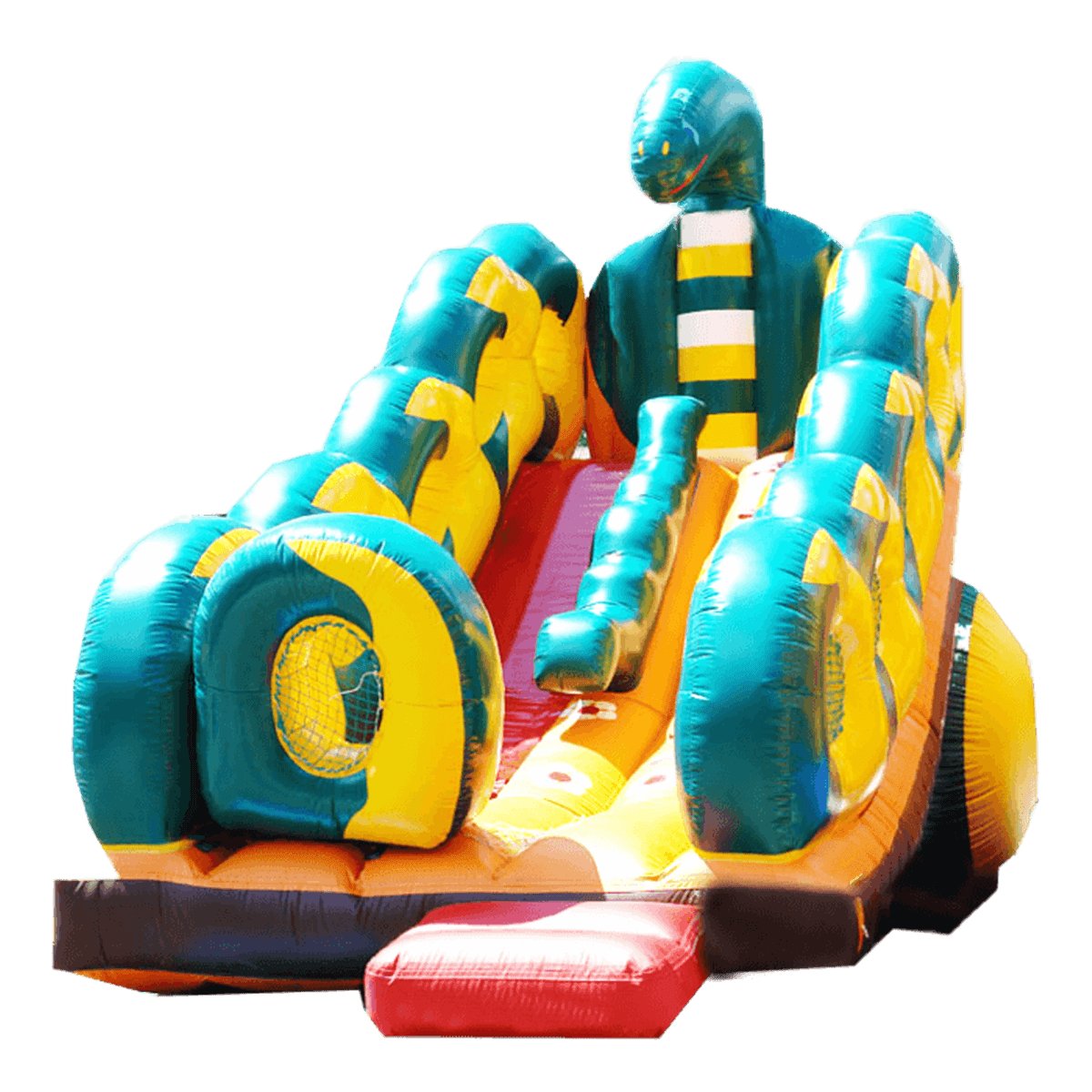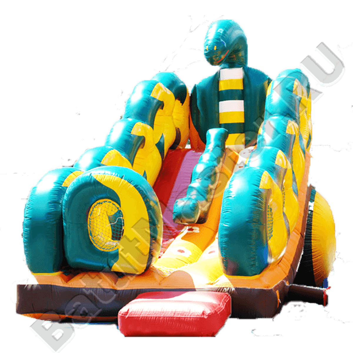 Сама же горка выполнена из желтого ПВХ, где зона подъема и зона спуска разделены волнистым зеленым бордюром. Стартовая площадка горки закрыта с трех сторон «телом» надувной кобры, а центральная стенка вверху украшена головой ядовитого пресмыкающегося. Если зона лестницы размещается справа, то с левой стороны – горка своим спуском упирается в надувной барьер в виде кольца фасадной стенки. Таким образом, дети после съезда вниз остаются в рамках развлекательной площадки и могут покинуть ее только при желании.