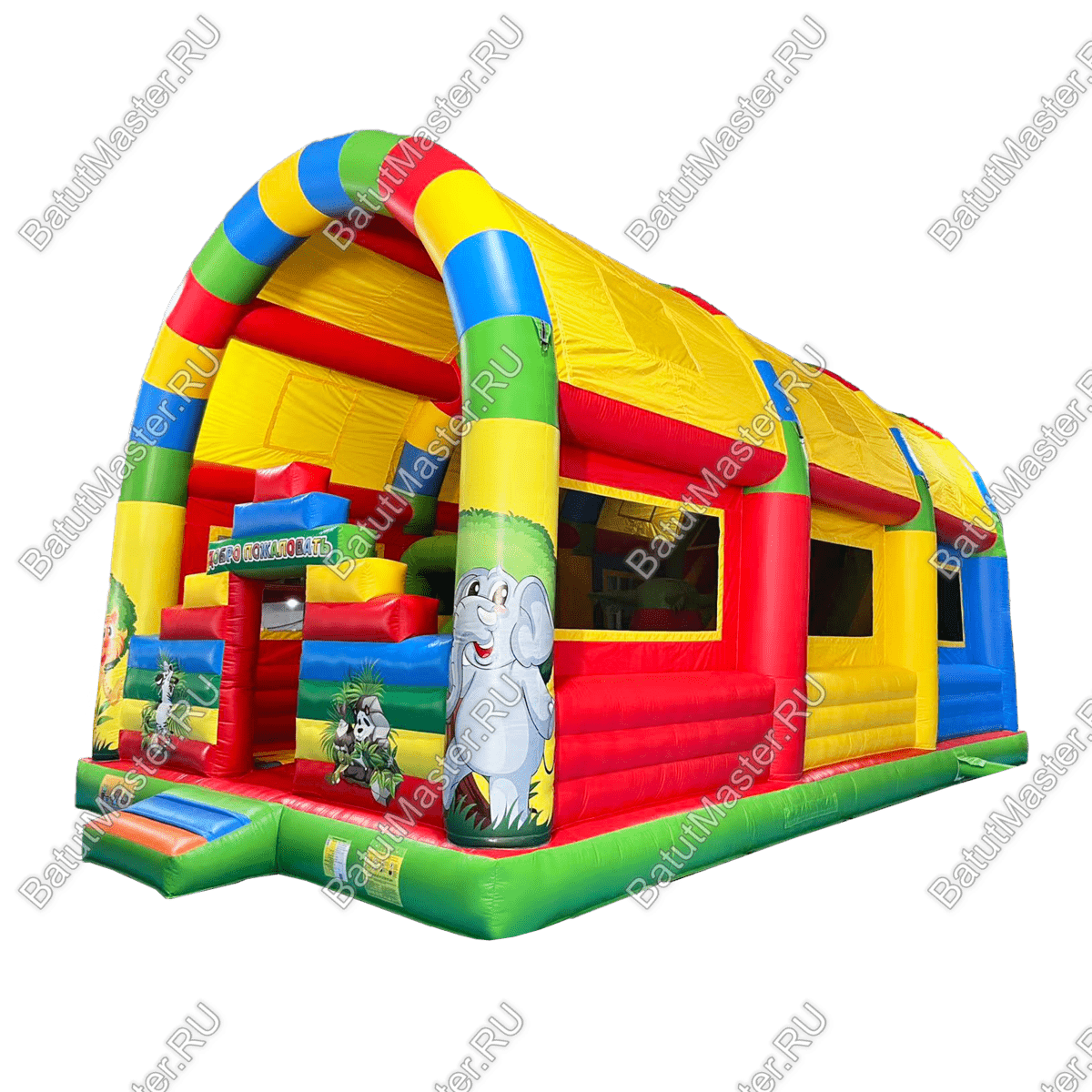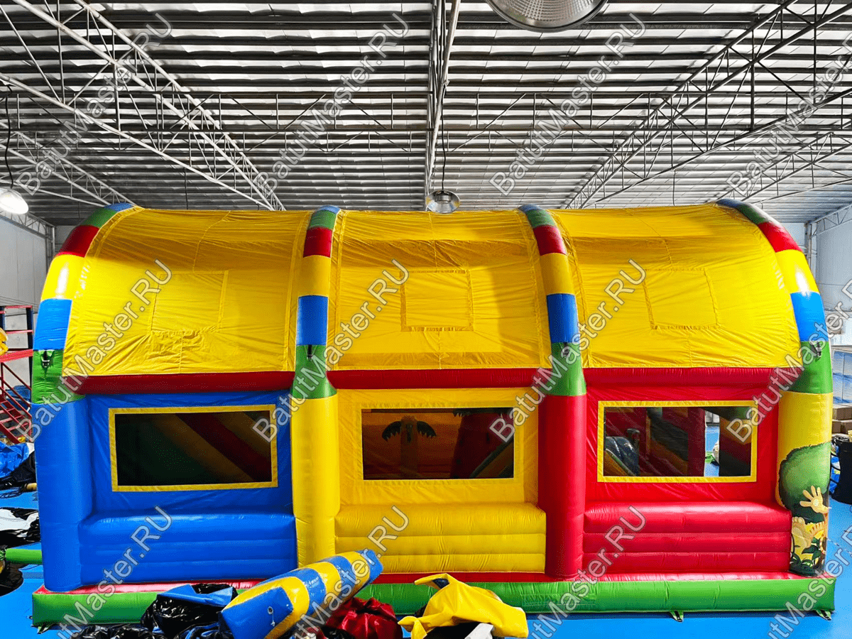 Выбор такого батута с тентом станет незаменимым для дождливых дней и жаркого лета, поскольку внутри комплекса всегда будет сухо и не жарко, а наличие окошек в стенах позволяет проветривать внутреннюю зону.