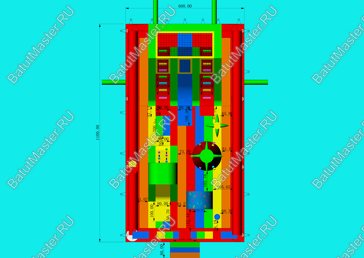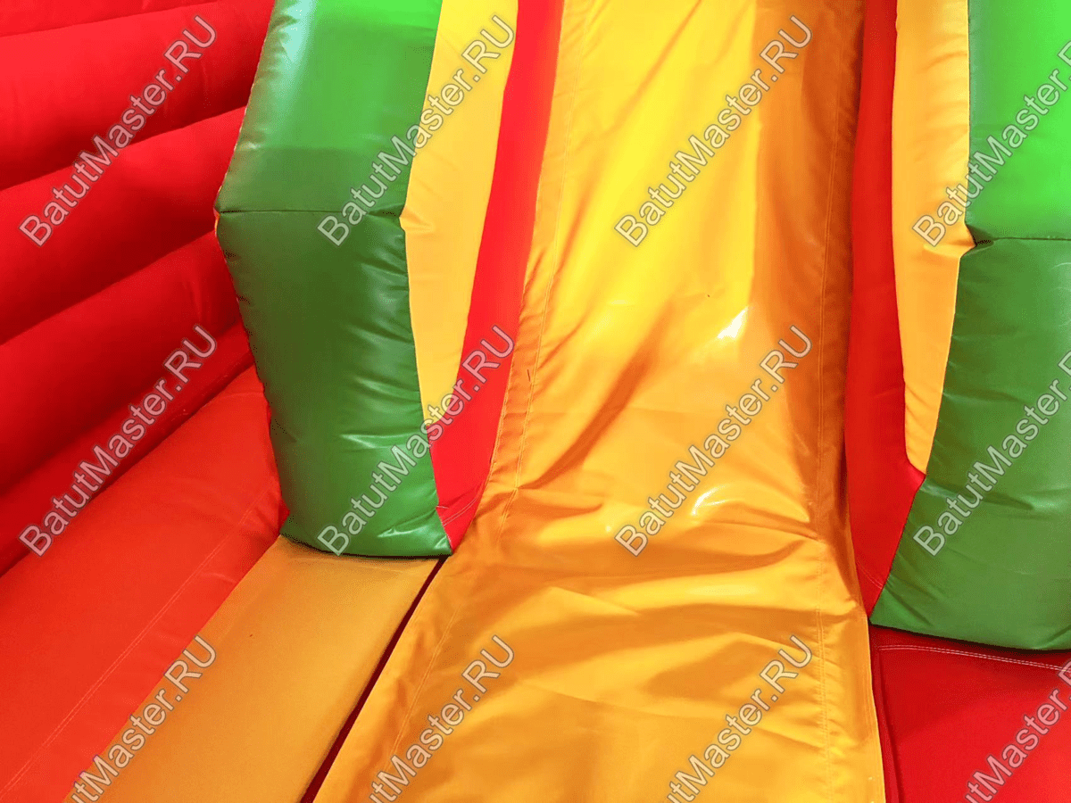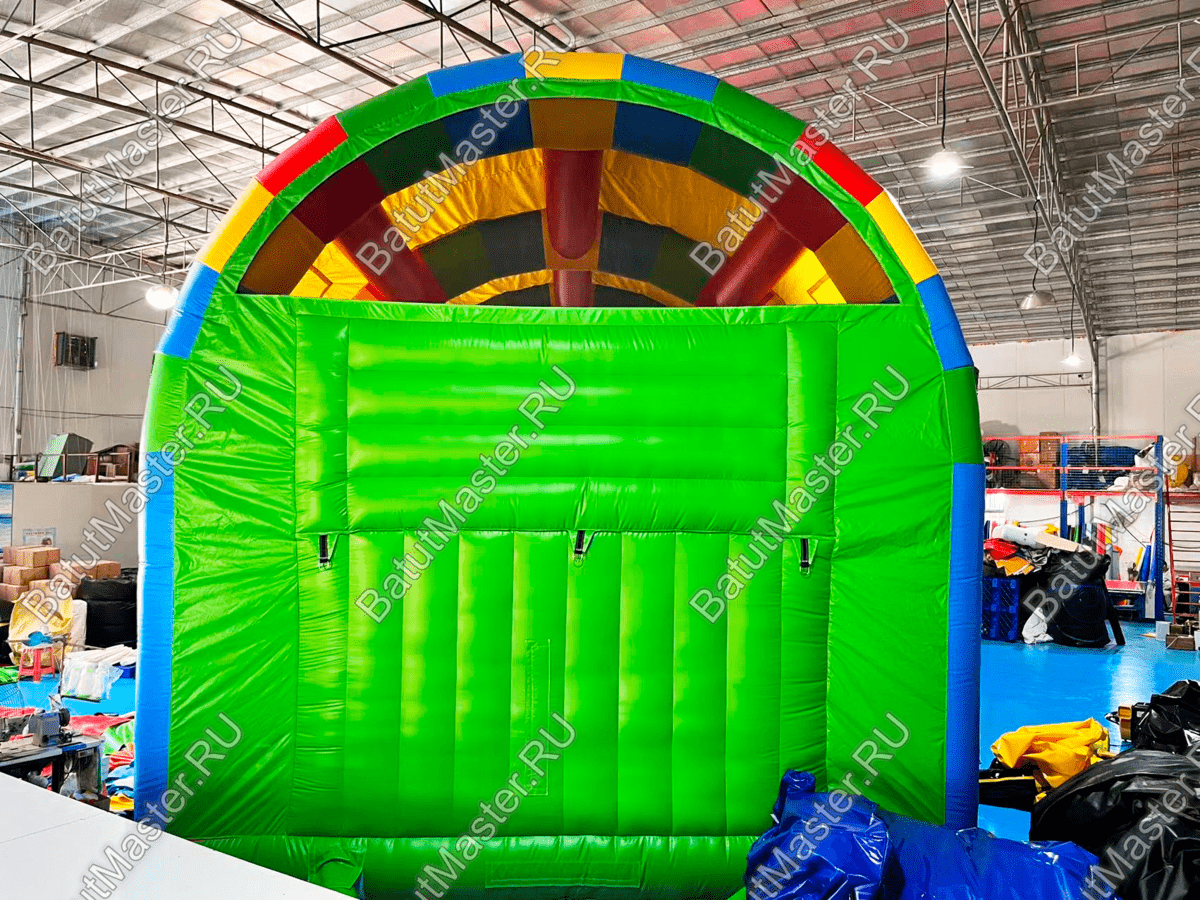 Огромный коммерческий батут «Радуга -2» очень яркий и эффектный, это крытый аттракцион, выполненный во всех цветах радуги. Вход внутрь ограничен надувной плоской пирамидой, при этом верхняя зона стены до потолка остается открытой. Крыша сделана в виде купола из мягких перекрытий с натянутым между ними тентом.