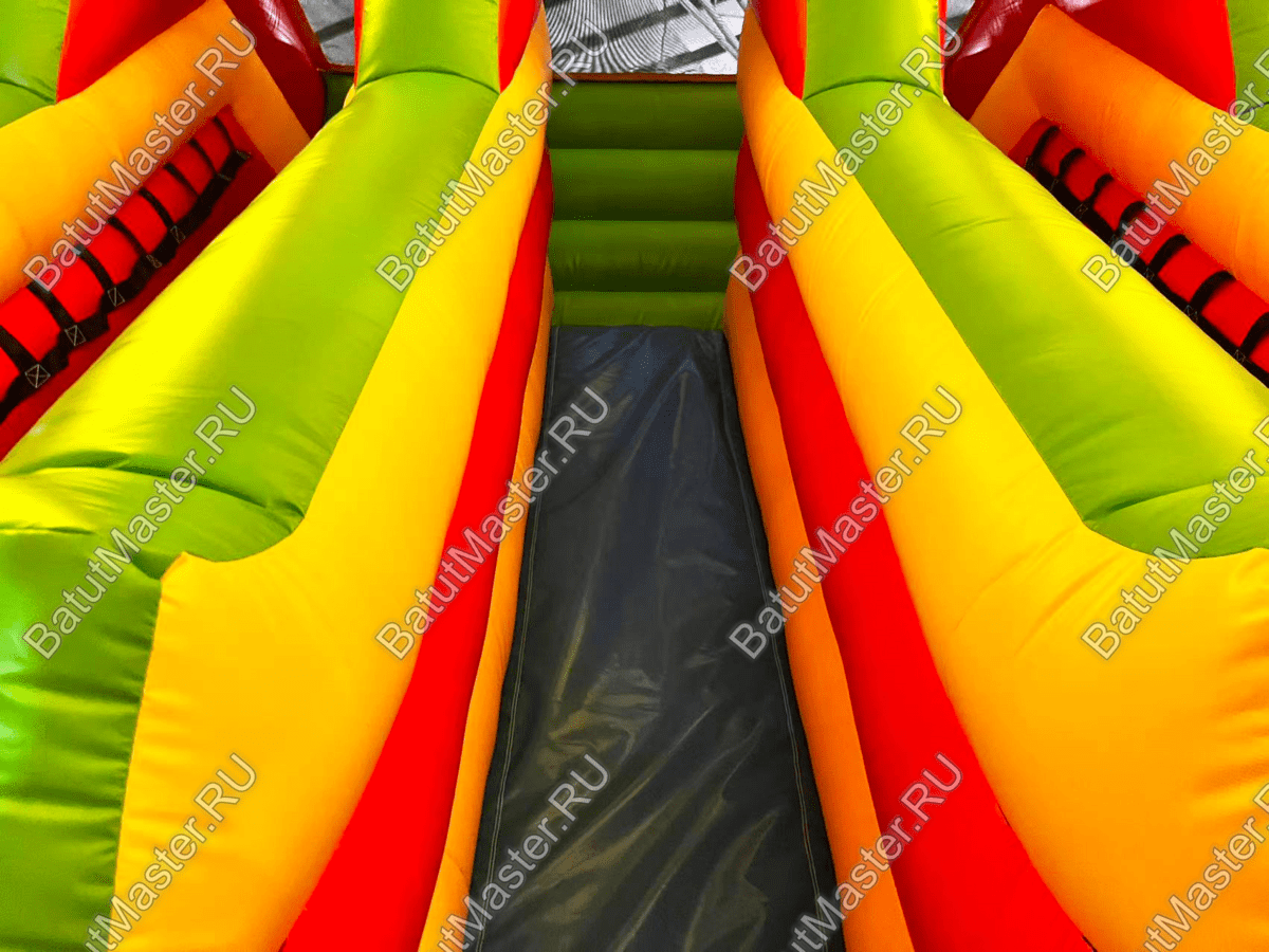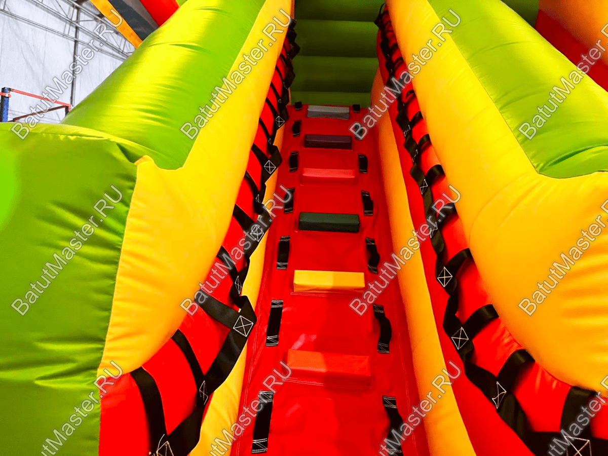 Горка разделена на три полосы, боковые части предназначены для подъема на верхнюю площадку, а по центру натянуто гладкое полотно для скоростного спуска. Между полосами имеются высокие борта, что обеспечивает безопасное и удобное съезжание.