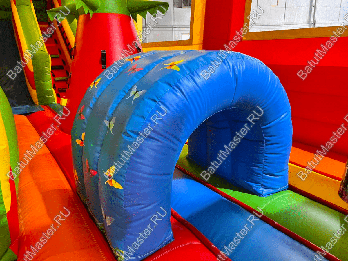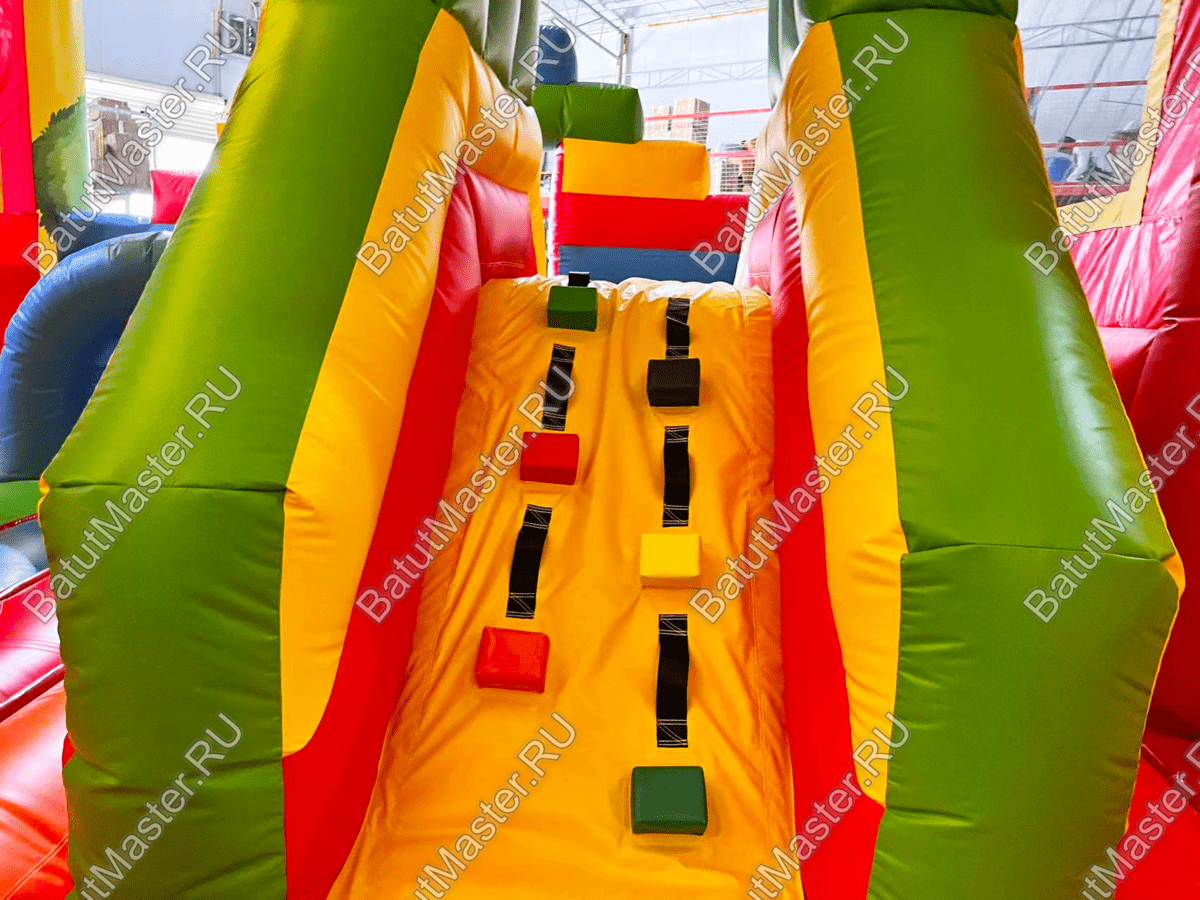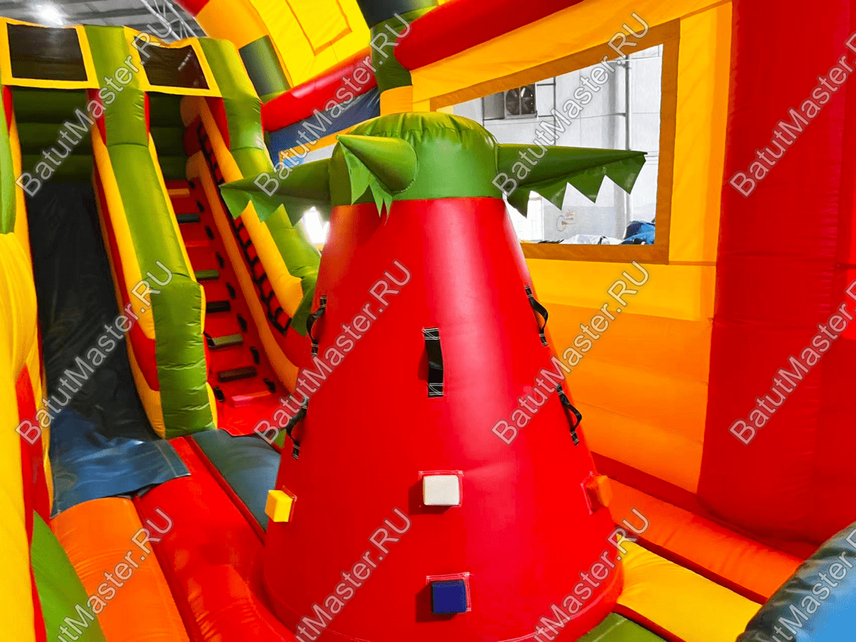 Попадая внутрь, малыши оказываются перед небольшой горкой с мягкими ступенями и гладким спуском. С другой стороны высится массивная скала в виде конуса с надувными выступами. Проходя дальше вглубь аттракциона, посетители попадают на прыгательную площадку, где расположена масса надувных элементов, но изюминкой этого комплекса остается высокая горка для смелых и отважных ребят.