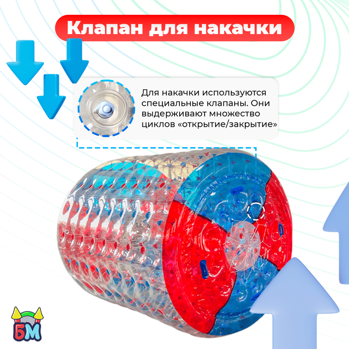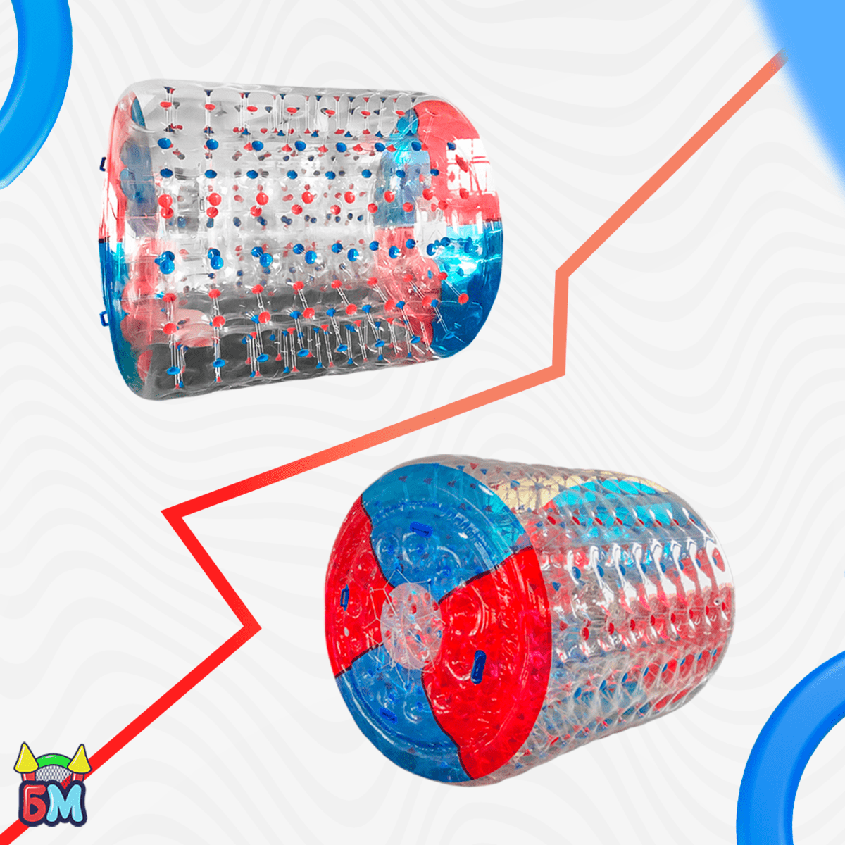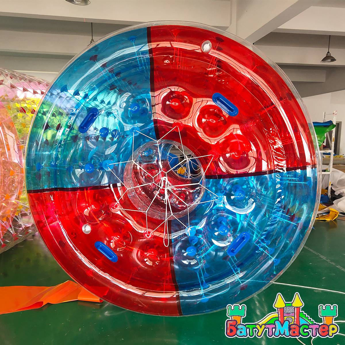 Водный роллер, или как его часто называют — гидророллер, аквароллер, водяное колесо — это надувной цилиндр, предназначенный для катания по поверхности воды. Он выполнен из прочного ПВХ, прозрачен по бокам и имеет яркие торцевые элементы, что делает его визуально привлекательным и интересным для пользователей. Пользователи входят внутрь конструкции и начинают двигаться, как хомяк в колесе. Это вызывает вращение роллера по воде и создаёт массу весёлых моментов.