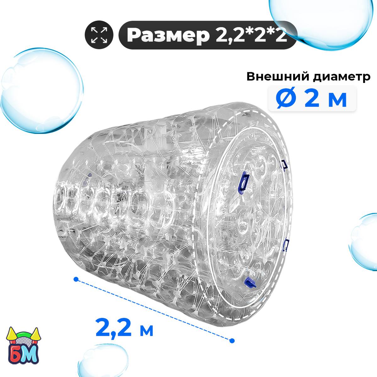 Это уникальный формат развлечений: надувной цилиндр из усиленного прозрачного ТПУ длиной 2,2 м и диаметром 2 м. Внутри легко размещаются два человека, которые бегут и вращают роллер по воде, словно хомячки в колесе! Такая конструкция дарит море смеха и драйва, ваш аттракцион будет заметен издалека — отличный способ выделиться среди конкурентов.
