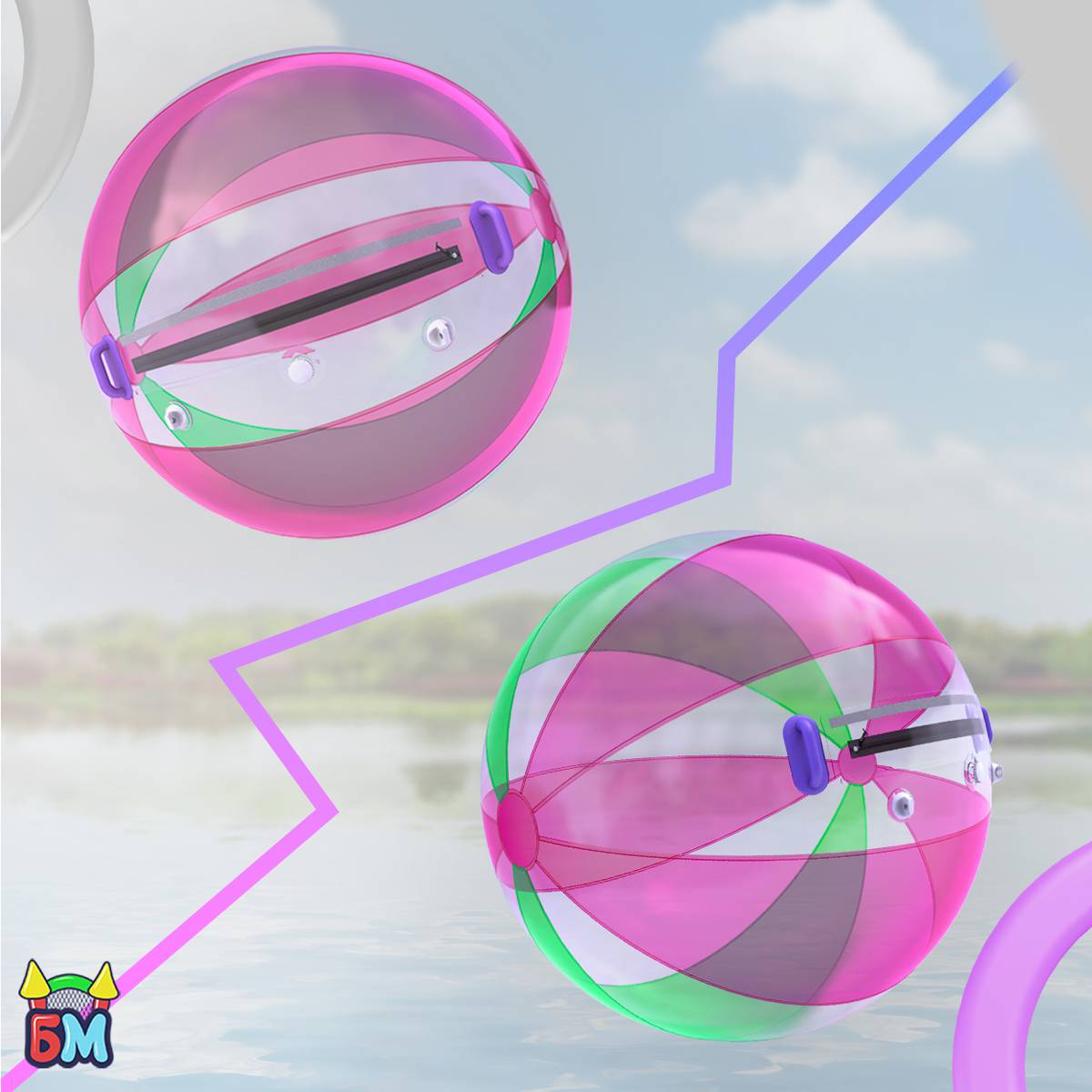 Представьте: тёплый день, звонкий детский смех, брызги воды и человек, уверенно шагающий по водной глади в прозрачном шаре! Этот эффектный момент притягивает взгляды и создаёт атмосферу праздника. Водный шар «Розово-зелёный» — магнит для клиентов, которые жаждут нового и необычного опыта.