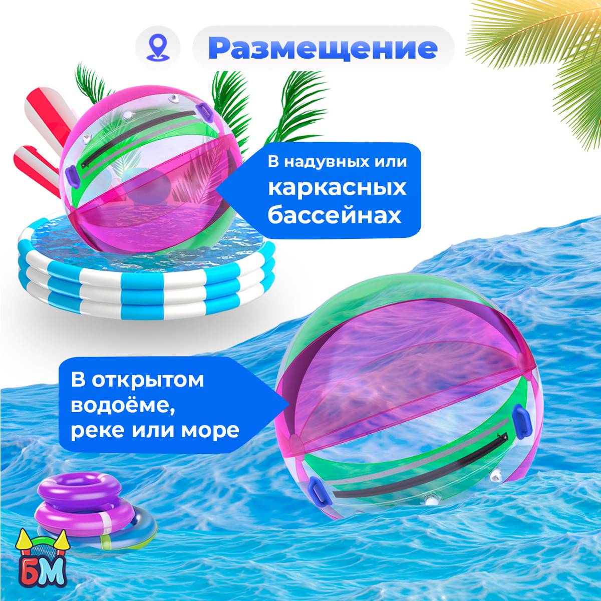 Вы можете использовать водный шар в самых разных местах. Главное условие — вода глубиной от 0,5 до 1 метра.