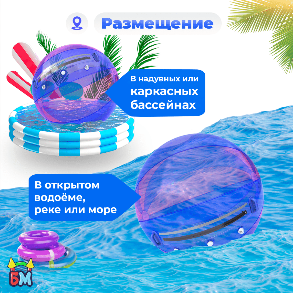 Вы можете использовать водный шар в самых разных местах. Главное условие — вода глубиной от 0,5 до 1 метра.