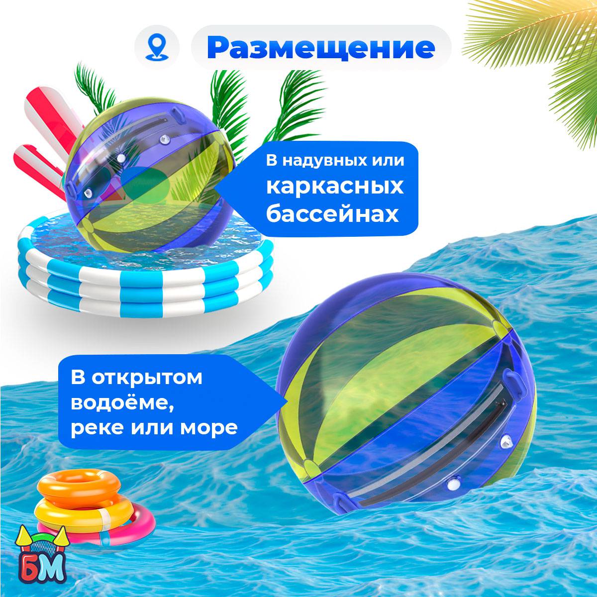 Вы можете использовать водный шар в самых разных местах. Главное условие — вода глубиной от 0,5 до 1 метра.