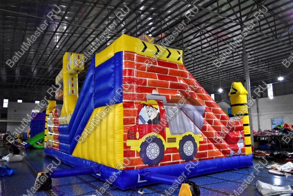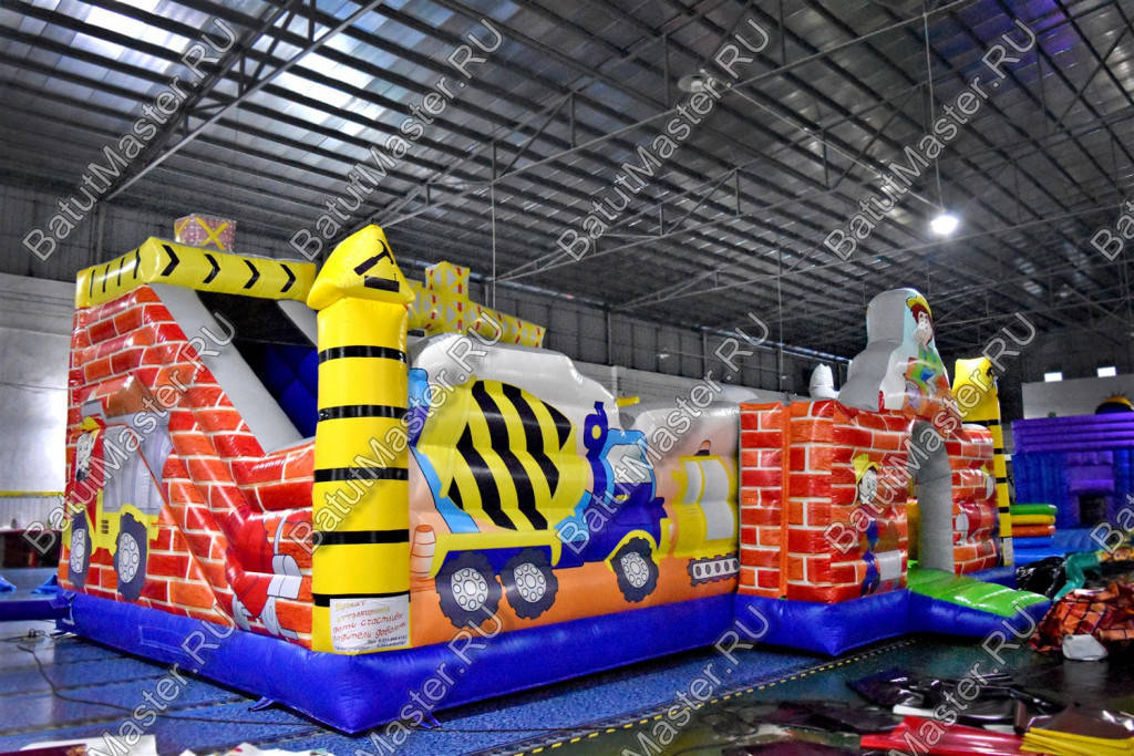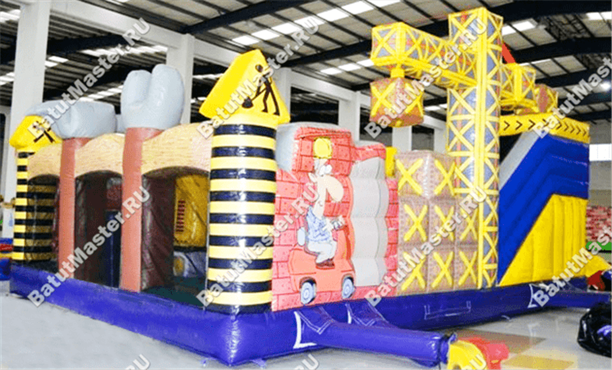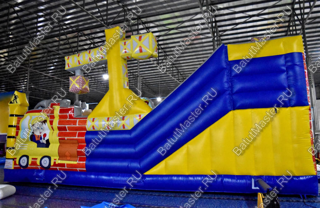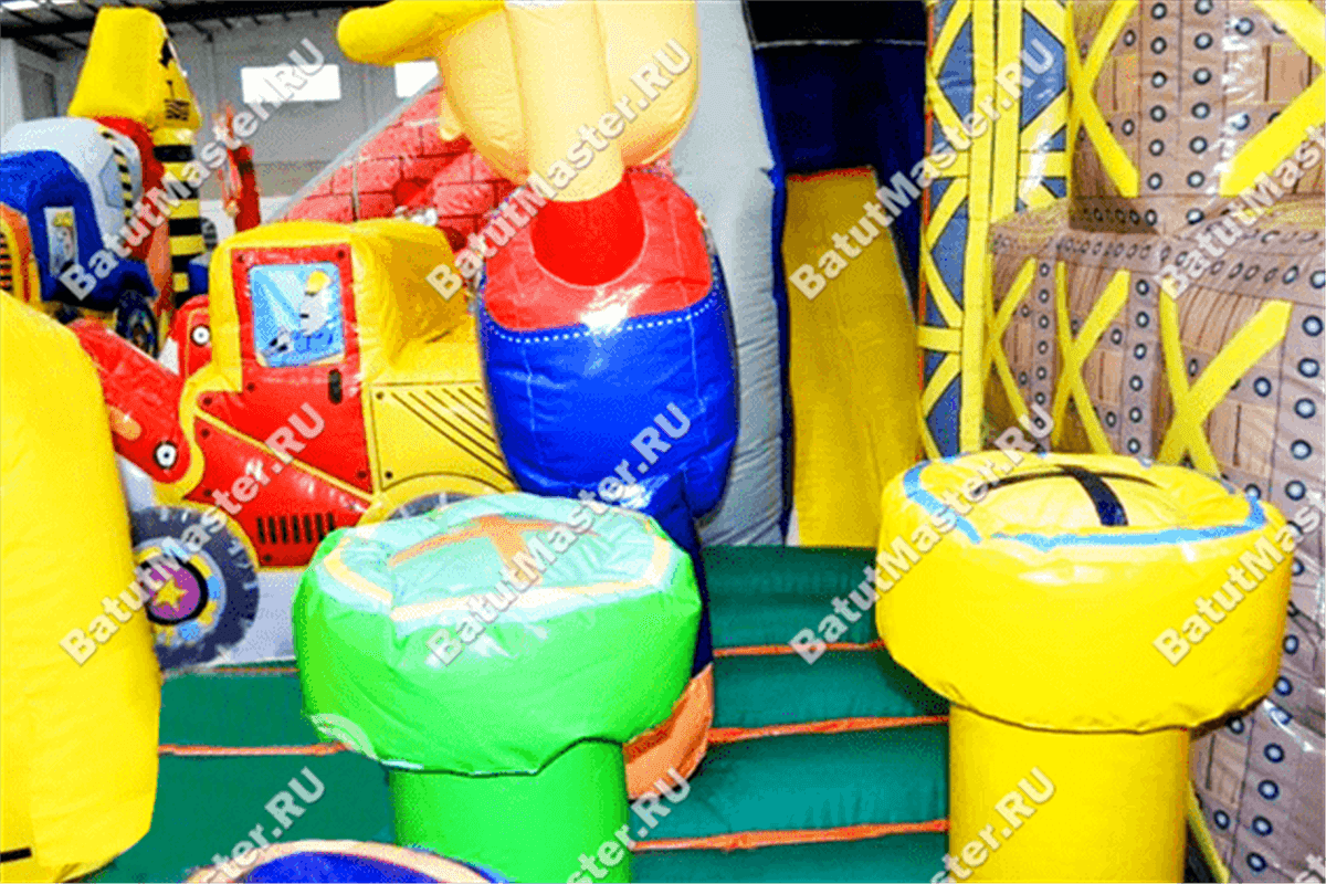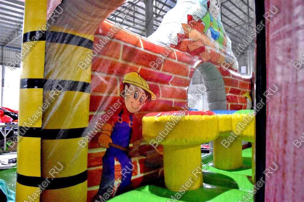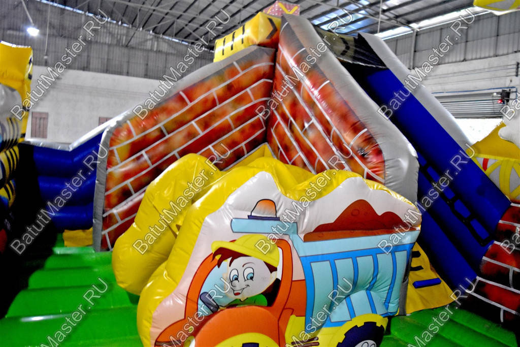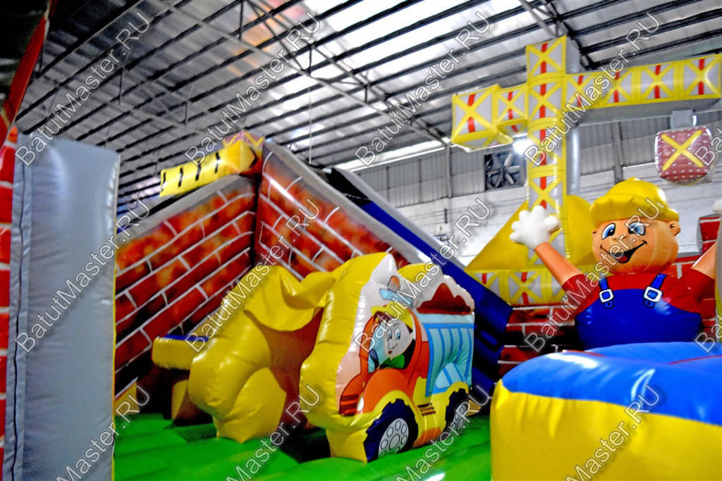 Внутри батут для бизнеса детей ожидает настоящее путешествие, которое обязательно осуществится благодаря внутреннему игровому наполнению в виде: надувных разноцветных болтов, фигуры строителя, машины и экскаватора. Одна из сторон батута оборудована фигурой надувного высокого крана, который сильно напоминает подъемное устройство из компьютерной игры. Но самая важная часть площадки находится в дальнем левом углу – это высокая горка, где лестница и спуск размещаются друг к другу под прямым углом. Стартовая площадка горки закрыта со всех сторон и даже имеет небольшие навесы из сетки, которые выступают над зоной спуска и лестницы. Высота горки – 3 м.