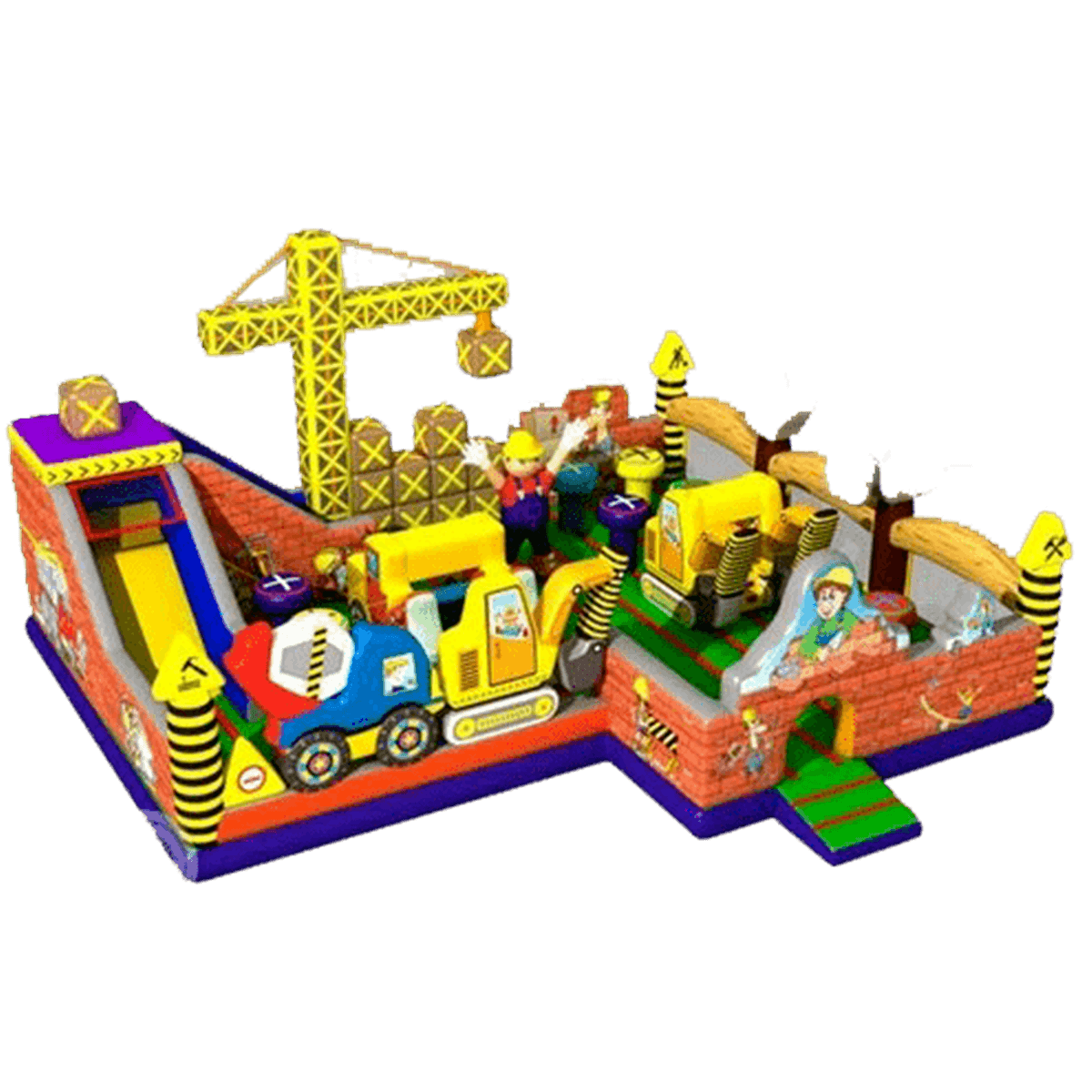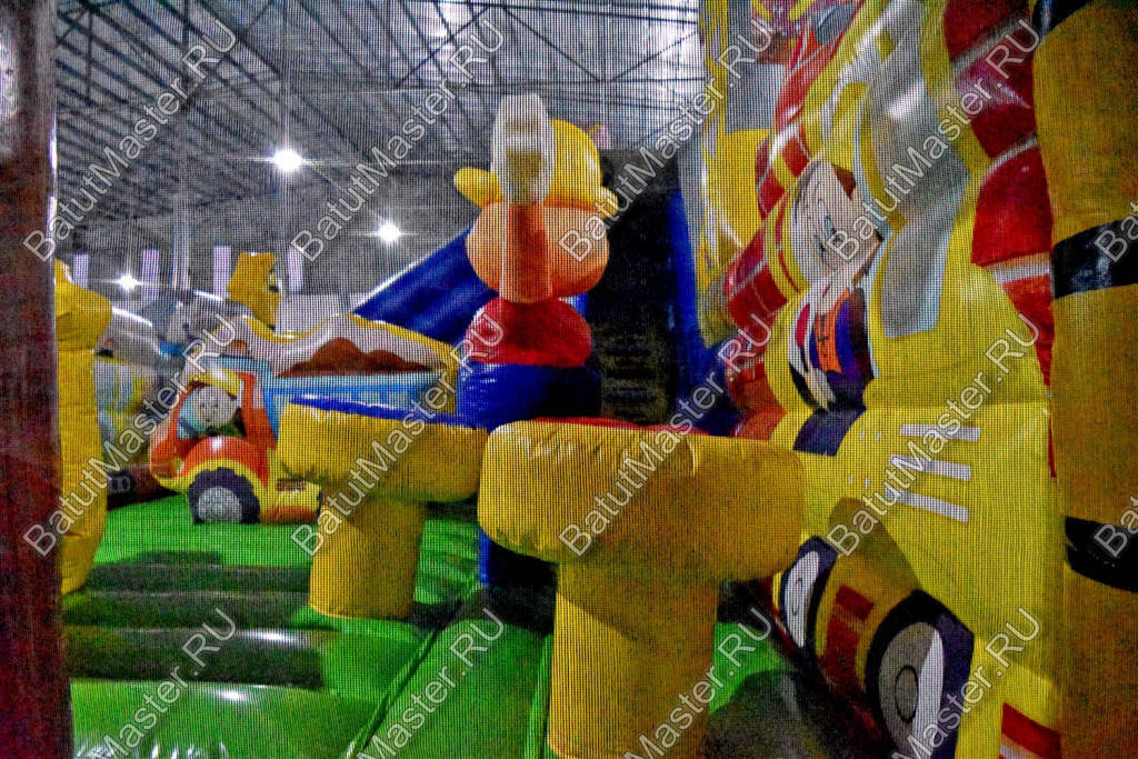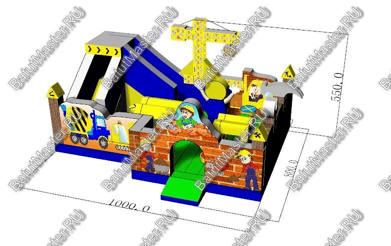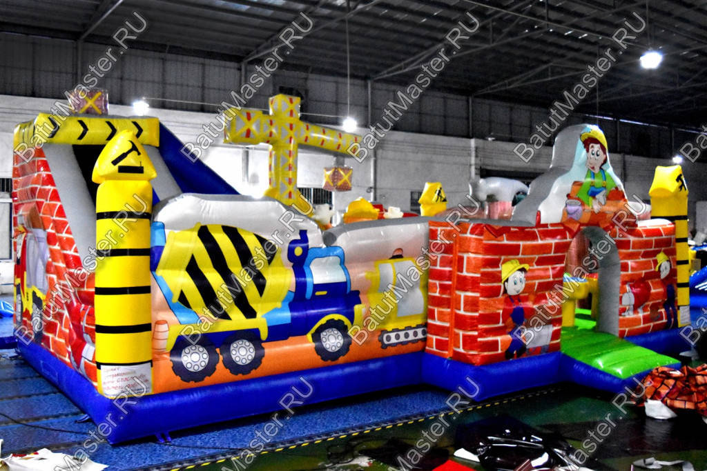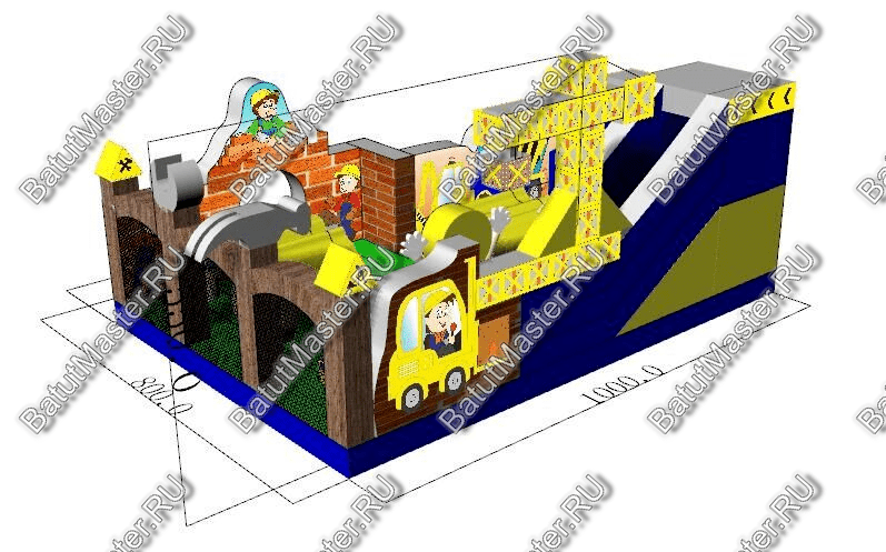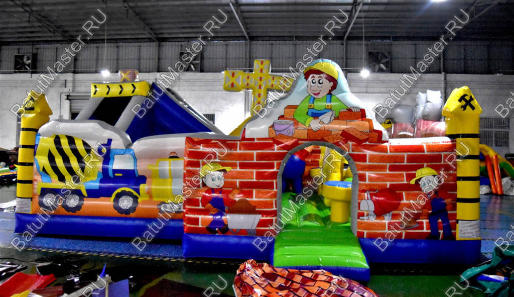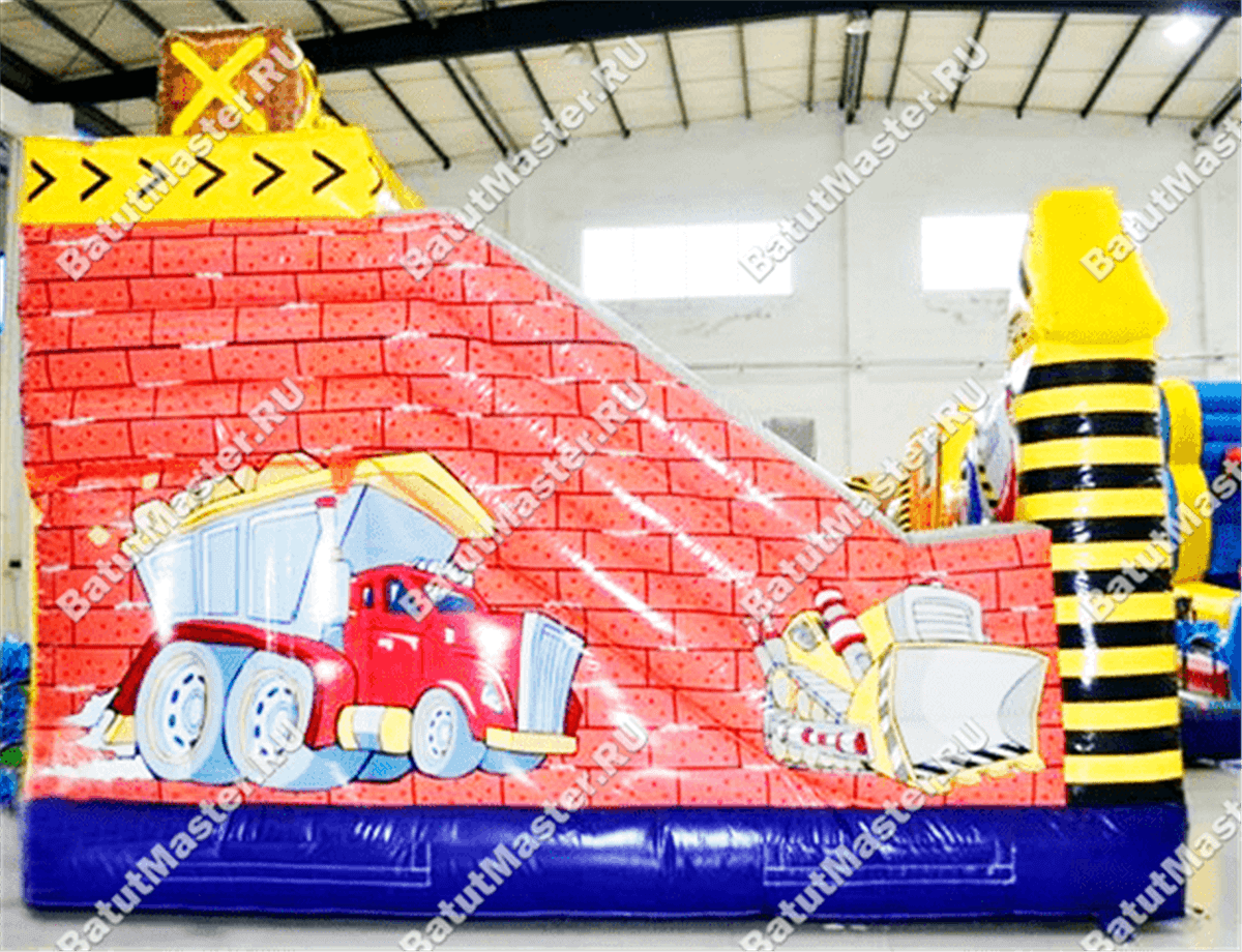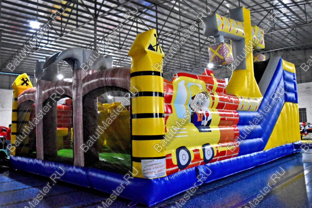 Внутри батут для бизнеса детей ожидает настоящее путешествие, которое обязательно осуществится благодаря внутреннему игровому наполнению в виде: надувных разноцветных болтов, фигуры строителя, машины и экскаватора. Одна из сторон батута оборудована фигурой надувного высокого крана, который сильно напоминает подъемное устройство из компьютерной игры. Но самая важная часть площадки находится в дальнем левом углу – это высокая горка, где лестница и спуск размещаются друг к другу под прямым углом. Стартовая площадка горки закрыта со всех сторон и даже имеет небольшие навесы из сетки, которые выступают над зоной спуска и лестницы. Высота горки – 3 м.