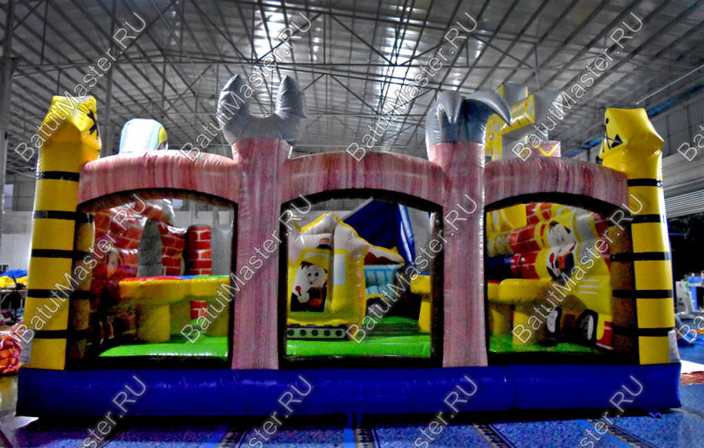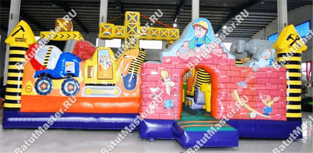 Этот удивительный надувной батут не похож на все остальные, так как представлен в виде настоящей рабочей площадки со строителями. Поэтому и вход в данный коммерческий аттракцион представлен надувной стенкой в стиле кирпичной кладки, внутри которой имеется арка, а по сторонам и сверху изображены трудолюбивые строители с инструментами труда. Продолжение фасада изображает спецтехнику. Правая стенка – полностью прозрачная и состоит из высоких розовых арок, внутри которых натянута сетка. Верх этой конструкции украшает имитация железных инструментов мастеров.