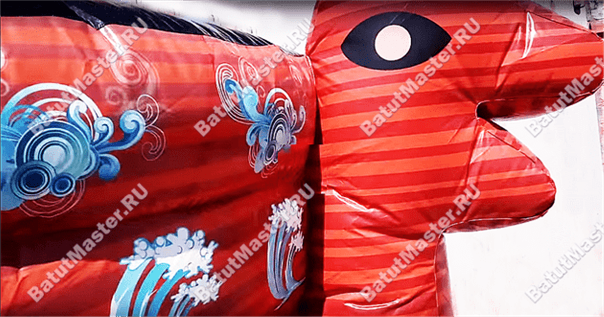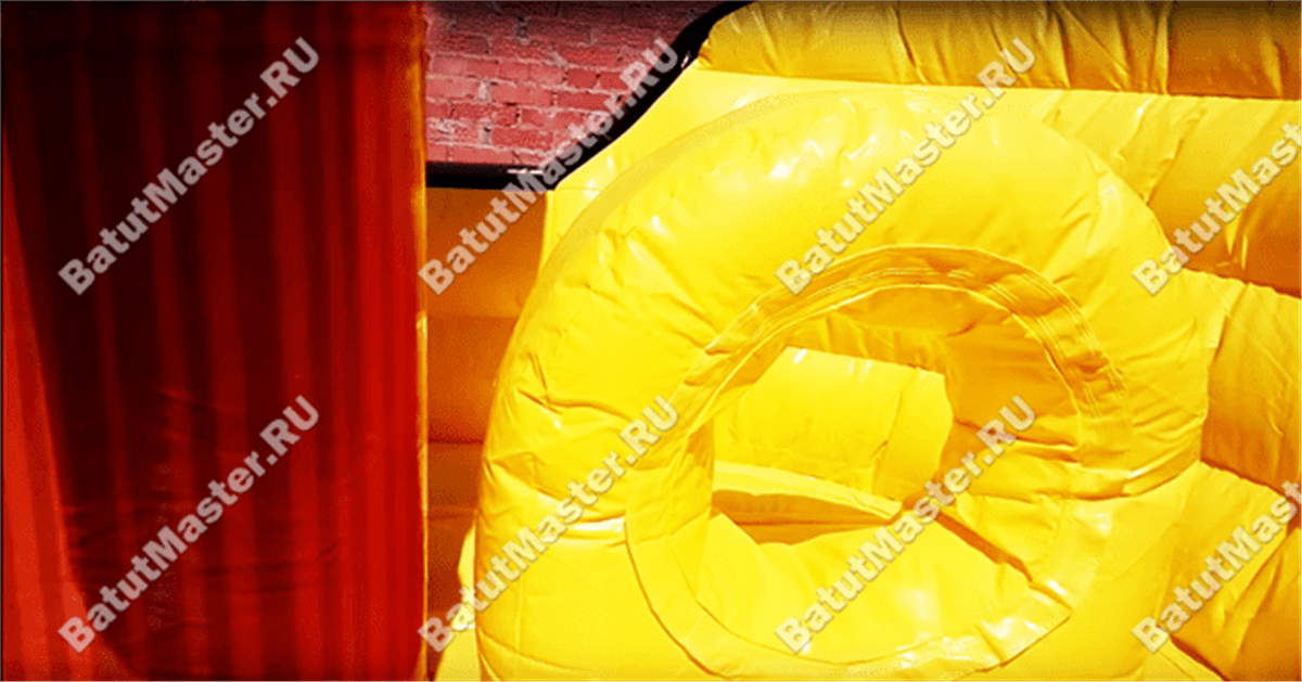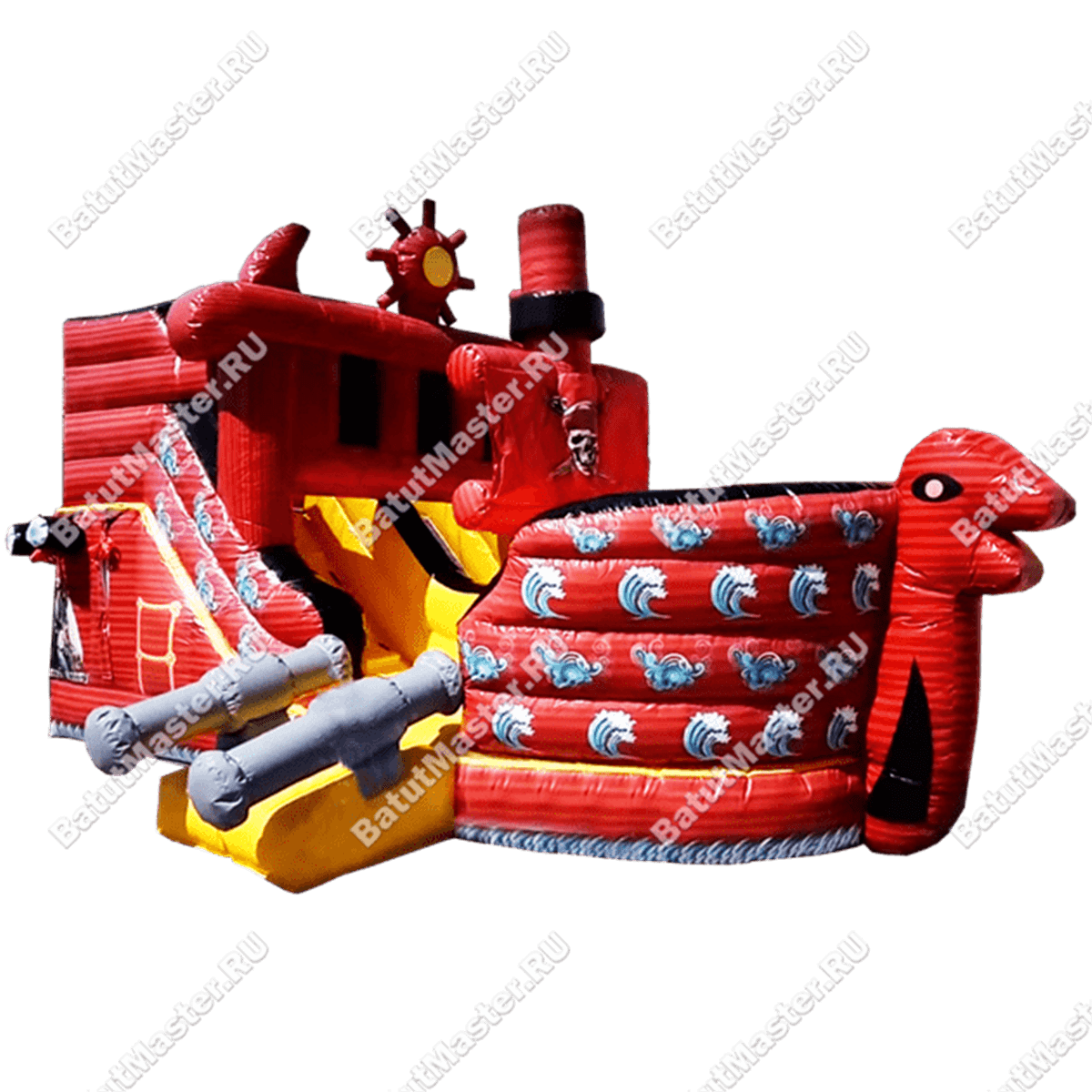 Благодаря сочетанию красного и желтого цвета батут получился очень яркий и насыщенный, внешняя часть бортов украшена изображениями волн, внутри палуба оборудована дополнительными игровыми фигурами из ПВХ.