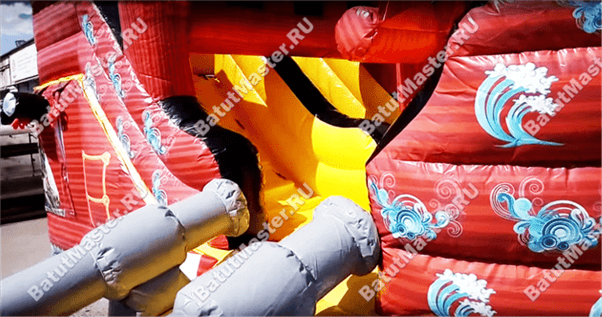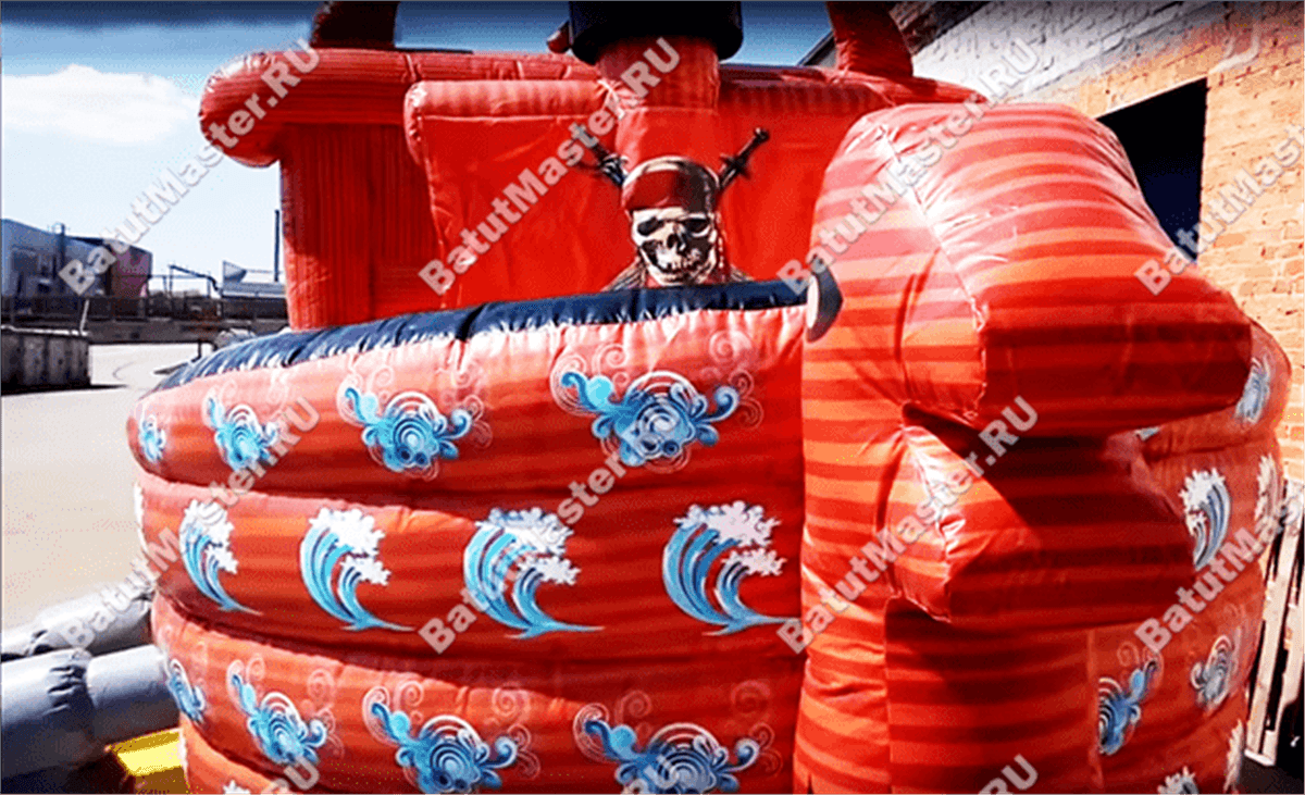 В данном коммерческом аттракционе присутствуют некоторые детали, которые делают его правдоподобным и приближают к реальной конструкции. Поэтому на территории батута мы можем встретить пушки из серого ПВХ, надувную голову змеи, с которой и начинается корабль, высокую мачту с флагом и изображением пирата, штурвал и т. д.