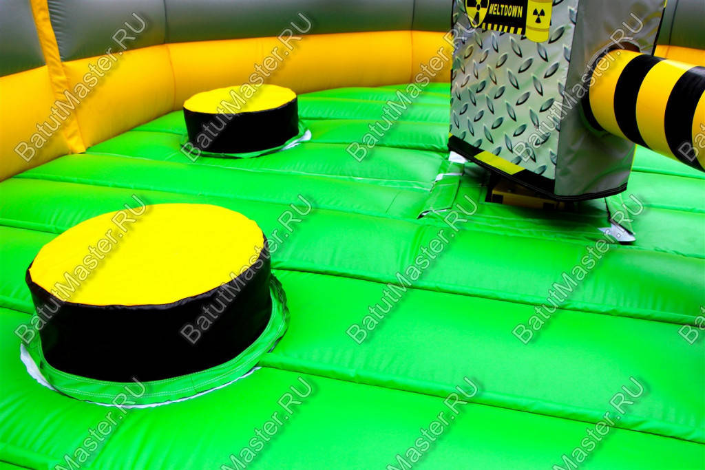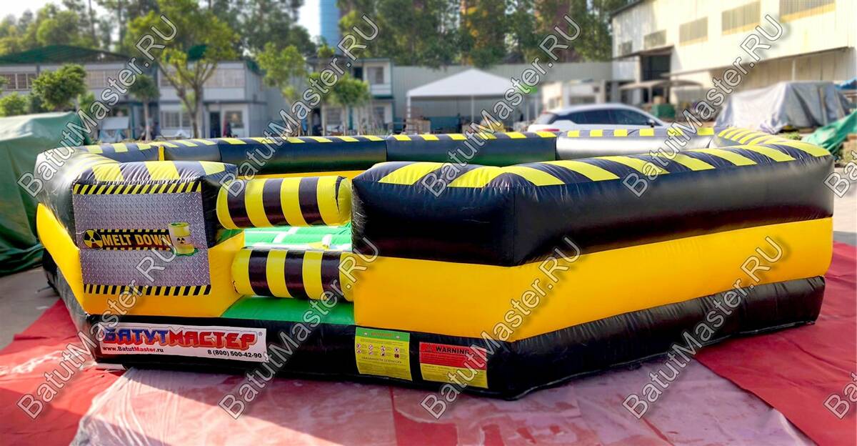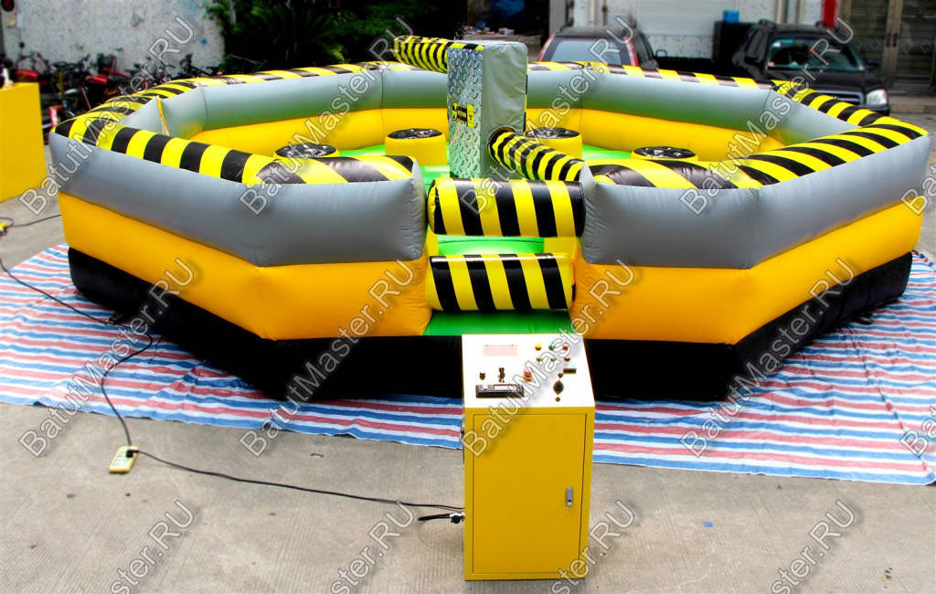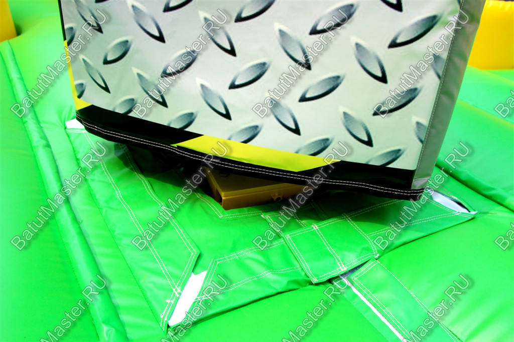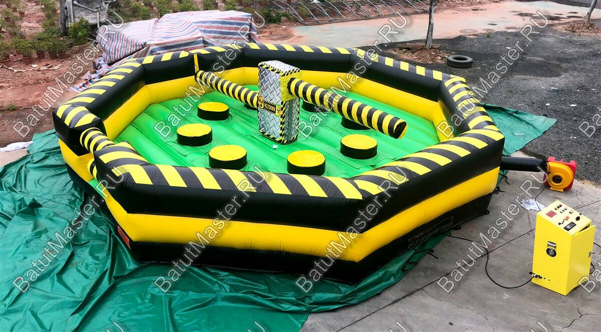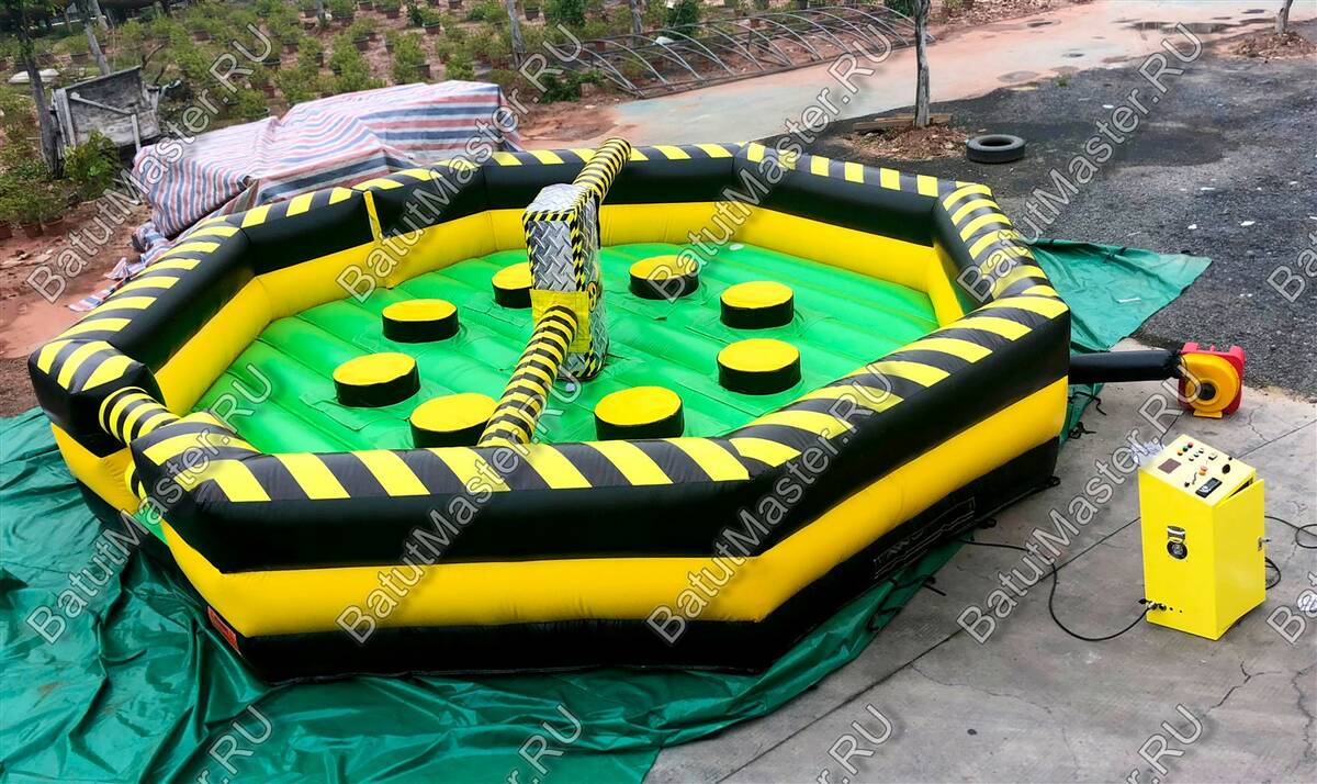 Увлекательная игра, представленная данным надувным батутом, напоминает восьмиугольный циферблат часов, по которому двигаются две стрелки. Но на самом деле это коммерческий аттракцион из ПВХ в виду надувной открытой площадки в желто-черной расцветке. По периметру надувного ограждения надувная игра оборудована несколькими проемами, через которые можно попадать внутрь аттракциона.