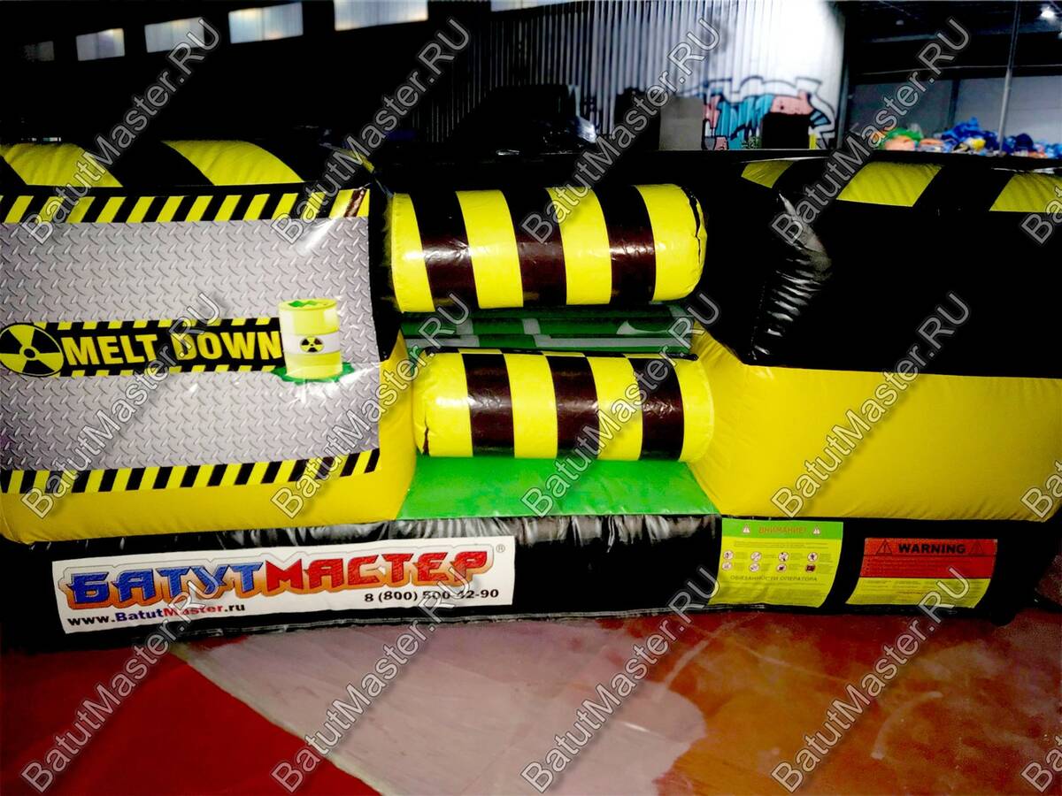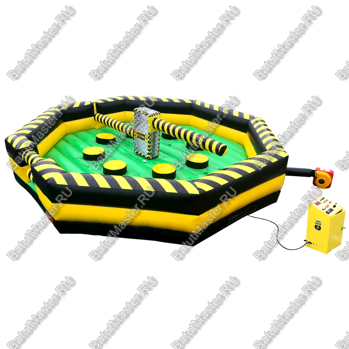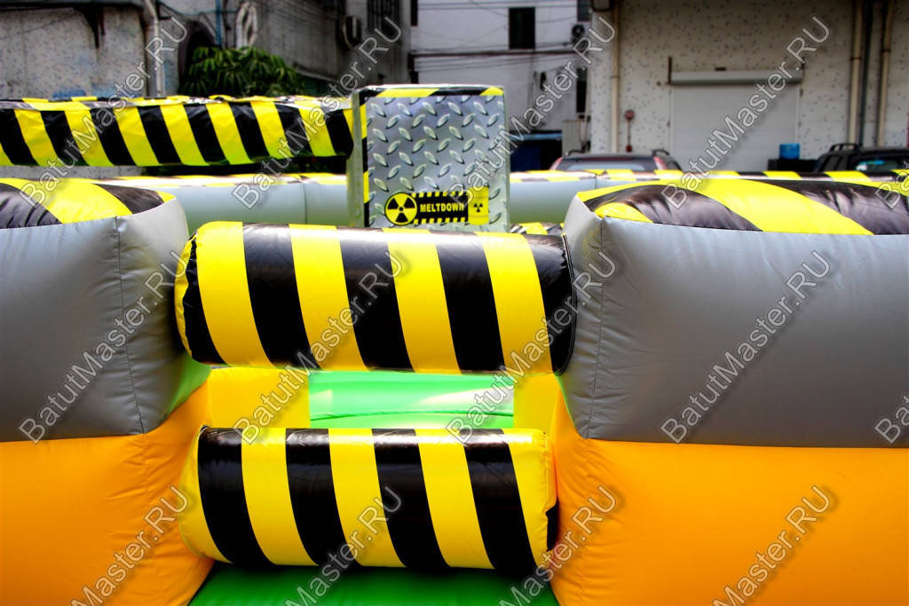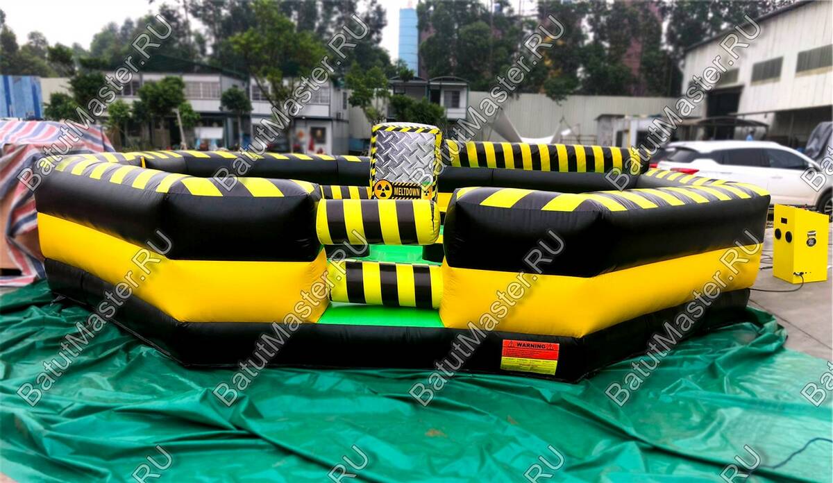Увлекательная игра, представленная данным надувным батутом, напоминает восьмиугольный циферблат часов, по которому двигаются две стрелки. Но на самом деле это коммерческий аттракцион из ПВХ в виду надувной открытой площадки в желто-черной расцветке. По периметру надувного ограждения надувная игра оборудована несколькими проемами, через которые можно попадать внутрь аттракциона.