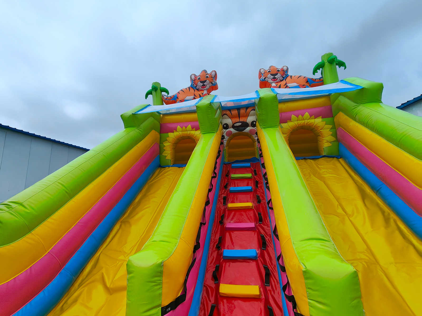 Коммерческий надувной батут «Тигриная страна» изготовлен из усиленного армированного ПВХ, плотностью 690 г/м² и толщиной 0,55 мм. Это гарантирует надёжность, устойчивость к износу и погодным условиям от -15 до +65°C. Батут не имеет крыши, но её высота (5 м) позволяет эффективно использовать внутренний объём: дети могут свободно прыгать, бегать, лазать и скатываться.