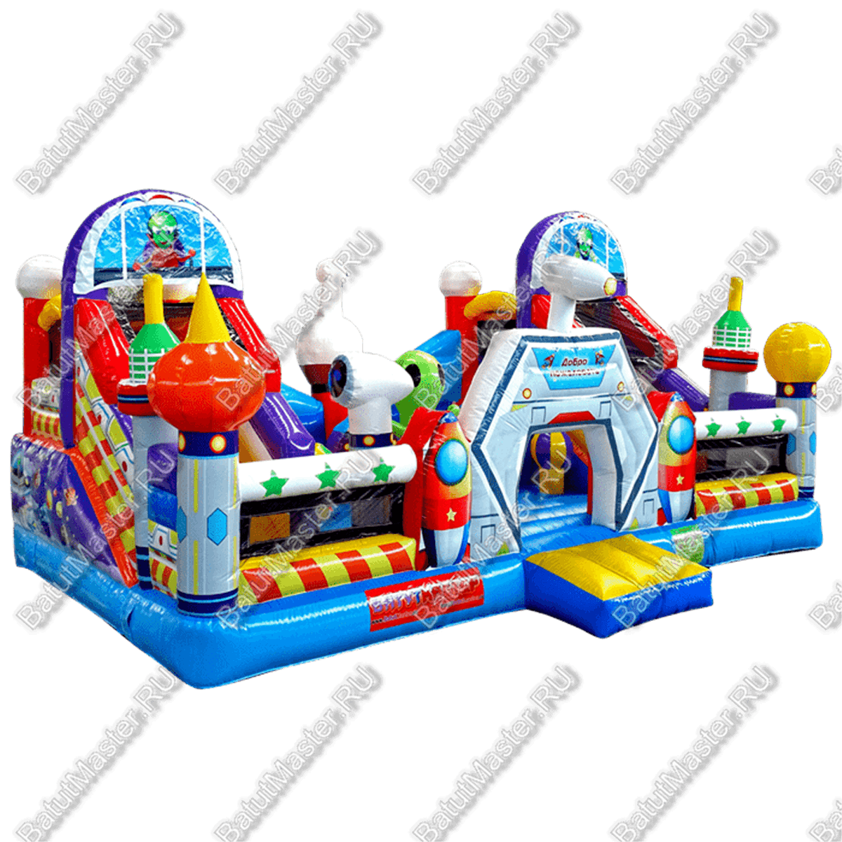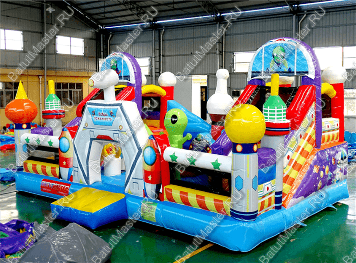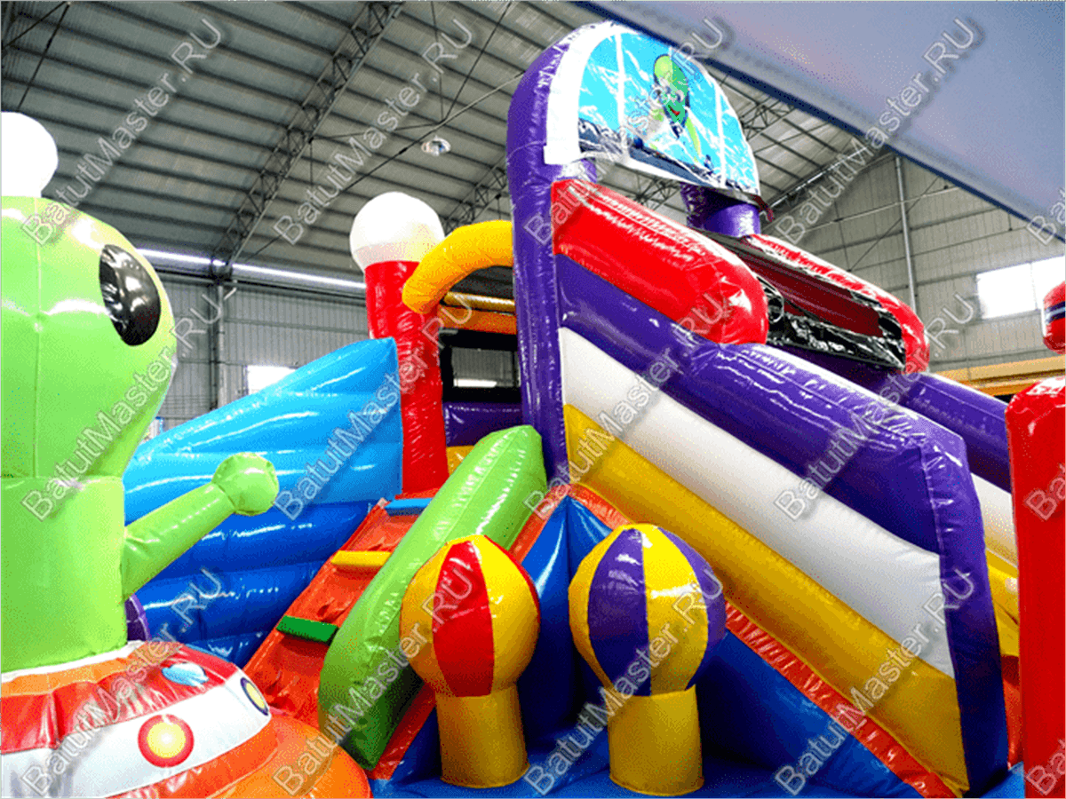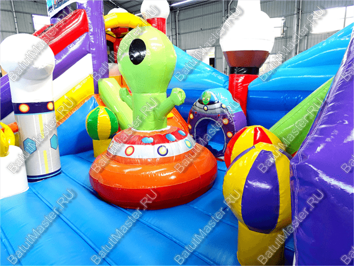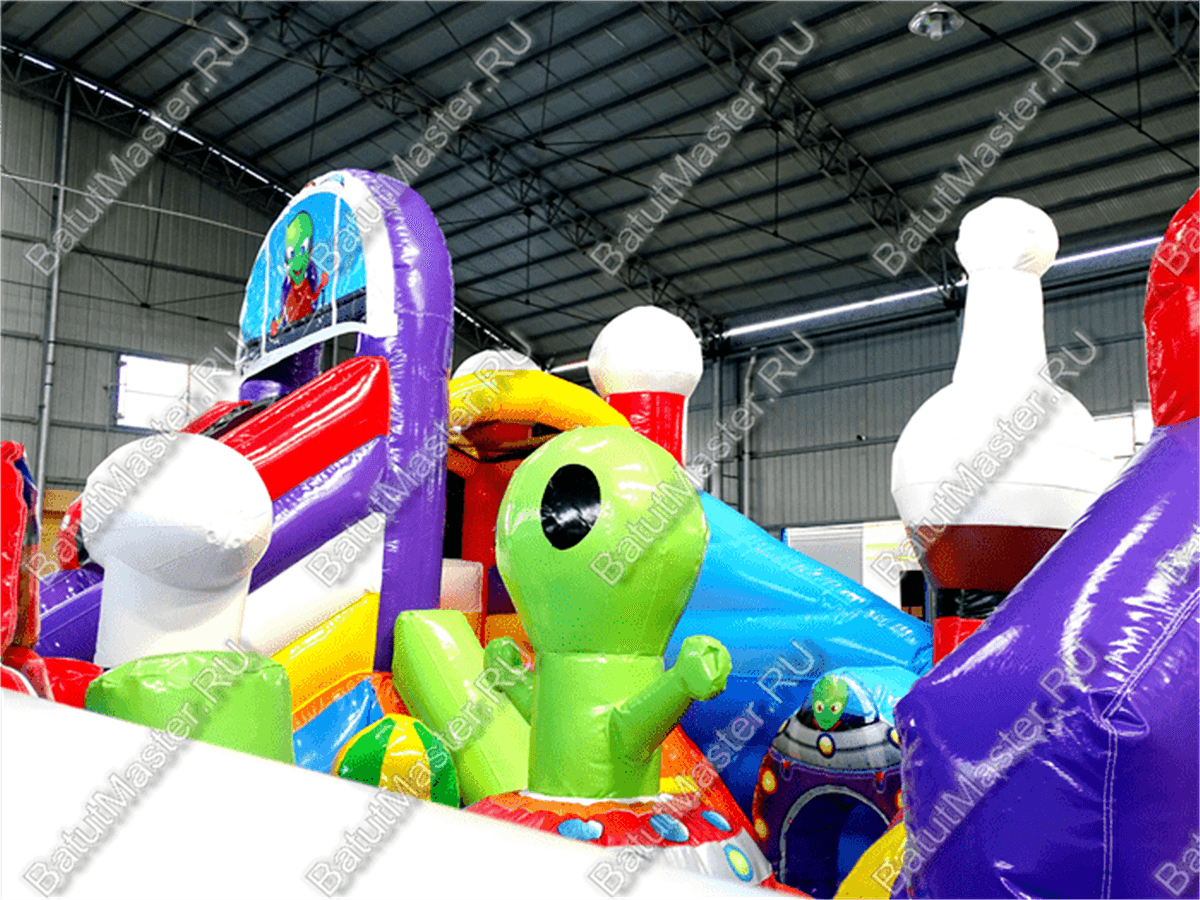 Этот по-настоящему большой батут имеет один вход, выполненный как вход в отсек космического корабля. Ещё на «страте» аттракциона детей восхитят возвышающиеся тут и там башни и фигуры дружелюбных пришельцев.