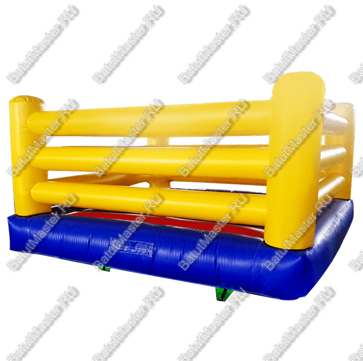 Нижняя часть, платформа, изготовлена из синего ПВХ, верх этого слоя – красный. Батут смотрится пестро и оригинально. Помимо шуточных боев внутри аттракциона можно кувыркаться, танцевать, прыгать или бегать, но не одно из движений ребенка не сможет причинить вред другому малышу. Батут для бизнеса полностью нагнетается при помощи 1 насоса (идет в комплекте с аттракционом абсолютно бесплатно). Игровая площадка не имеет верхнего тента, но вы можете отдельно заказать в БатутМастер такую дополнительную конструкцию, если решите разместить батут на улице.
