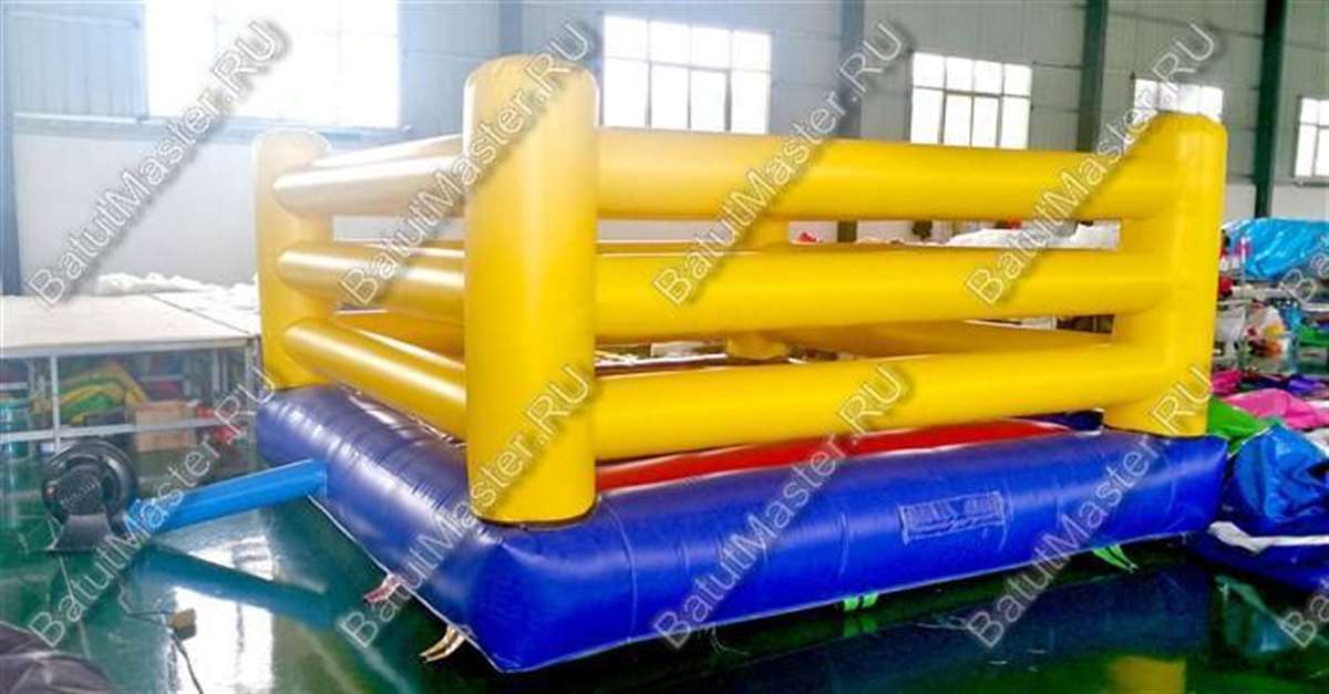Яркий, простой и качественный – вот 3 составляющие, которыми можно охарактеризоваться представленного надувного батута. Конечно, основная тема данного аттракциона «Бокс», но прыгательную площадку можно использовать и как обычный коммерческий батут. Для увлекательности площадку рекомендуется дополнить надувными игровыми элементами, например, в виде мячей. Все 4 стороны оборудованы желтыми надувными перекладинами, через которые невозможно пробраться без помощи взрослых. Внутри – безопасное пространство, в котором также можно устраивать боевые спарринги (они пройдут безопасно для детей, так как пружинящая поверхность не даст возможности нанести сильный удар).