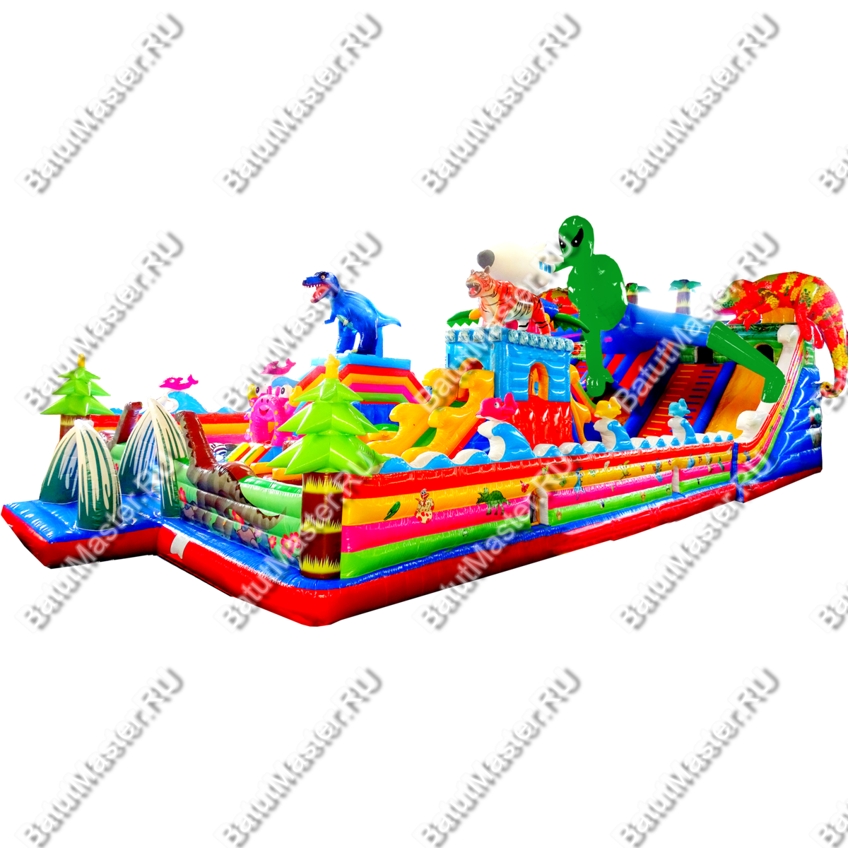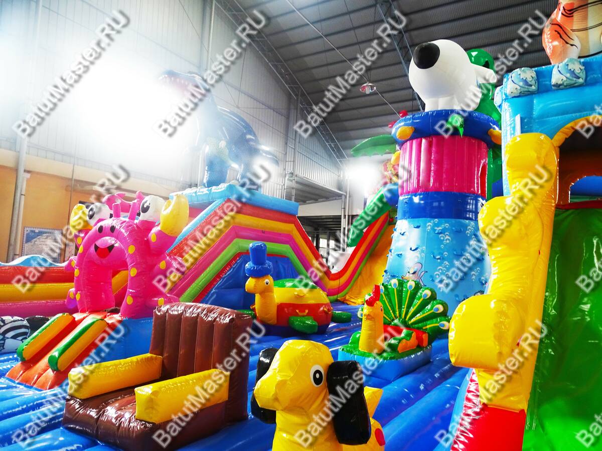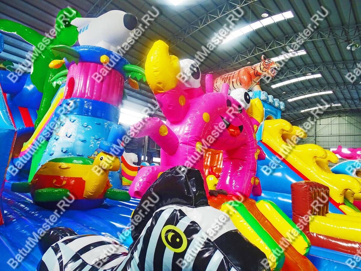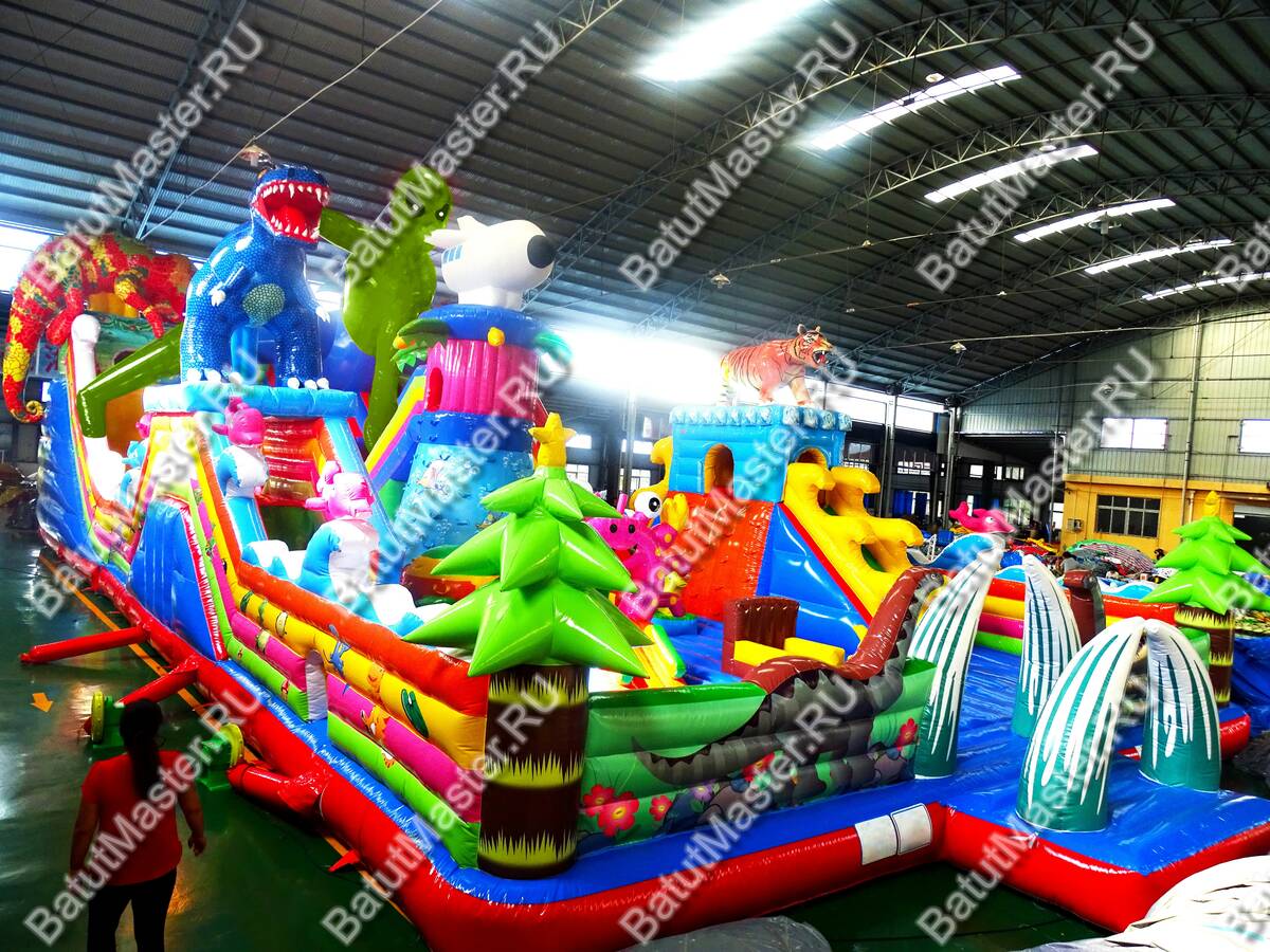 Коммерческий батут украшают многочисленные яркие элементы, сказочные персонажи, животные и забавные фигуры. Внушительный размер позволяет бегать и изучать территорию игрового комплекса долгое время. Дети будут счастливы от интересного наполнения комплекса. Здесь имеются: горки, ступеньки, качалки, домики, тоннели, скалодром и многое другое. На входе малышей встретят яркие зеленые елочки и клыки мамонта, напоминающие ледниковый период. От ярких цветов просто разбегаются глаза. Это идеальный надувной батут для детей разного возраста. Специалисты разработали зоны так, чтобы играя, дети могли проходить препятствия друг за другом, а также соревноваться между собой.