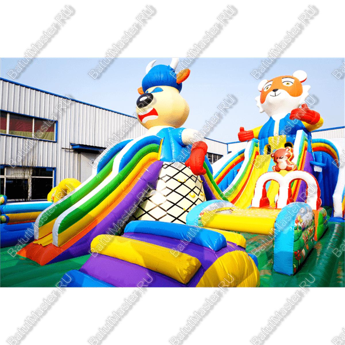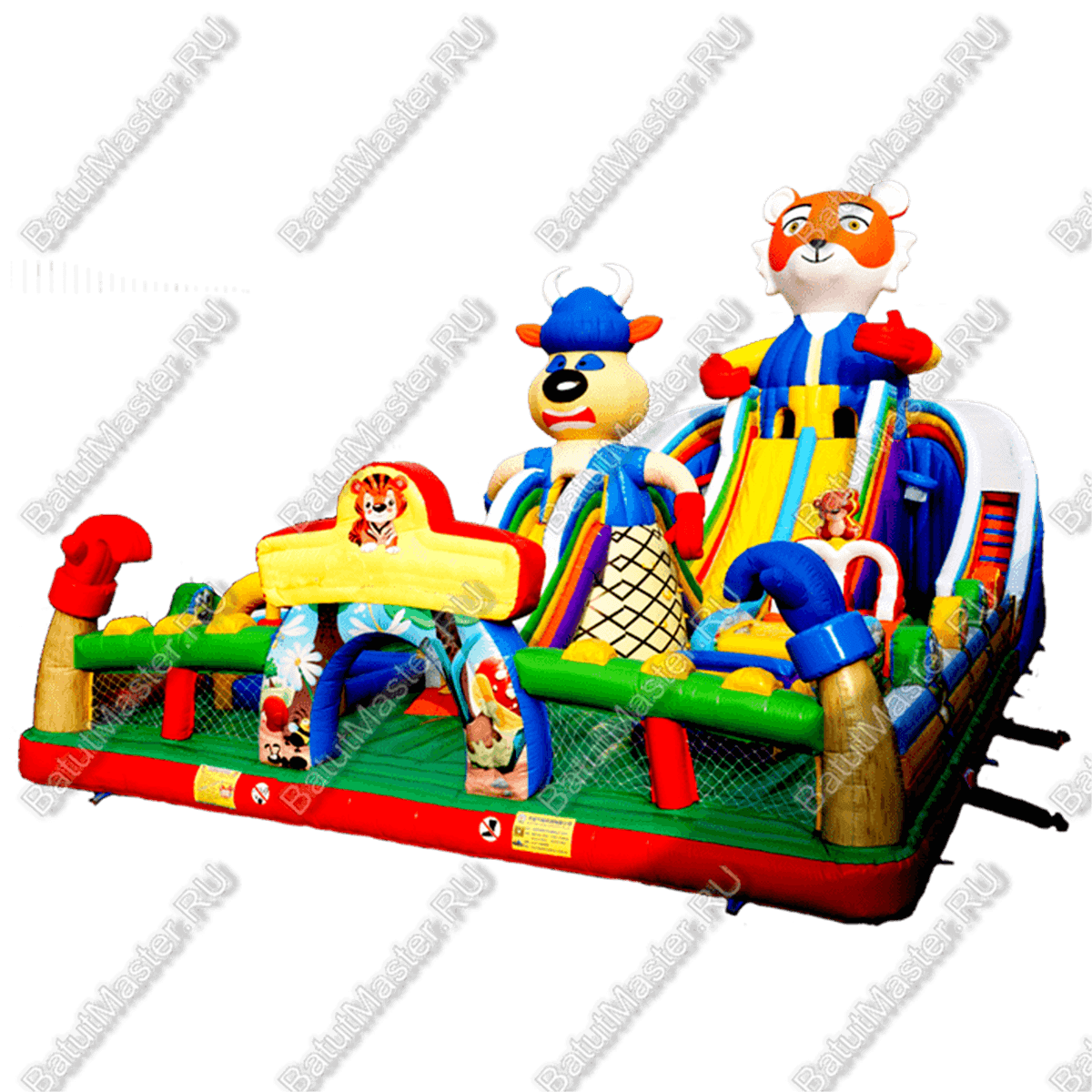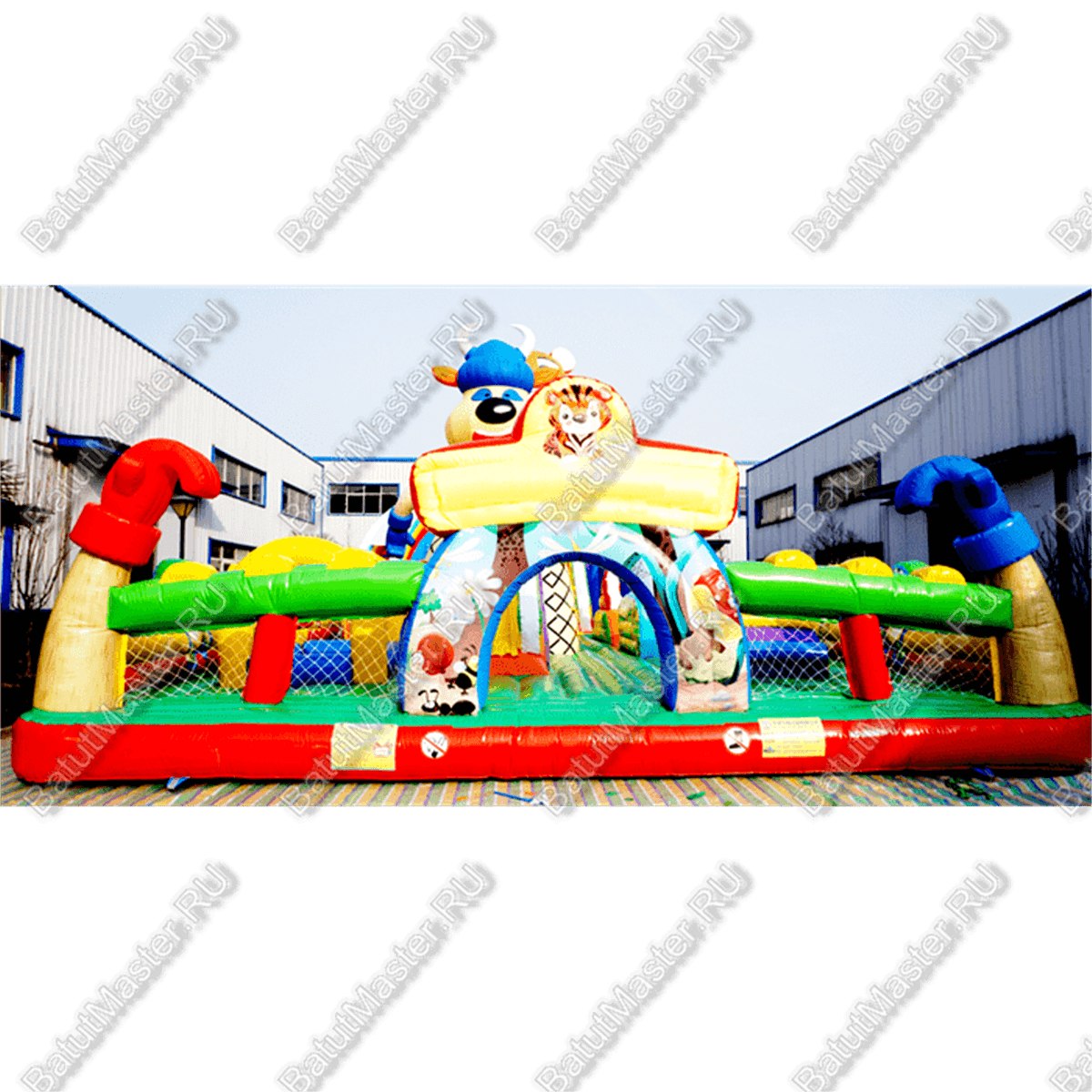 Тематический, интересный надувной батут для детей отличается разнообразными модулями и локациями для активных игр. Здесь есть зоны для прыжков, подъемов и спусков, а также лазаний. За одной горкой следуют еще две, вверху которых имеется домик с маленькими входами. Играть в прятки здесь также есть где. Два огромных модуля в виде животных видны издалека. Препятствия, которые имеются на батуте, развивают ловкость, силу, координацию и выносливость. Разнообразная цветовая гамма комплекса привлечет детей. Играть и резвиться здесь могут одновременно несколько юных непосед, и каждый найдет занятие по душе.