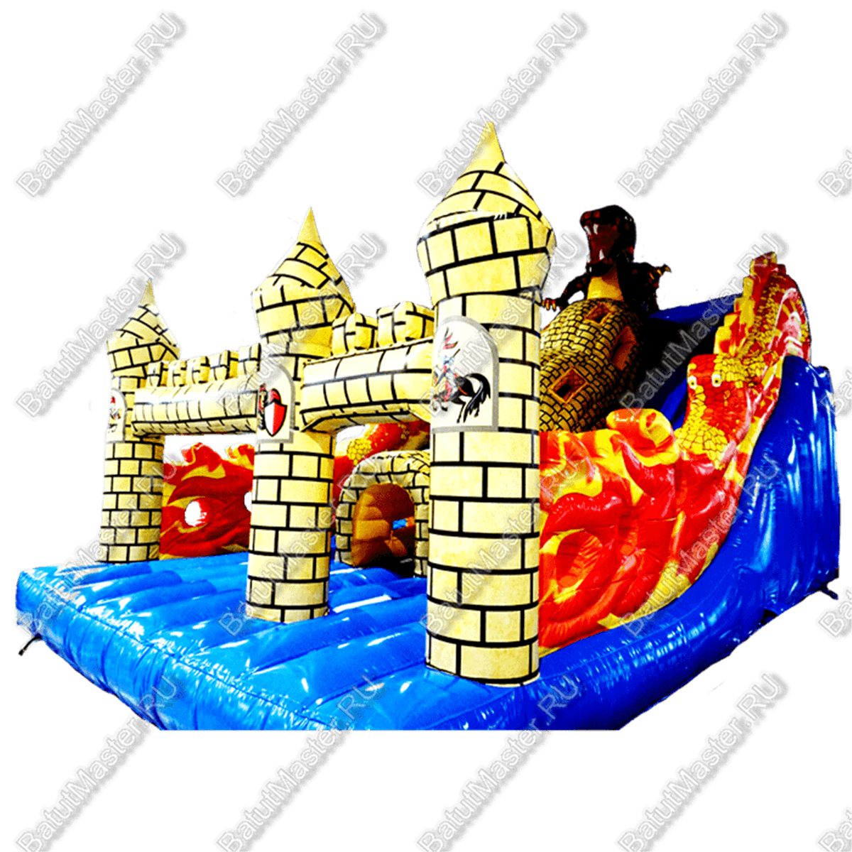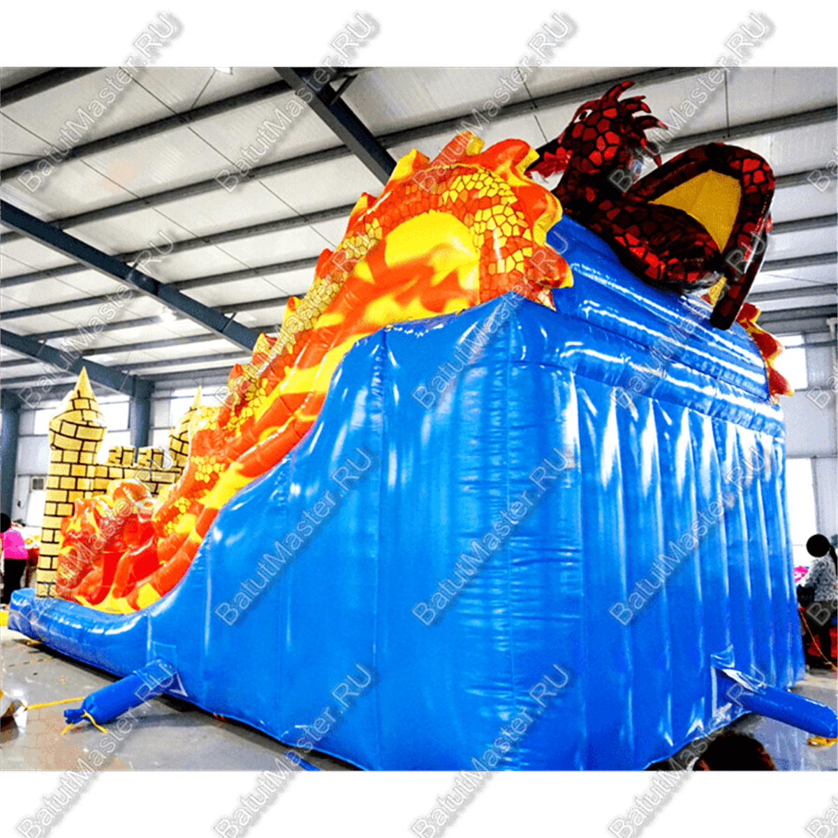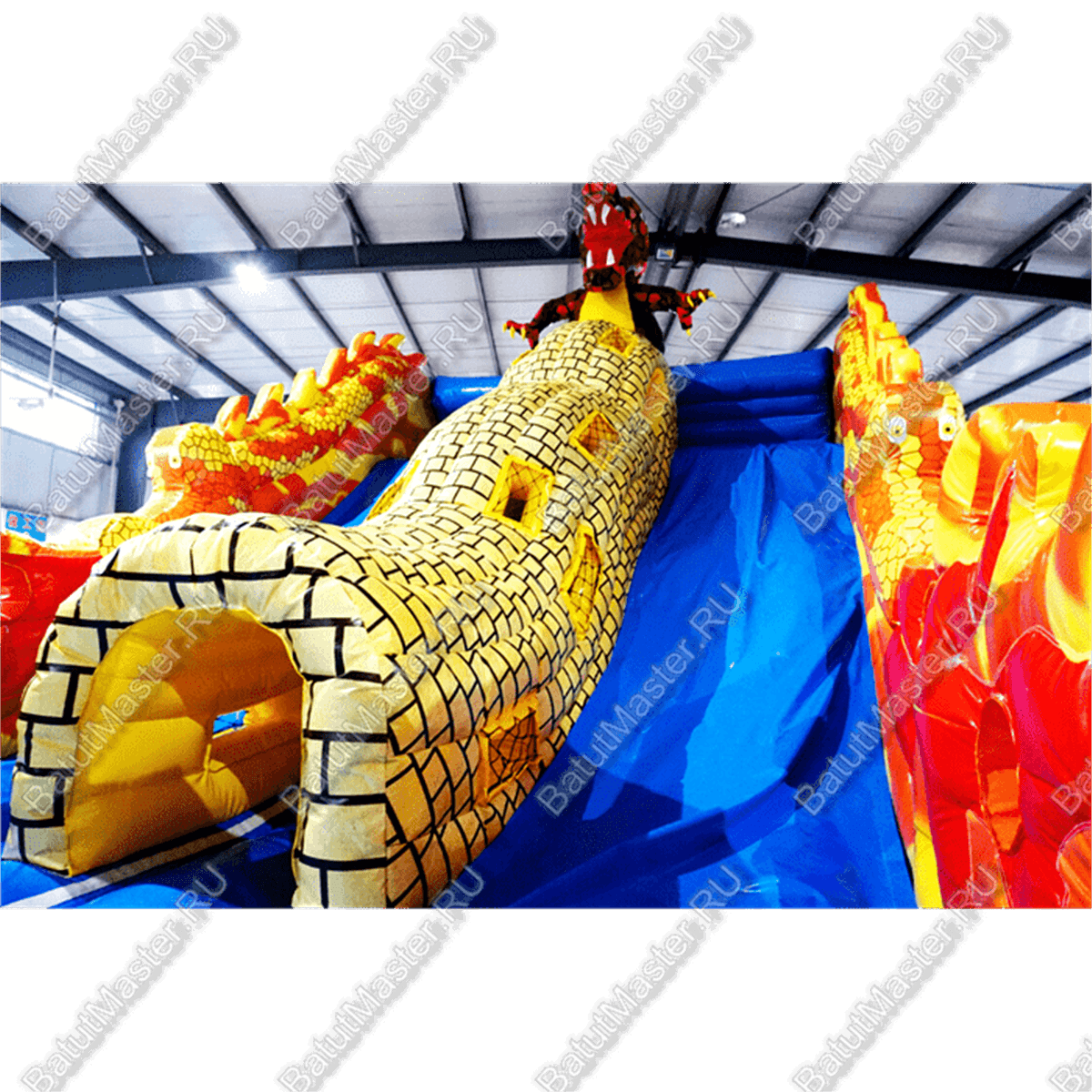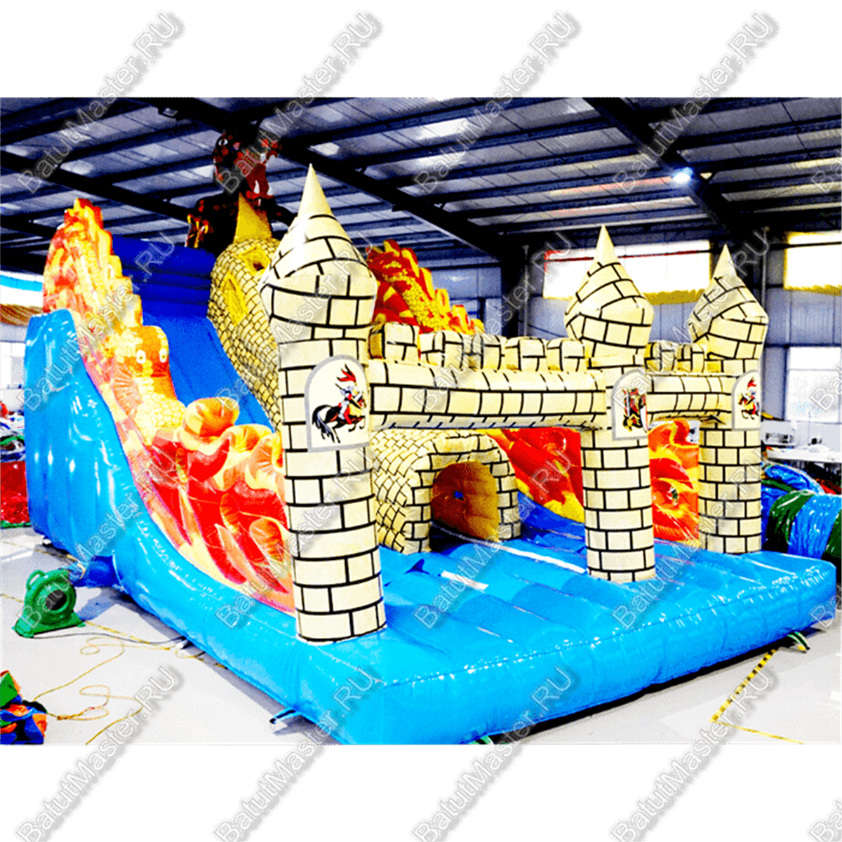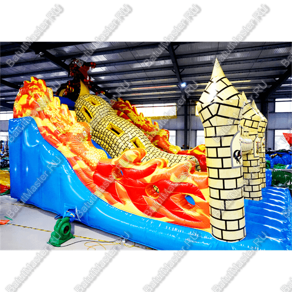 Для бизнеса данный аттракцион хорош тем, что он, по сути, универсален. Помимо того, что на нём можно просто попрыгать или же побегать, батут предлагает деткам прокатиться с мягкой голубой горки. При этом чтобы скатиться с неё, детям нужно сначала залезть наверх по большому жёлтому тоннелю, который выполнен в виде кирпичной стены с отверстиями. Наверху поджидает огромный и сильный дракон, но не стоит его бояться. Он наоборот очень рад приходу детей. Горки окружены стенами, сделанными как яркий пылающий огонь. Язычки пламени добавляют живости и реализма аттракциону. Снизу полно пространства для удачного приземления, ребёнок не сможет уехать дальше пределов батута.