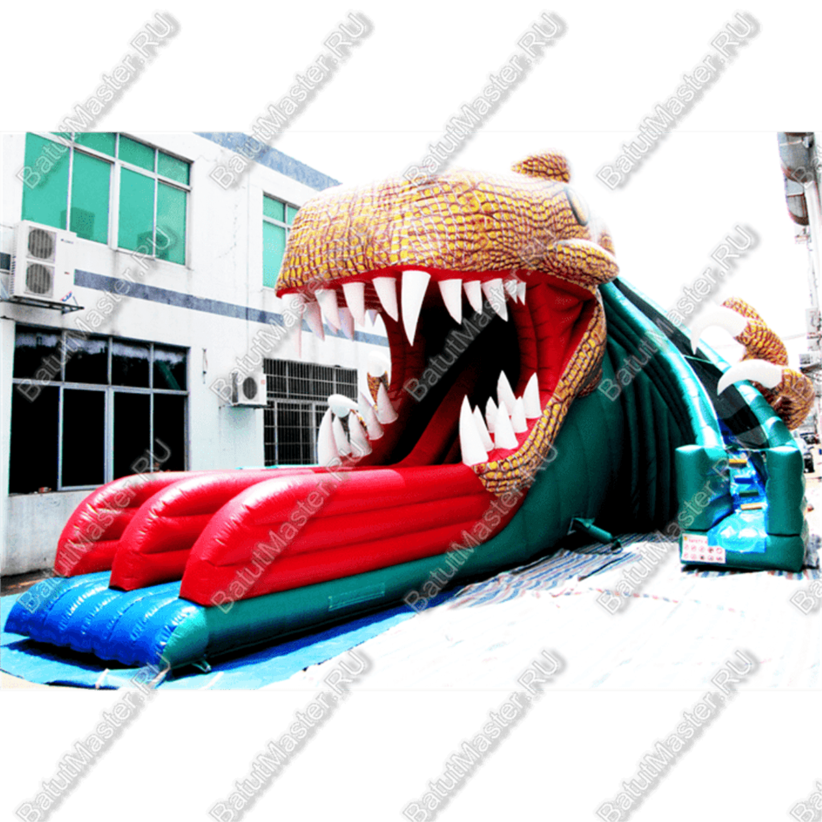 Надувной батут «Пасть динозавра» представляет собой большую горку, которая проходит через голову динозавра. Для того, чтобы оказаться, ребёнку предстоит забраться по одной из двух лестниц, находящихся с разных сторон от головы. Поднимаясь по лестнице, он пройдёт мимо большой когтистой лапы динозавра, что, несомненно, порадует любителя этих древних ящеров. Поднявшись по лесенке, ребёнок попадёт внутрь огромной головы, чтобы скатиться прямо из широко распахнутой пасти. Проезжая мимо белых острых зубов, ребёнок может представить, что он обхитрил динозавра.