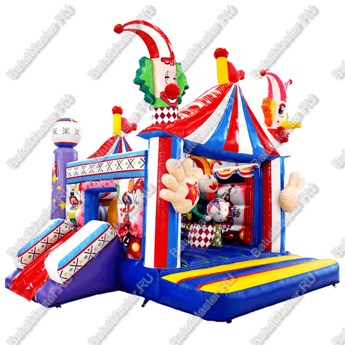Необычный, разноцветный надувной батут в стиле веселого цирка непременно порадует каждого ребенка. Модули в виде рук клоуна на входе будто зазывают повеселиться малышей. Здесь настоящая арена для прыжков. Боковые борта расписаны цирковыми персонажами в виде скомарох и клоунов. С одной стороны имеется широкий вход в батут, а с боку небольшая горка для спуска. Крепкий, массивный комплекс доставит только радость от прыжков и веселых игр. Как нельзя лучше подходит для бизнеса. Идеально будет дополнять детскую площадку на улице или игровую зону в развлекательном центре или гостинице. Занимает не много места, при этом функциональный, и отвечает всем требованиям настоящего батутного комплекса. Стоит отметить также его безопасность, которая держится на должном уровне. Высокие борта не позволяют детям выпасть наружу или пораниться внутри, так как все элементы мягкие. Не прихотливый в уходе, легко моется и не впитывает грязь и пыль. Материал – ламинированный ПВХ, устойчив к солнечным лучам, не выгорает, не токсичный. Также его можно запросто надувать и в минусовую температуру. Дополнительно, по желанию мы можем сделать его на пневмоподушках.