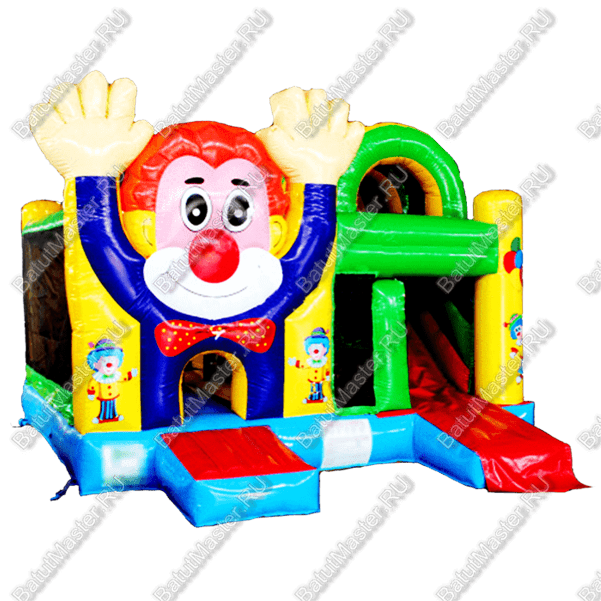 Коммерческий надувной батут «Добрый клоун» привлекает внимание детей своими яркими цветами ещё издалека. Окраска не имеет неестественных оттенков, которые могли бы не понравиться детям, вместо этого тут использованы основные «чистые» цвета.