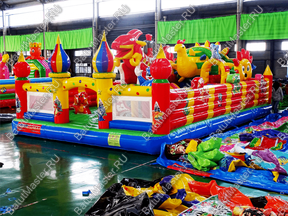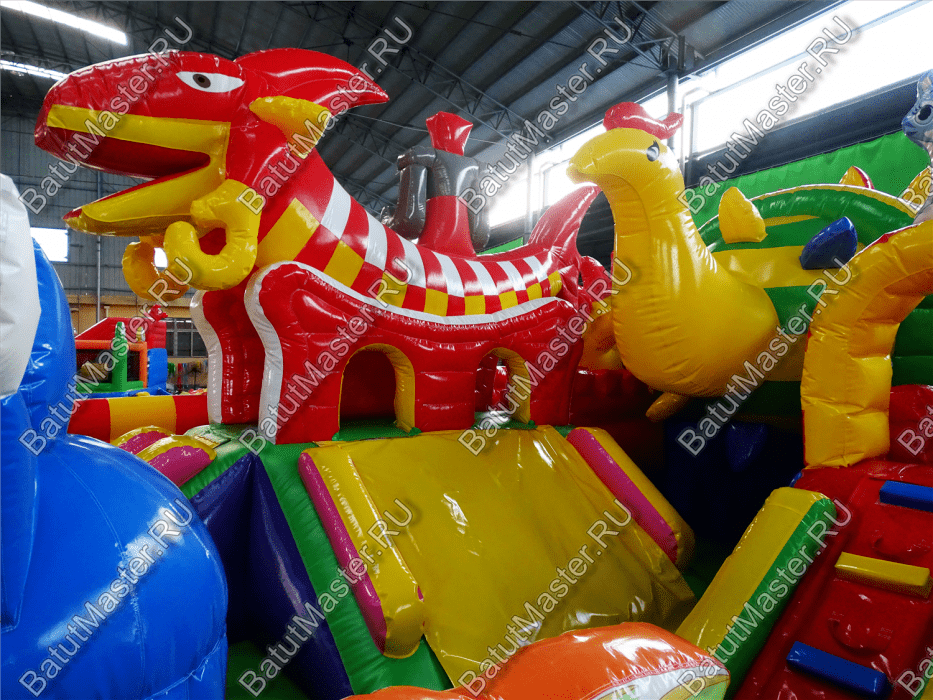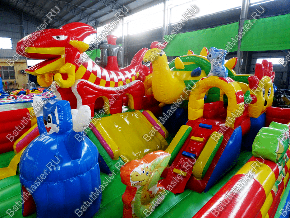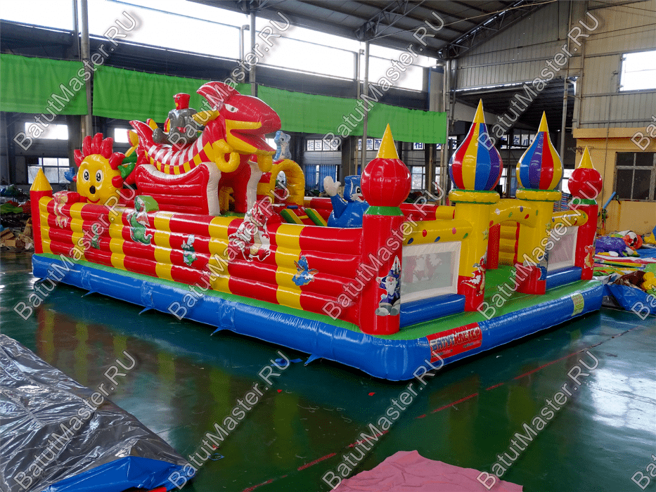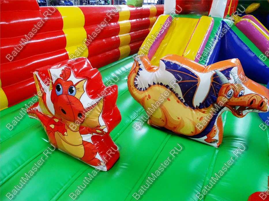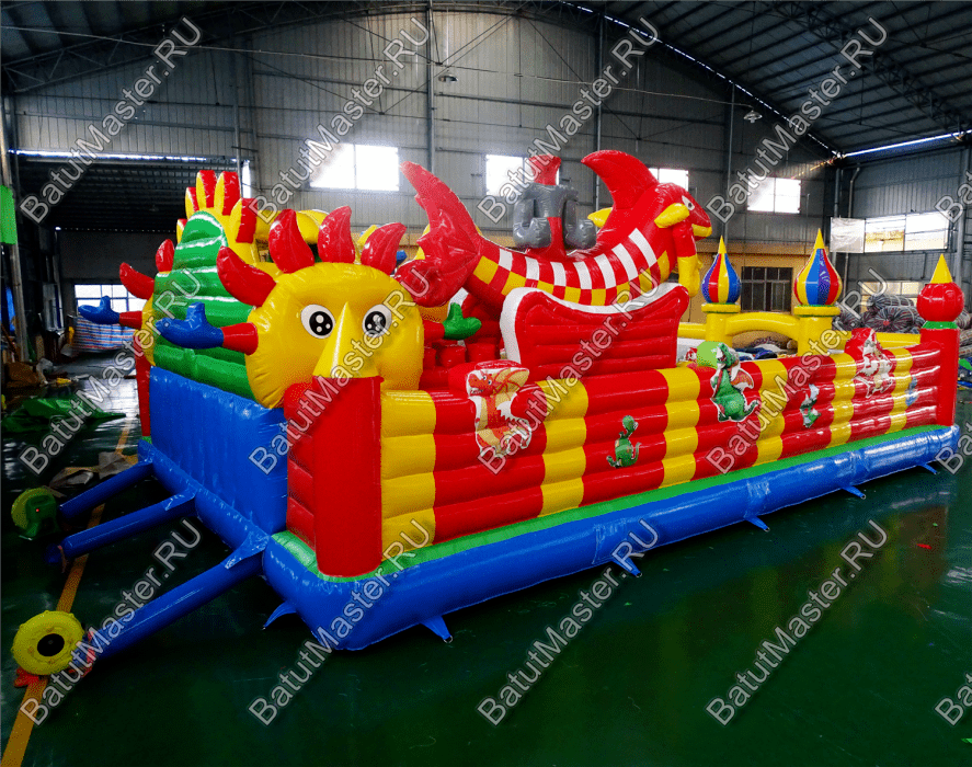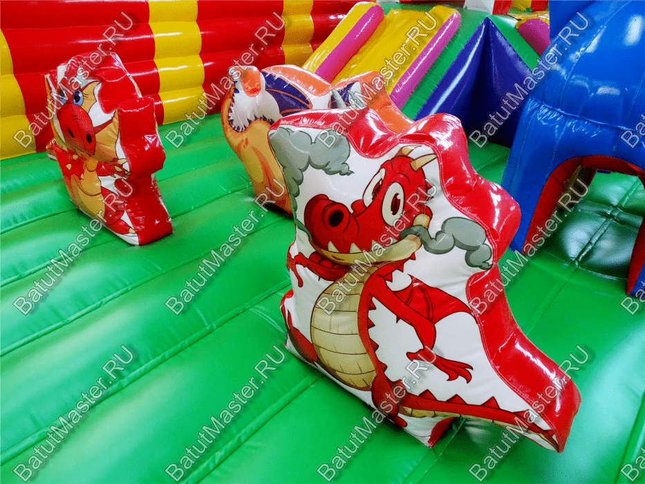 Коммерческий надувной батут «Красный дракон» является целой площадкой с различными интересными аттракционами. Отличный вариант для бизнеса, потому что каждый найдёт развлечение по душе. Тут есть множество надувных фигур в виде драконов и вертикальные груши – со всеми этими предметами можно взаимодействовать и играть. Также тут присутствуют различные конструкции: арки и горки, представляющие собой целый комплекс. Несмотря на плотность аттракционов, есть место и для бега.