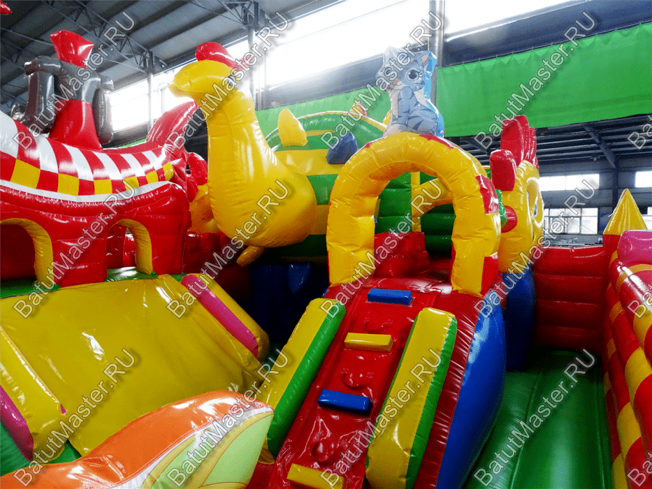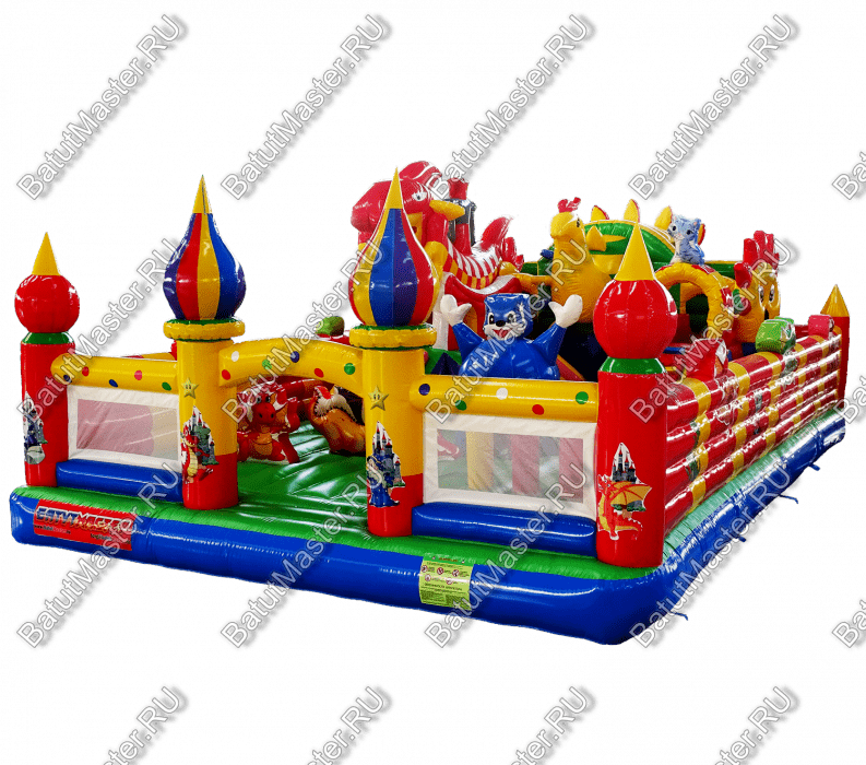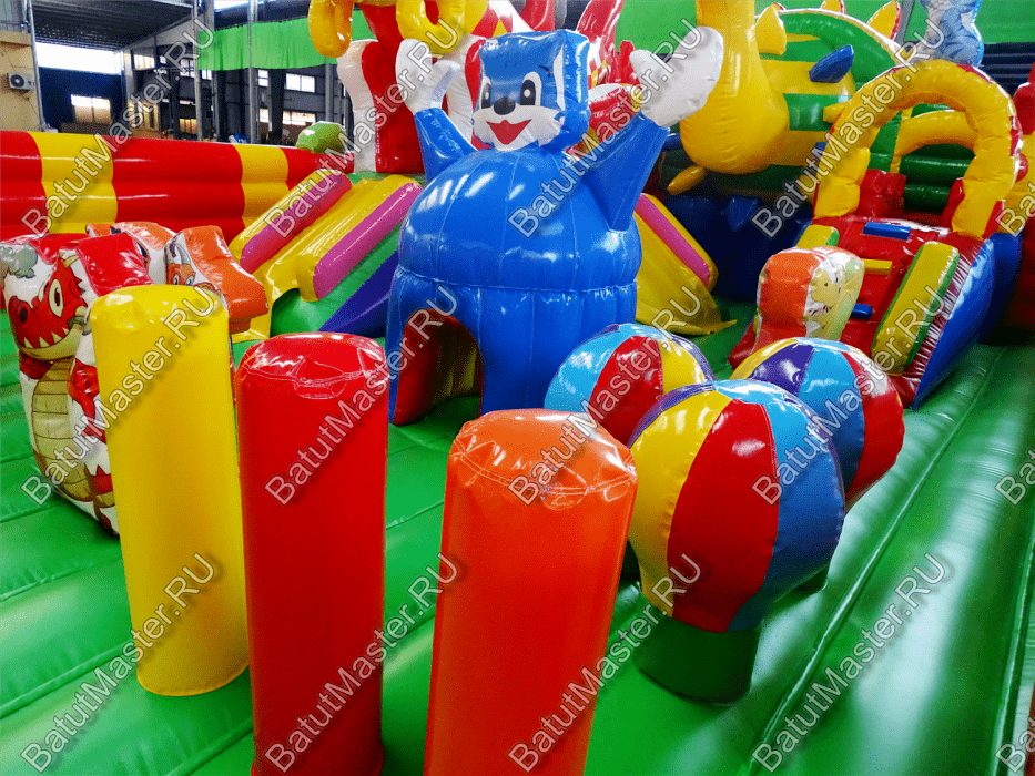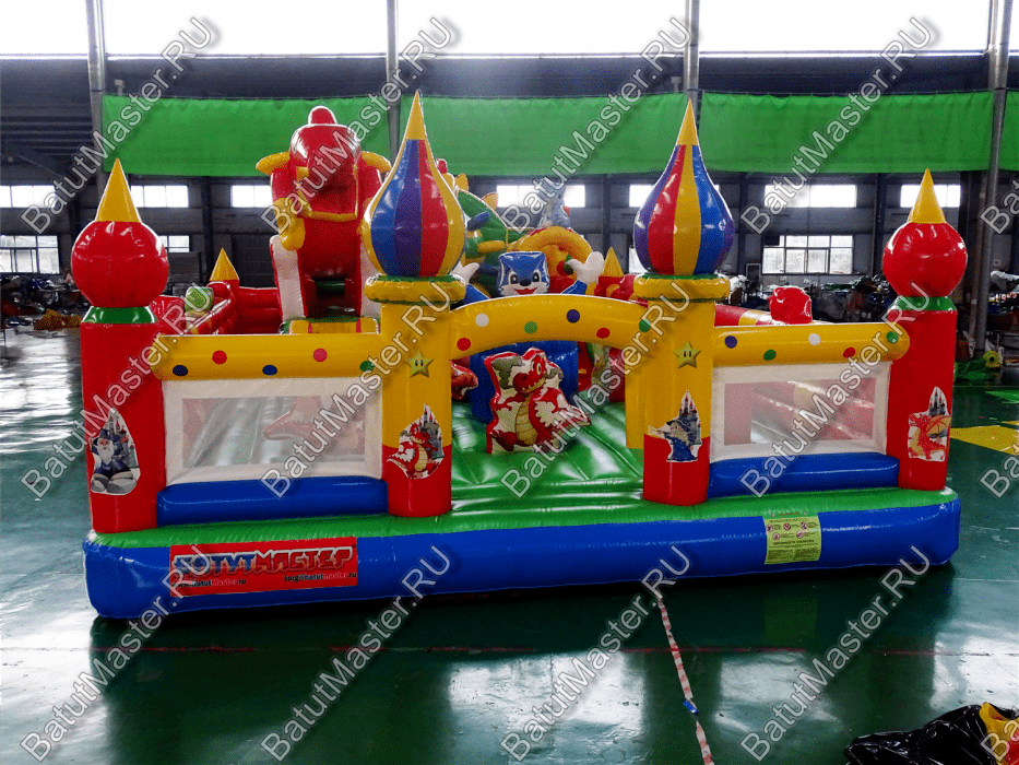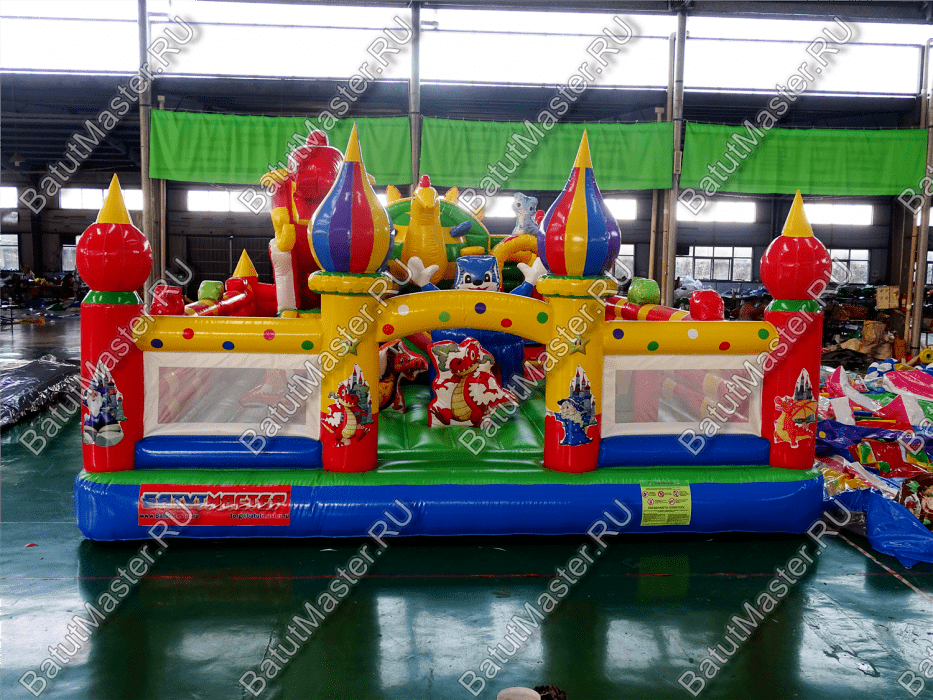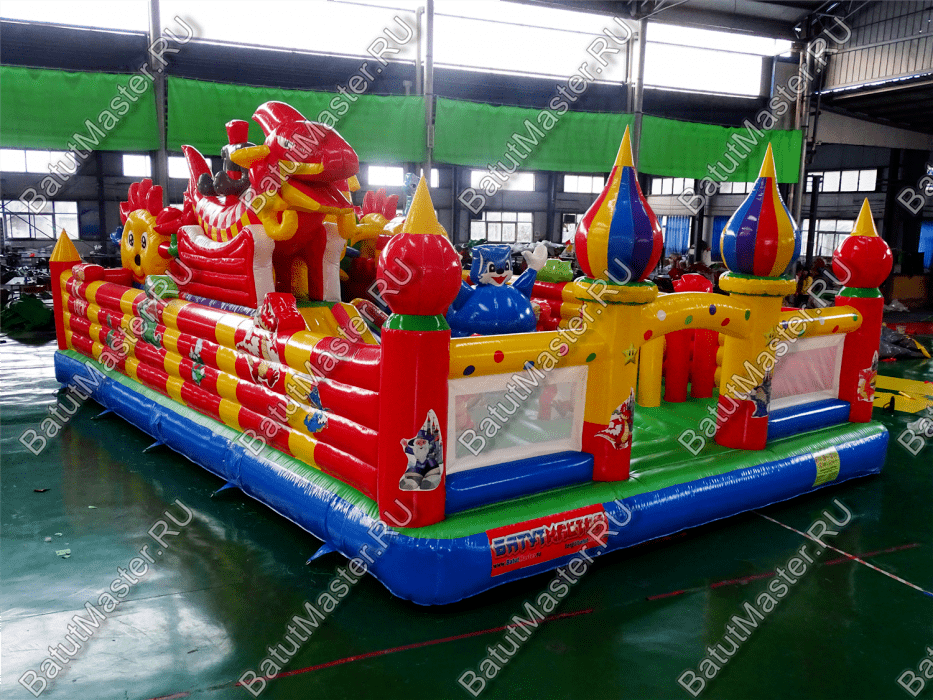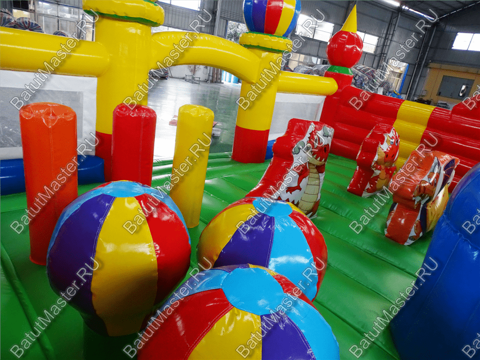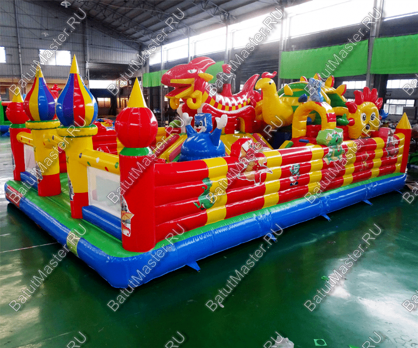 Коммерческий надувной батут «Красный дракон» является целой площадкой с различными интересными аттракционами. Отличный вариант для бизнеса, потому что каждый найдёт развлечение по душе. Тут есть множество надувных фигур в виде драконов и вертикальные груши – со всеми этими предметами можно взаимодействовать и играть. Также тут присутствуют различные конструкции: арки и горки, представляющие собой целый комплекс. Несмотря на плотность аттракционов, есть место и для бега.