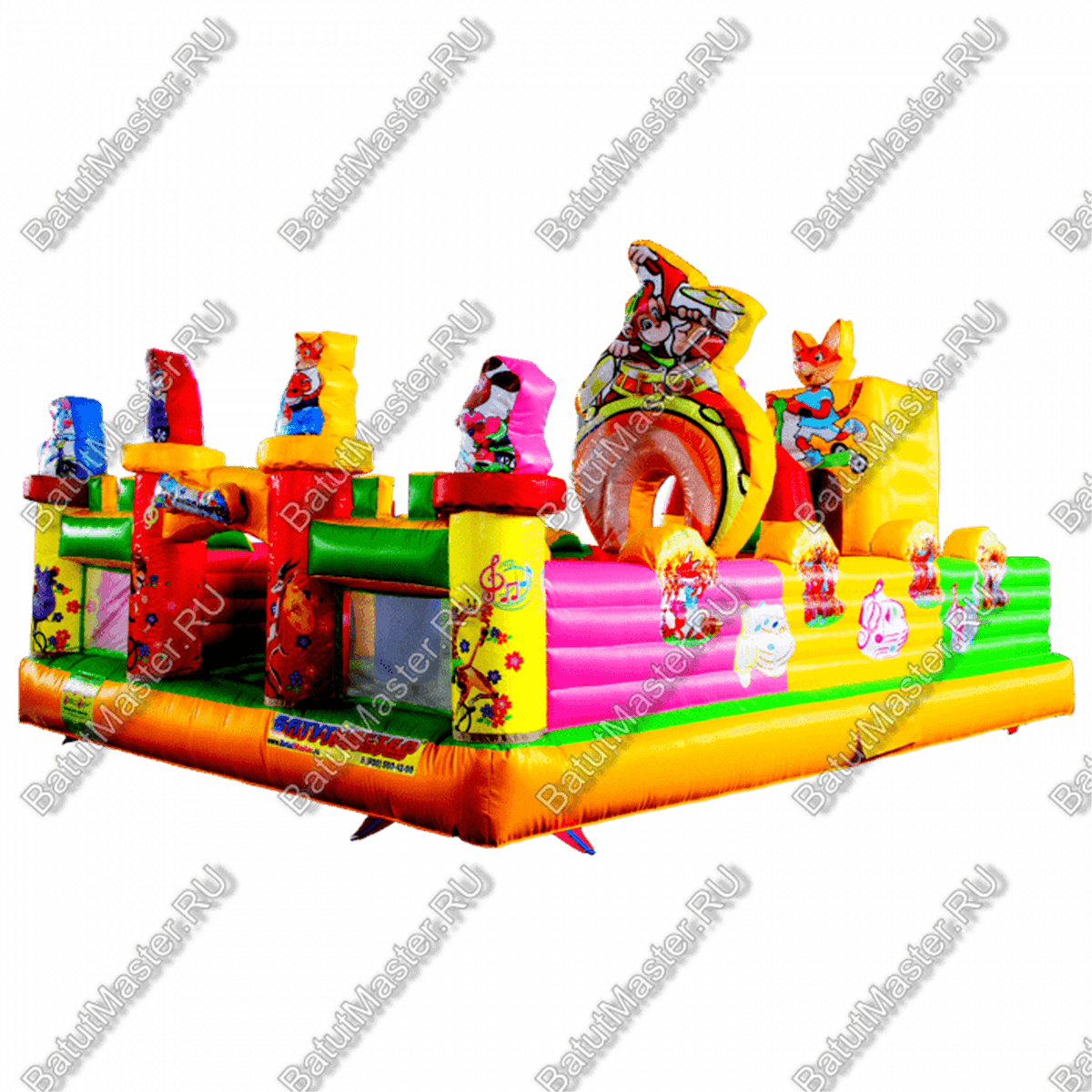 Коммерческий надувной батут «Музыка леса» будет заметен ещё издалека. К такому большому и яркому батуту захотят подойти даже взрослые, и, когда они с детьми приблизятся к батуту, уходить уже не захочется. В конструкции очень мало однотонных элементов, и каждая деталь имеет несколько цветов. Помимо ярких цветов, «Музыка леса», подобно настоящему лесу, населена различными животными. Да, они нарисованы, но для детей это не так важно, ведь их воображение тут же оживит веселых нарисованных зверят.