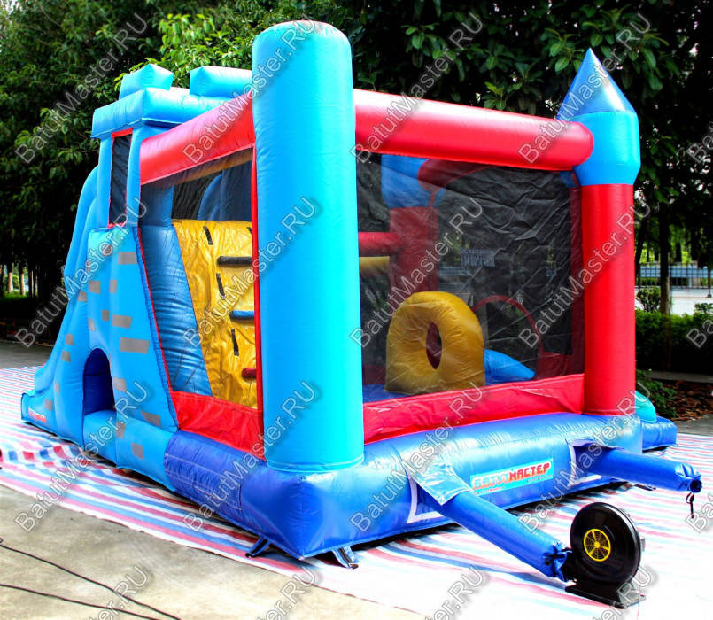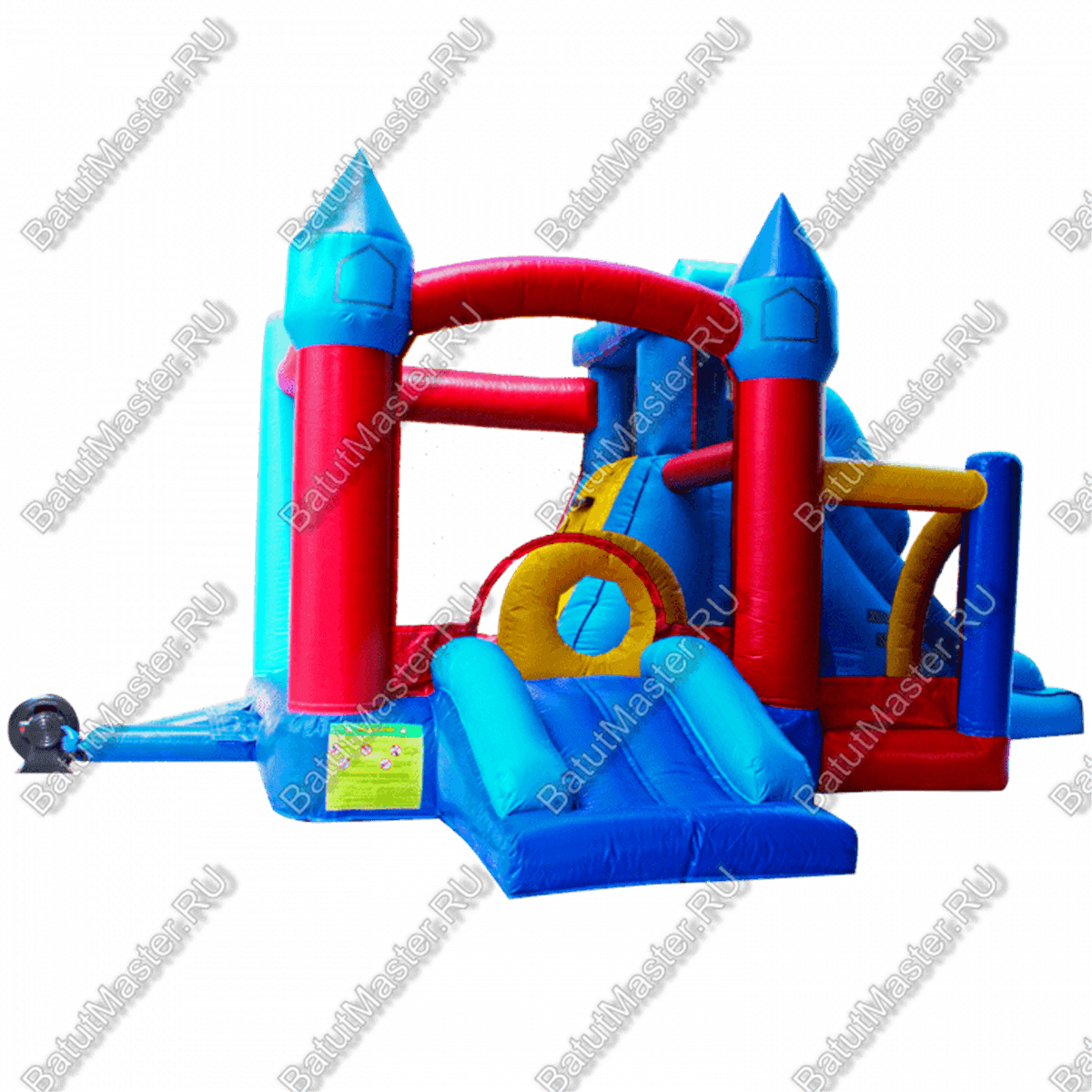 Небесный замок привлечет внимание детей и родителей не только насыщенными цветами и высокими башнями, но и функциональностью. На данном батуте есть несколько частей: платформа для прыжков с сетчатыми стенами и желтым кольцом, маленькая и большая горки, тоннель.