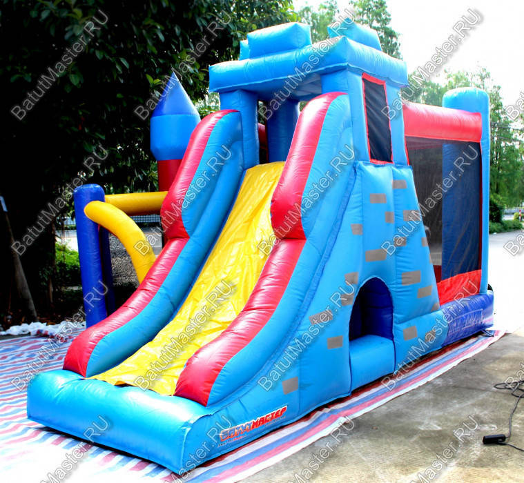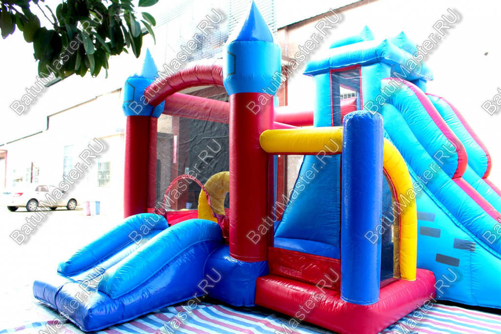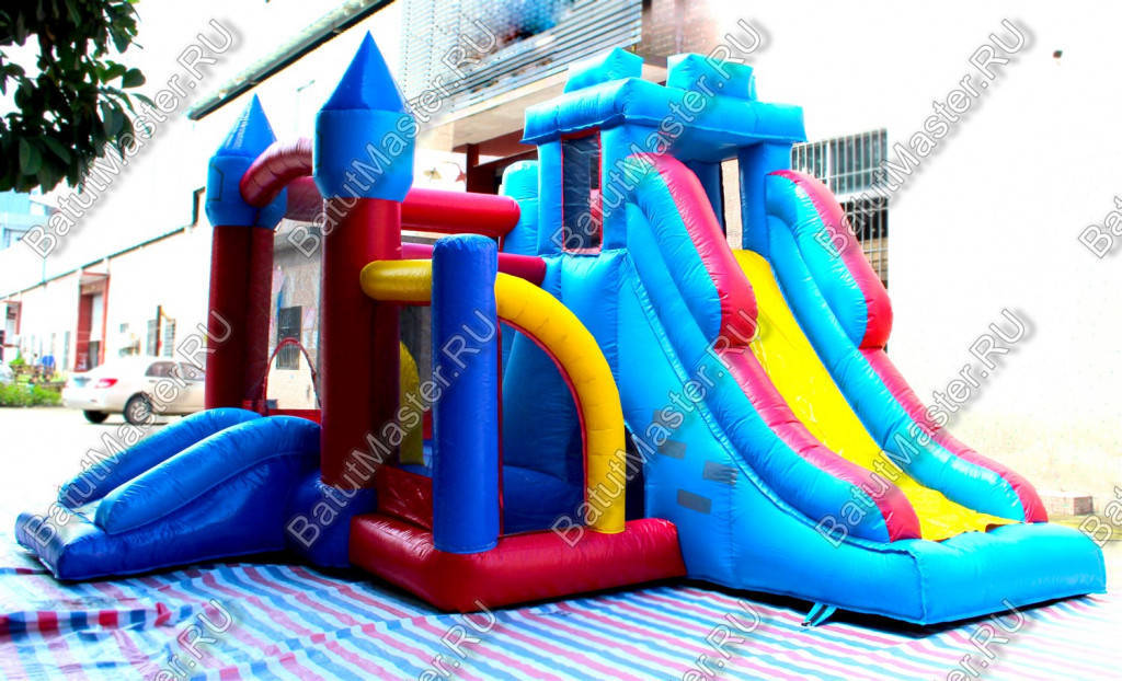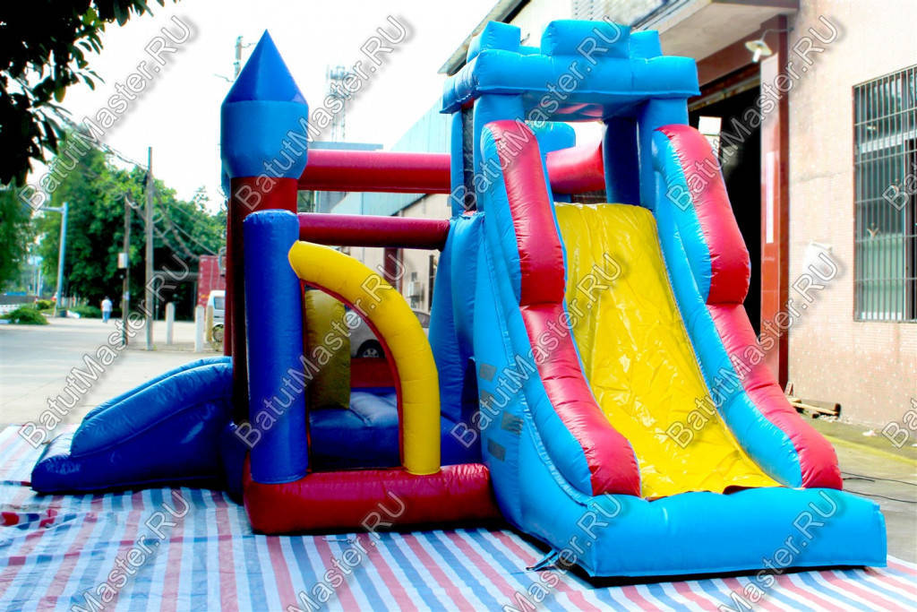 Яркий и красочный надувной мини-замок с желто-синей горкой.