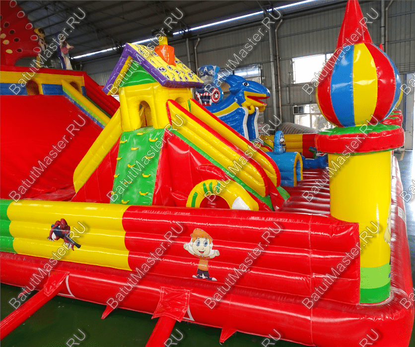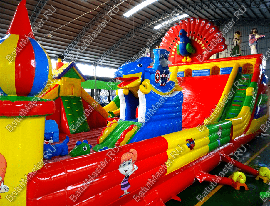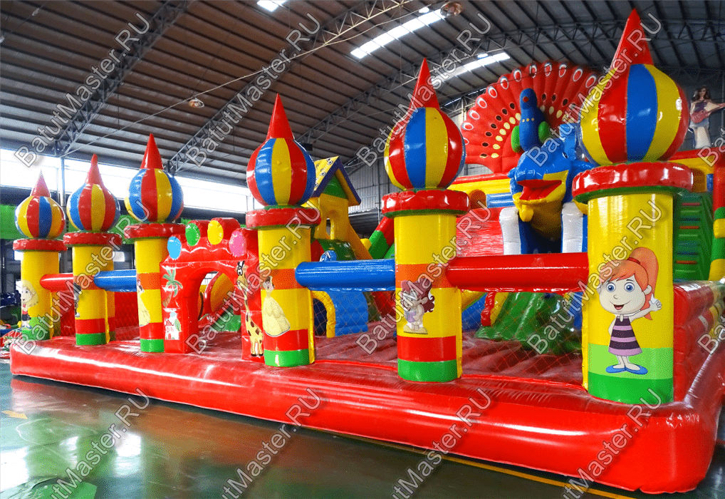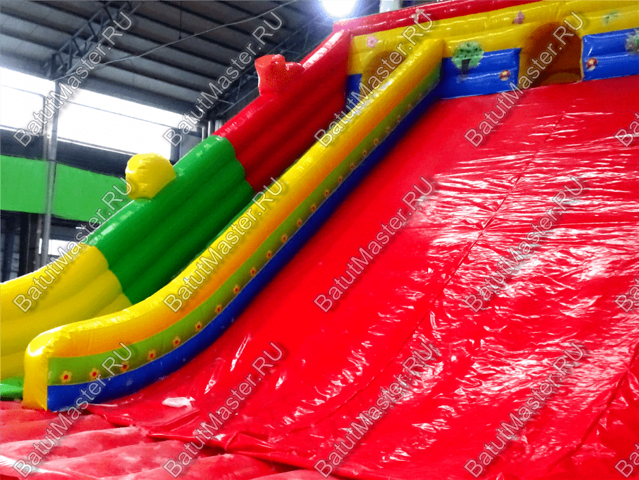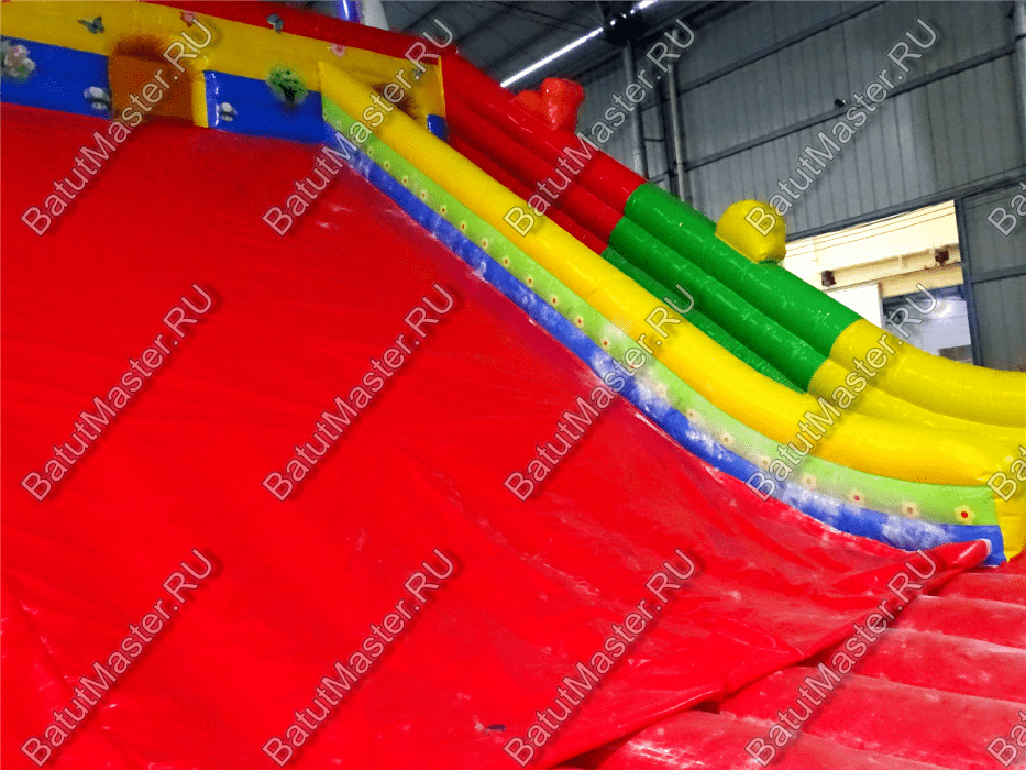 Яркий батут оснащен самыми интересными модулями, среди которых несколько горок, одна маленькая для малышей, а вторая побольше с домиком наверху и скалодромом, тоннель, животные и многие другие. В конце батута есть огромная горка и она не простая. Забравшись на нее по мягким порожкам, дети должны будут скатиться вниз, при этом можно принимать любое положение тела и спускаться всем вместе одновременно.