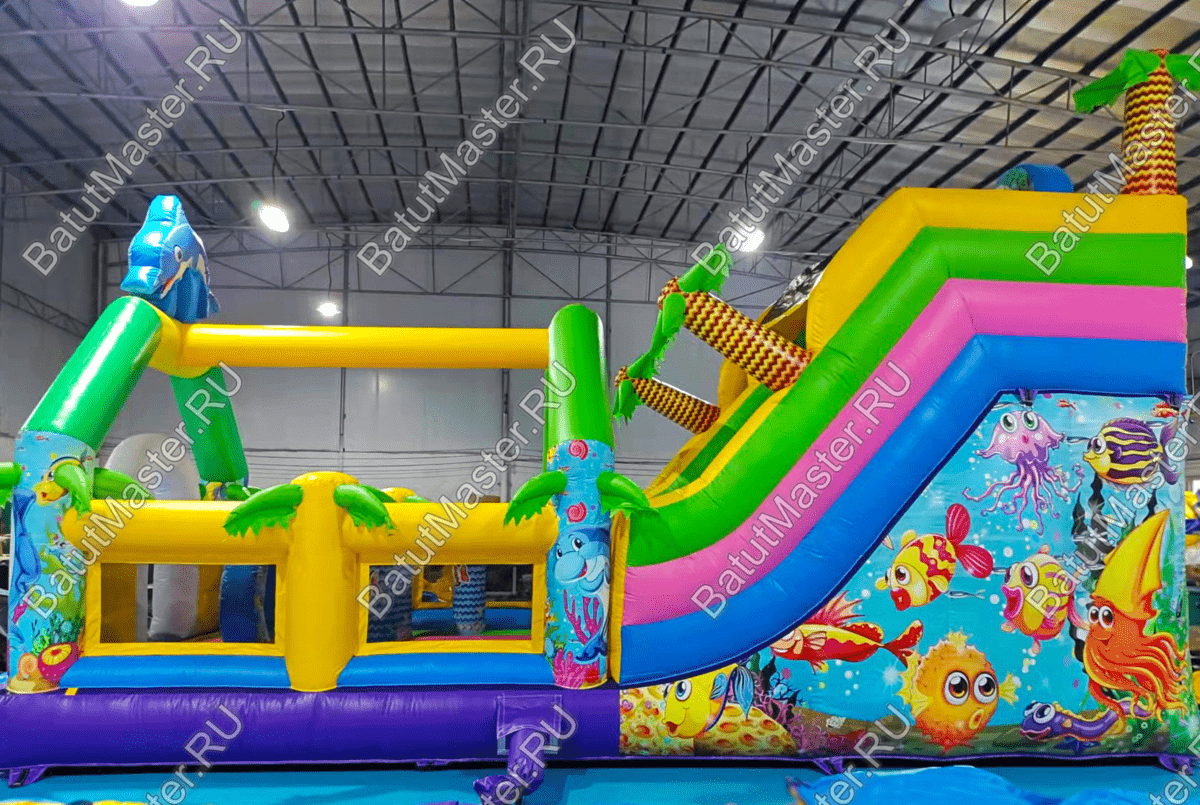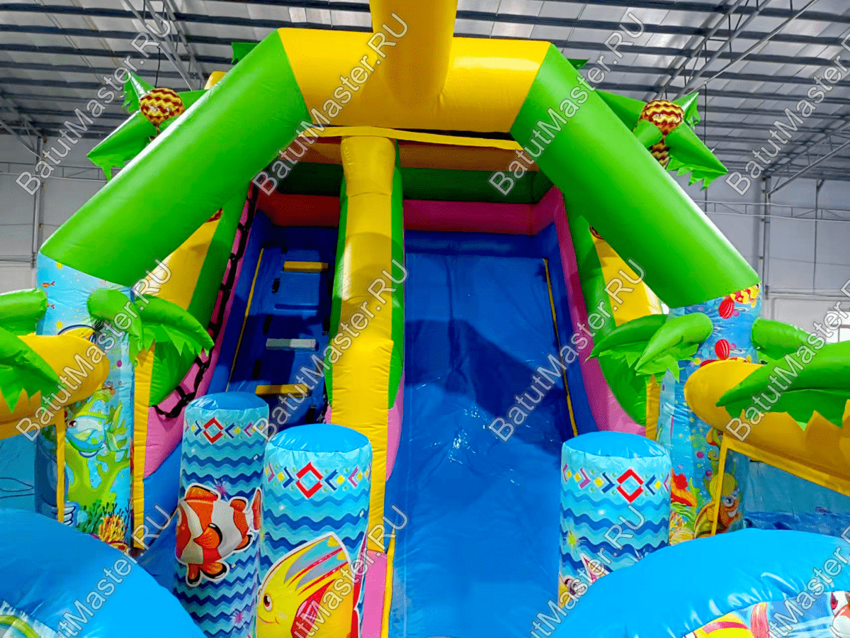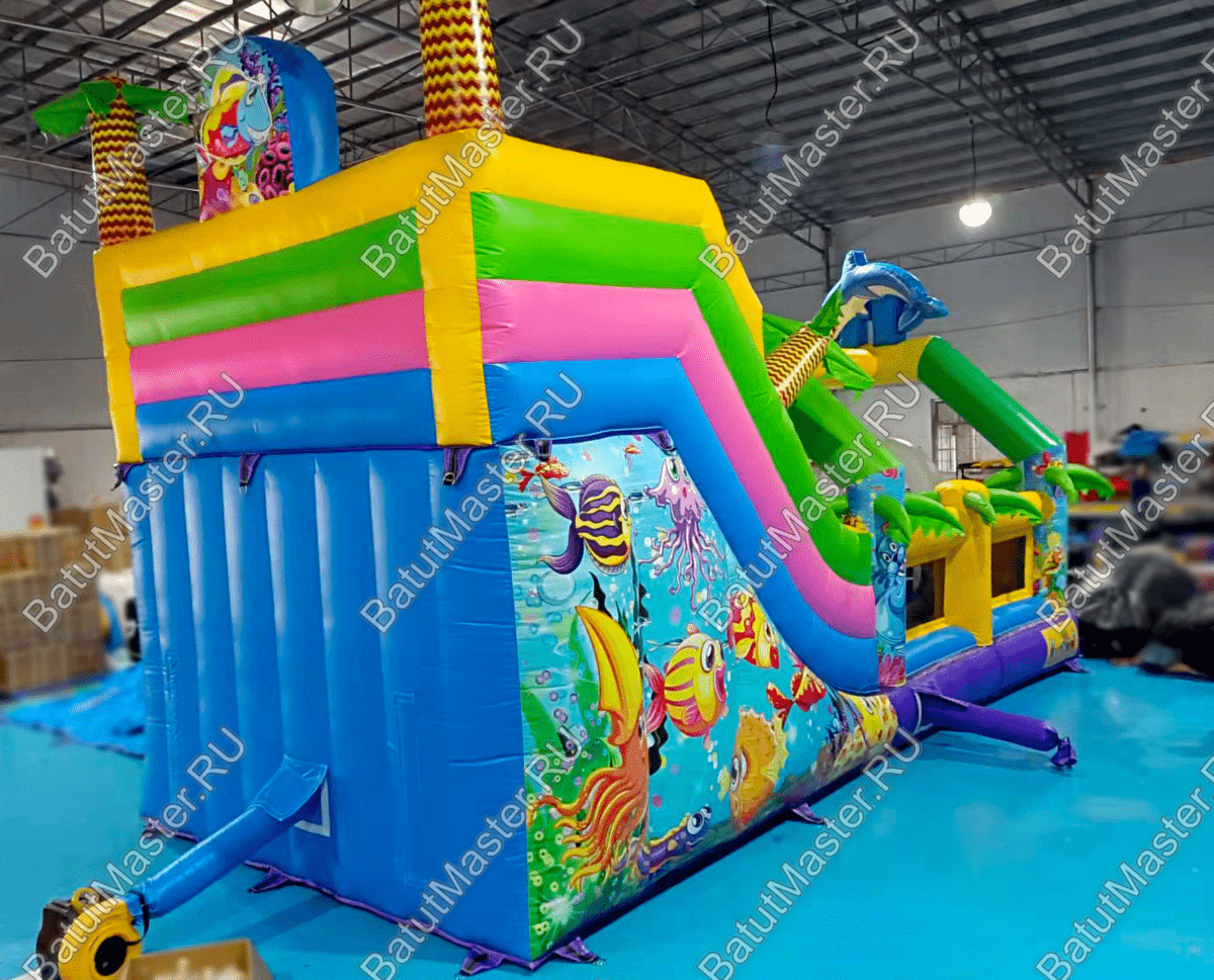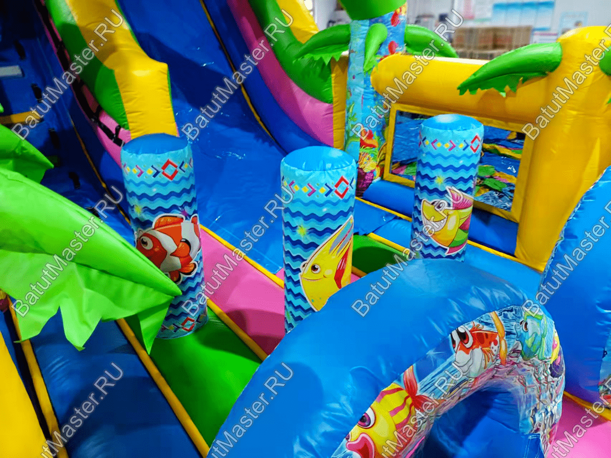 Стоит отметить, что снаружи на надувном батуте коммерческом изображен подводный мир с красивыми, разноцветными рыбками и жителями морских глубин. Сверху прямо над аркой при входе изображен забавный дельфин, а по бокам колонны с изображением морского котика и осьминога. Это хороший вариант для бизнеса.