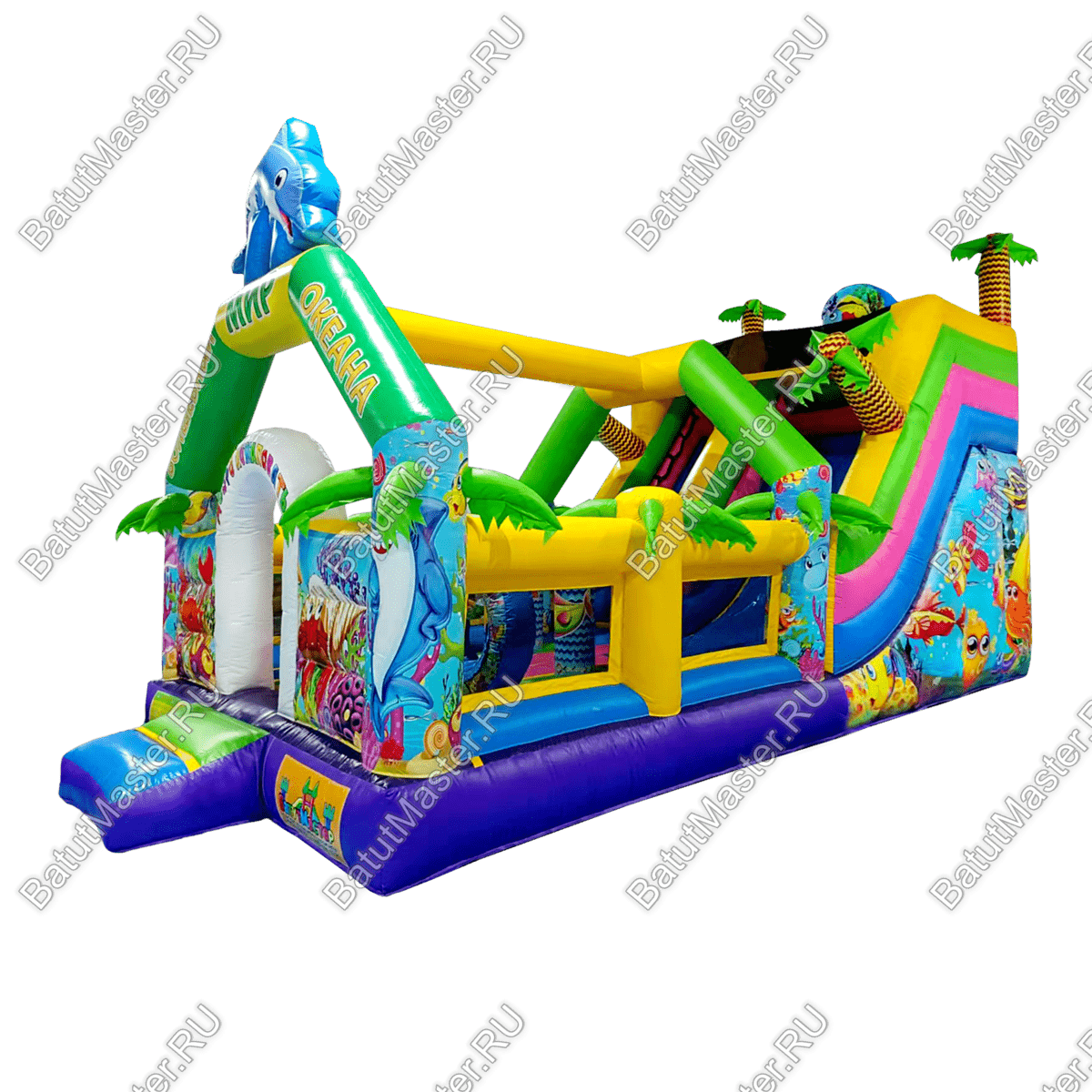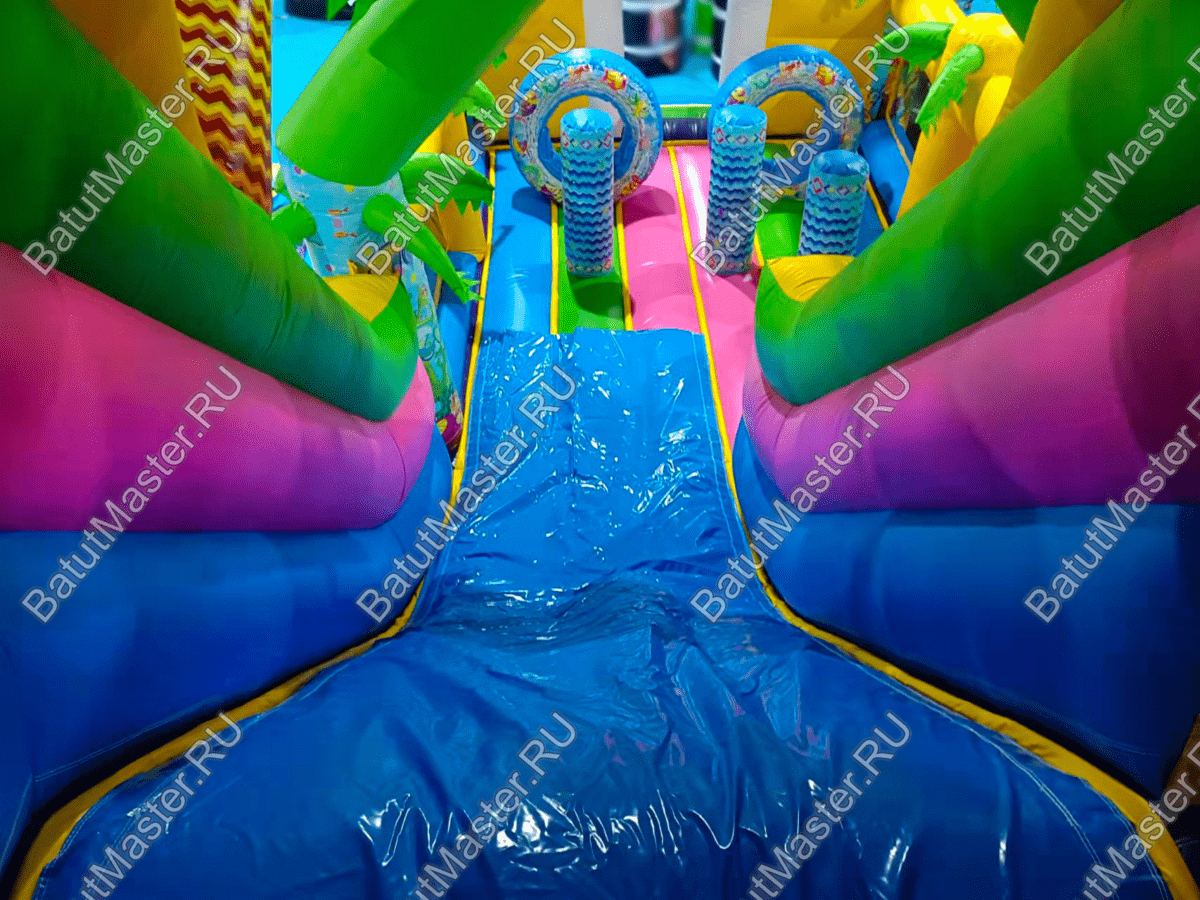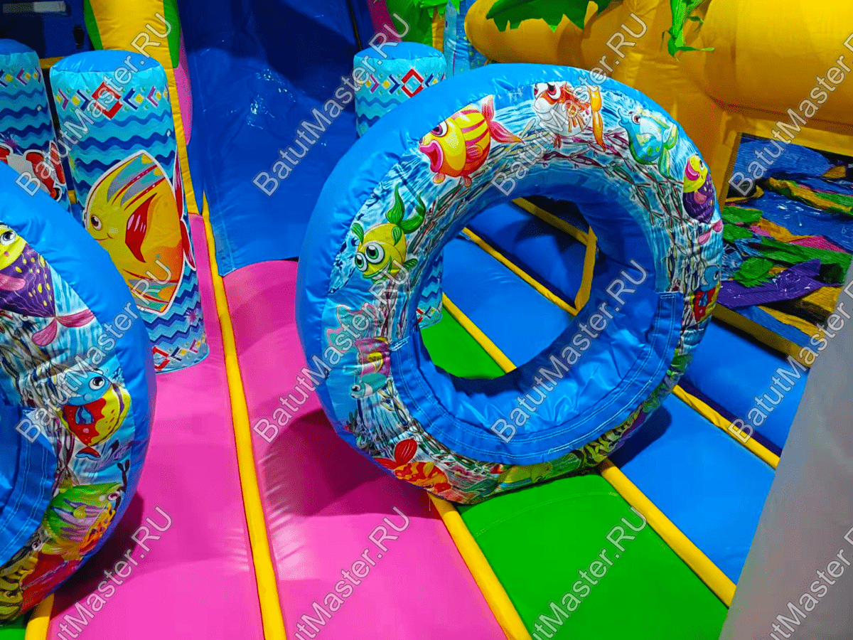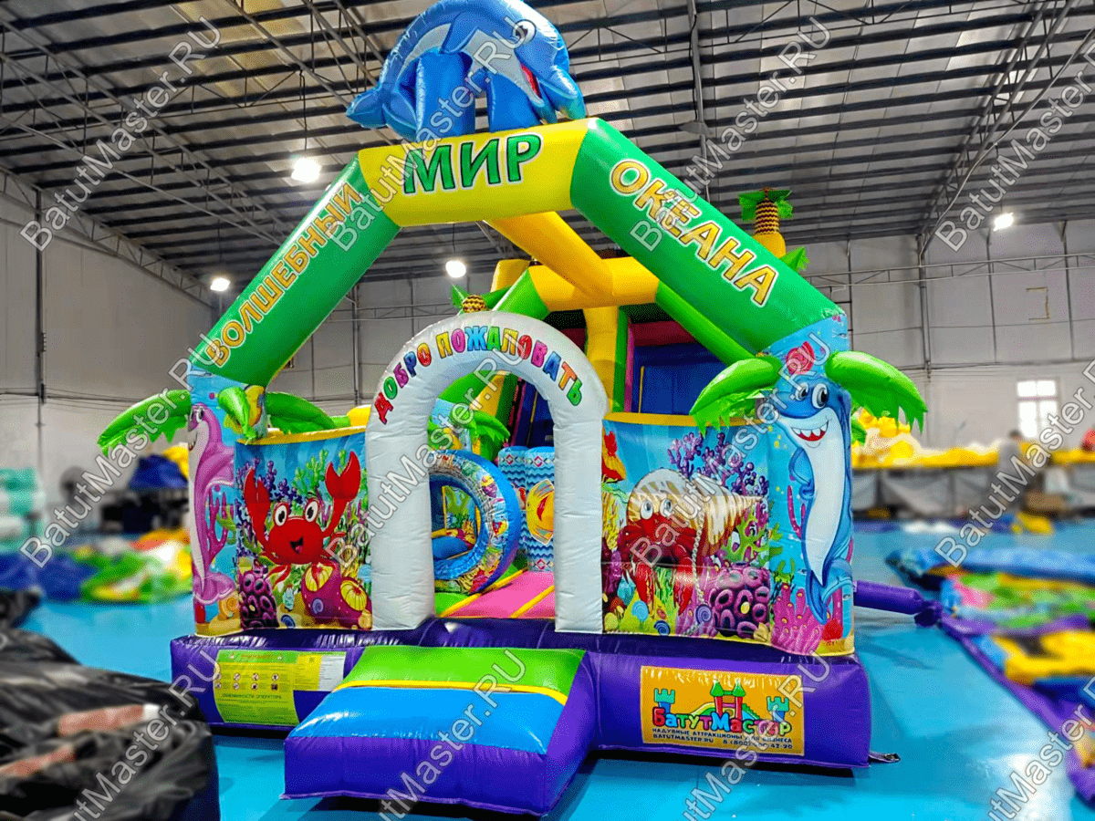 Стоит отметить, что снаружи на надувном батуте коммерческом изображен подводный мир с красивыми, разноцветными рыбками и жителями морских глубин. Сверху прямо над аркой при входе изображен забавный дельфин, а по бокам колонны с изображением морского котика и осьминога. Это хороший вариант для бизнеса.